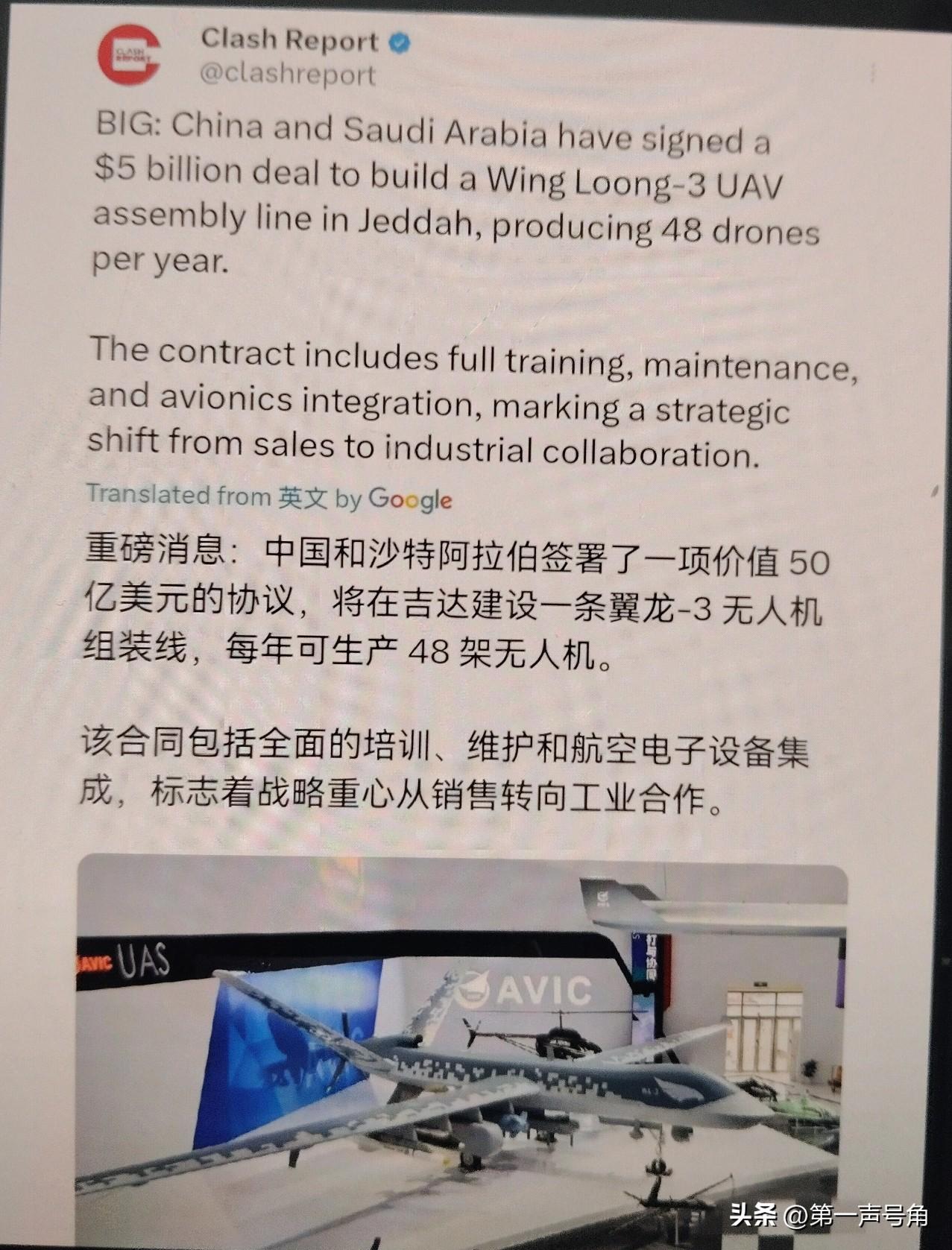 3月7日,根据外媒报道,外媒称,中国和沙特阿拉伯签署了一项价值50亿美元的协议,该协议的核心是中国将在吉达建造一条翼龙-3无人机装配线,每年生产48架无人机。该合同包括完整的培训、维护和航空电子设备集成等等。 评几句 3月7日传出的消息令人振奋:中国与沙特签署50亿美元协议,将在吉达建立翼龙-3无人机生产线,年产48架,并配套完整的培训、维护和航电集成体系。这不是简单的"卖飞机",而是中国高端军工"走出去"的里程碑式跨越。 中国军工模式升级。 过去我们出口的是整机,现在输出的是生产线+技术标准+后勤保障的全产业链能力。沙特获得的不仅是48架无人机,更是一整套自主可控的国防工业基础。这种"交钥匙工程"模式,正是美国长期垄断中东军售市场的核心打法,如今中国正式入场分羹。 近年来沙特军购多元化意图明显,既是对美国"人权外交"施压的反制,也是萨勒曼王储谋求战略自主的关键落子。选择中国无人机,性能对标"捕食者"却不受政治附加条件束缚,性价比与自主权双重拉满,利雅算的精明账。 翼龙-3生产线落户红海之滨,意味着中国军事存在从装备层面向工业能力层面延伸。这不仅是商业胜利,更是战略锚点的铺设——当沙特天空飞起"沙特制造"的中国无人机,地区安全架构的底层逻辑已在悄然改写。 结语: 这笔交易最值得关注的不只是50亿美元金额,而是它标志着中国高端制造正从"世界工厂"向"全球工业伙伴"跃迁。在无人机这个未来战场的关键赛道上,中国不仅跑赢了比赛,现在开始制定规则。