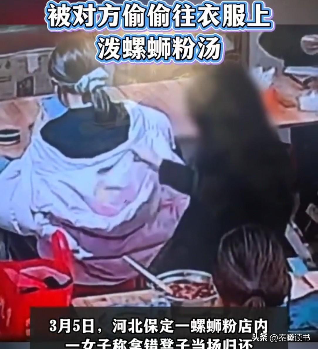 河北,一女子吃完螺蛳粉回家,发现帽子全是油污。她立刻回店调监控,一看是谁做的后,当场愣住,“怎么会是她呢?” 3月5日傍晚,河北保定一家螺蛳粉店里坐得满满当当,空气中飘着浓郁的酸辣味。 王女士刚进店,就看中了一张空桌子,只是桌边少了把凳子,她便随手从旁边拉了一把过来坐下。 没吃几口,旁边一名黑衣女子突然开口:“谁拿了我的凳子?” 王女士回头一看,立刻反应过来,自己拉的正是对方占好的凳子。 “不好意思,真是太不好意思了!”王女士赶紧起身,一边连连道歉,一边把凳子推回原位,“我以为这位置没人,就把凳子拿走了,没看仔细。” 她怕再起争执,还立刻喊来服务员,让帮忙另找一把凳子,全程客客气气,两人之间也没有发生争吵。 本以为这事就这么过去了,可王女士低头专心吃粉时,却没发现身后的暗流。 那位黑衣女子表面上一脸平静,手里却悄悄拿起喝汤的小勺,一次次舀起滚烫的红油螺蛳粉汤,趁人不注意,精准地倒进王女士挂在椅背上的羽绒服帽子里。 她的动作十分隐蔽,舀汤、倾倒、放下勺子,一气呵成,做完这一切后,还像没事人一样继续吃粉,仿佛刚才的恶意从未存在。 王女士吃完饭后,拎着东西就回了家。直到准备收拾衣服时,她才发现羽绒服帽子里黏糊糊的,全是油污,散发着刺鼻的螺蛳粉汤味,好好的一件衣服彻底被毁掉了。 她又气又纳闷,赶紧返回螺蛳粉店,请求老板调取监控。当看到监控里的画面时,王女士当场愣住,难以置信地喃喃自语:“怎么会是她呢?” 那个看似已经和解、表面平静的黑衣女子,竟然用这样隐蔽又恶劣的方式,报复了一次无心的误会。 目前,王女士已经报警,等待进一步的处理。 一把凳子本是小事,道歉归还已是解决,却被人暗中用热汤报复,实在让人寒心。生活里难免小摩擦,多点包容和大度,才是做人的底气。心若窄小,处处是矛盾;心若宽广,事事皆平安。