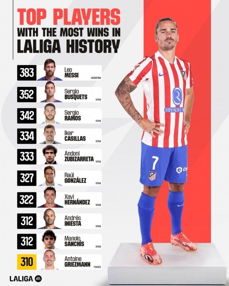 西甲历史胜场排名:梅西383胜居首,格列兹曼310胜跻身前十