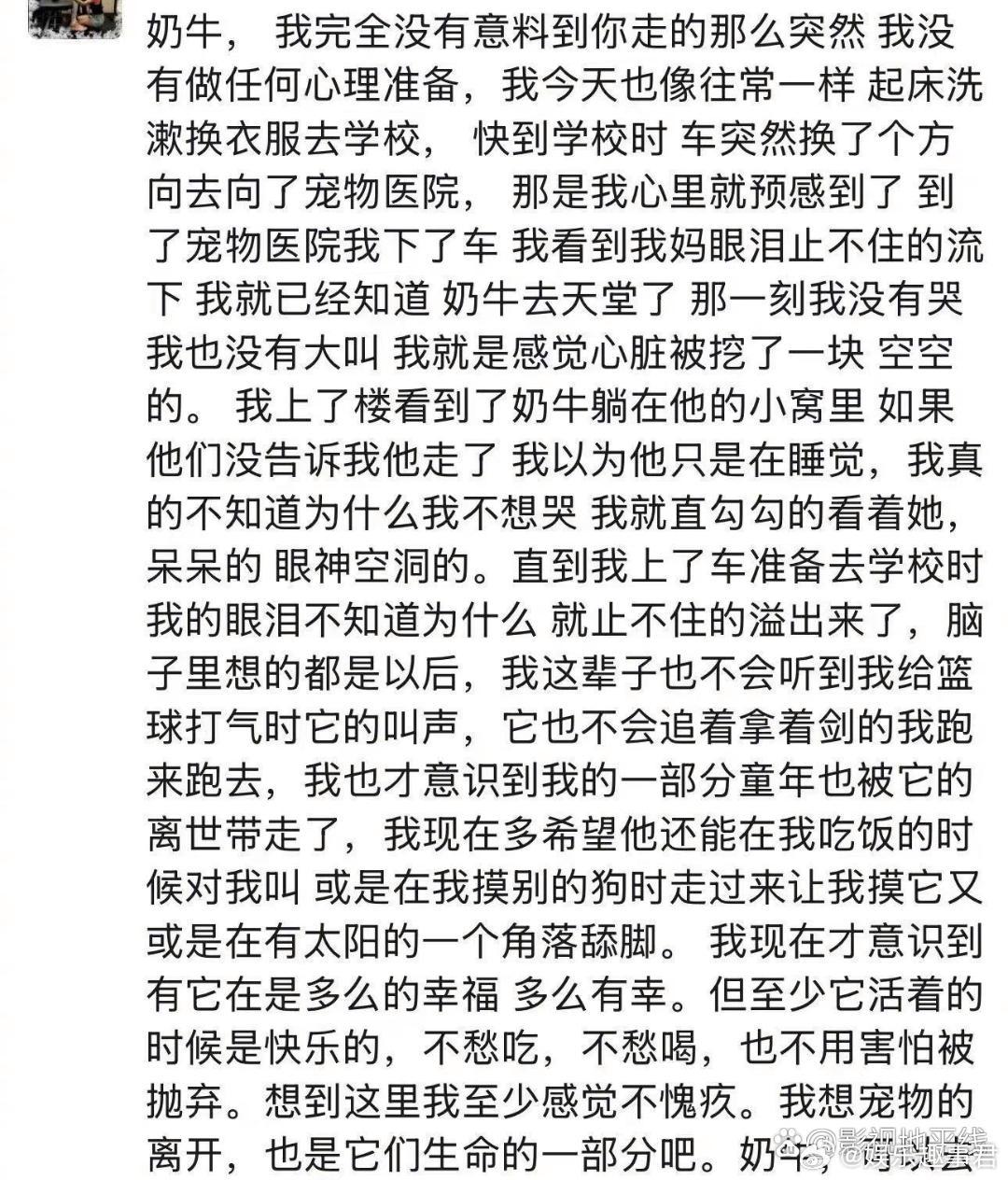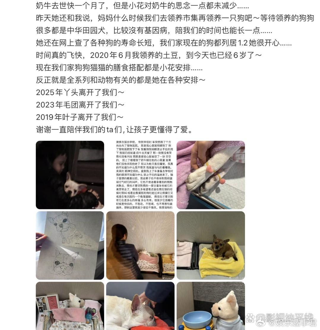 孙俪家的小狗奶牛去世了8日,孙俪发文透露家里的小狗“奶牛”一个月前去世了,等等为奶牛写了一篇日记,小花选了两个爱心皮筋戴在了奶牛的手上,每天放学回到家还会捣鼓一下奶牛的床,看到奶牛的骨灰拿回家痛哭。孙俪说谢谢一直陪伴ta们,让孩子更懂得爱。