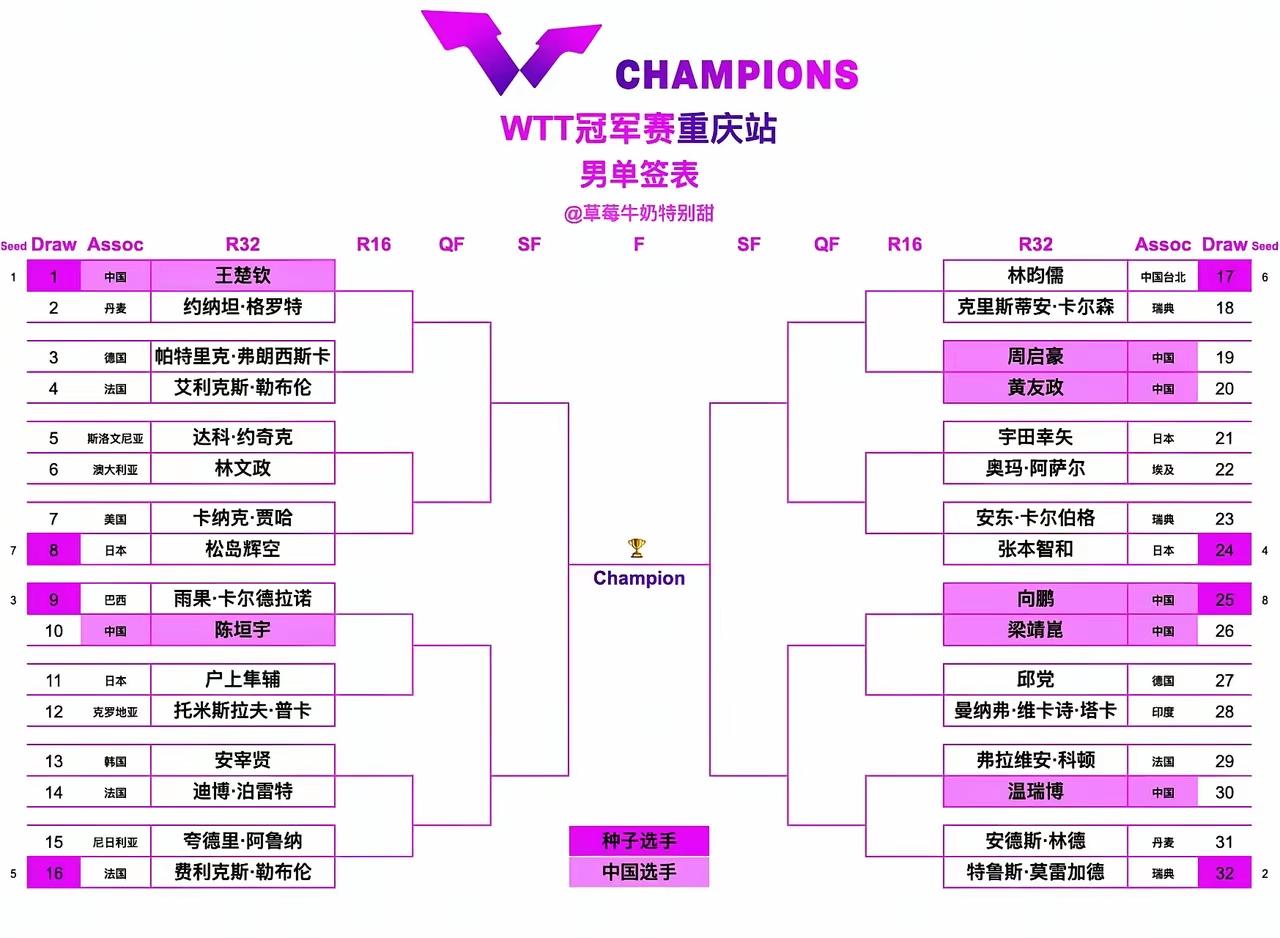 国乒男队的签位真的是一言难尽,女队曼昱还会遇到美和吗? 梁靖崑休息两大赛事后复出重庆冠军赛,第一轮就是内战,对手是向鹏,淘汰谁我们心里都不是滋味。 关于内战,无独有偶,周启豪首轮将迎战队友黄友政,又要淘汰一位,真寸。 陈垣宇和雨果不是冤家不聚首,这次俩人又碰上了,新加坡大满贯小陈淘汰了对手,希望小陈重庆冠军赛延续新加坡的好运。 美和第一轮遭遇队友长崎美柚,如果非常熟悉美和的长崎战而胜之,曼昱这次就不用打美和了。 签位重要也不重要,重要的是实力,国乒男女队加油哦!