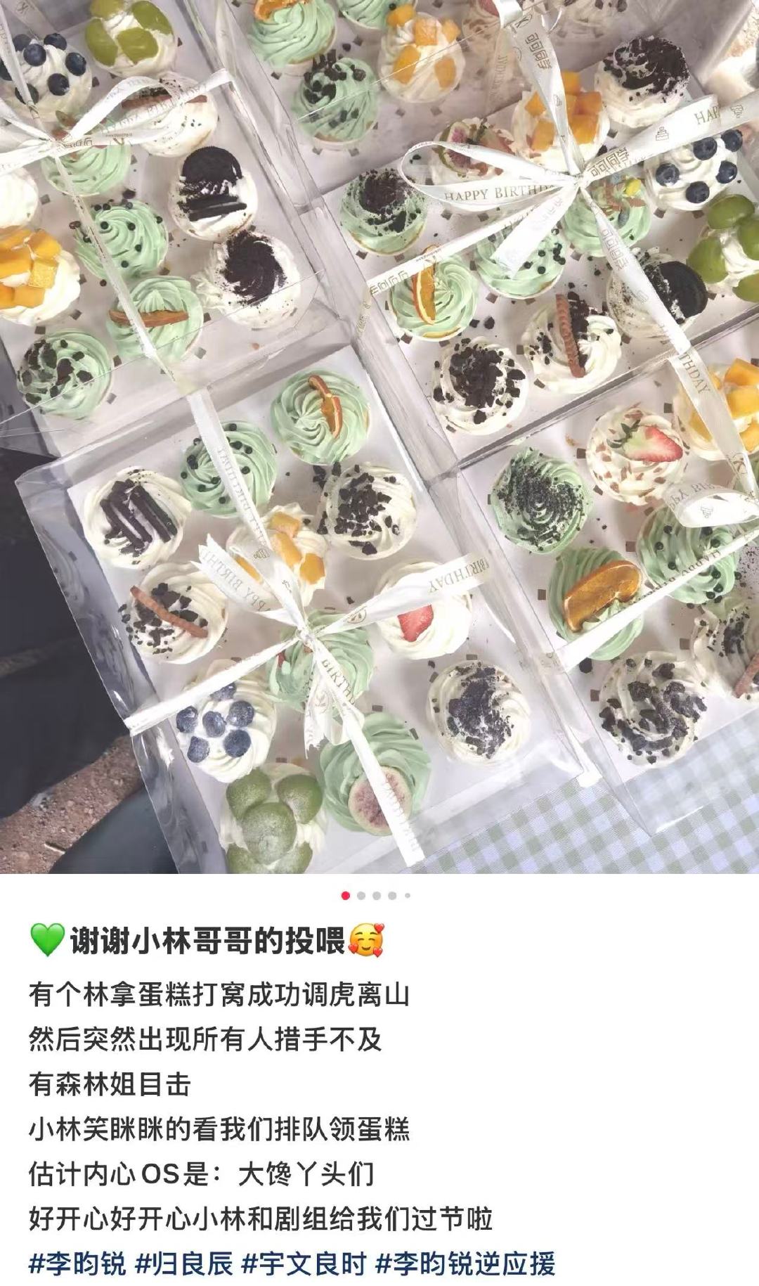 李昀锐给粉丝过妇女节李昀锐请粉丝吃蛋糕 3月8日,有粉丝在社交平台分享,小林和剧组给粉丝过妇女节,请粉丝吃小蛋糕。
