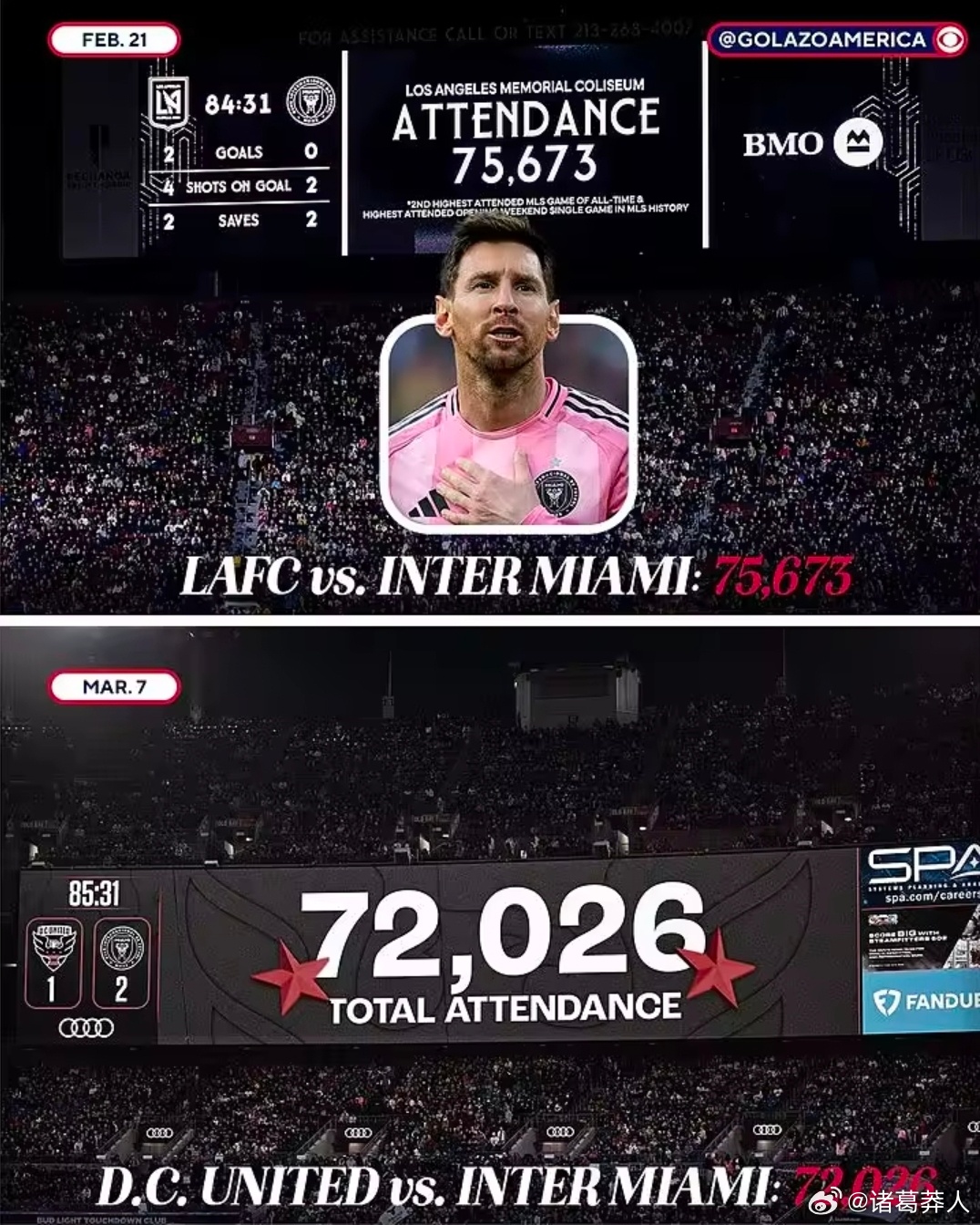 梅西效应!迈阿密国际新赛季前两个客场均创下上座人数新高。美职联常规赛第二轮,迈阿密国际客场2-1战胜华盛顿联,德保罗和梅西各入一球。72026名观众现场观战,刷新巴尔的摩MT银行体育场上座纪录,该球场同时是NFL巴尔的摩渡鸦队主场。揭幕战客战洛杉矶FC,迈阿密国际也打破纪录,到场75673名球迷。足球