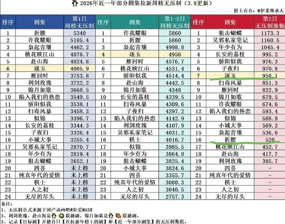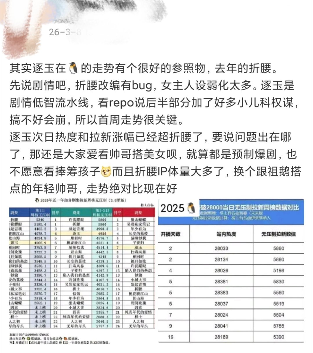 网友分析,《逐玉》在联播的情况下,为什么🐧次日热度和拉新涨幅就已经超过了宋祖儿 刘宇宁《折腰》