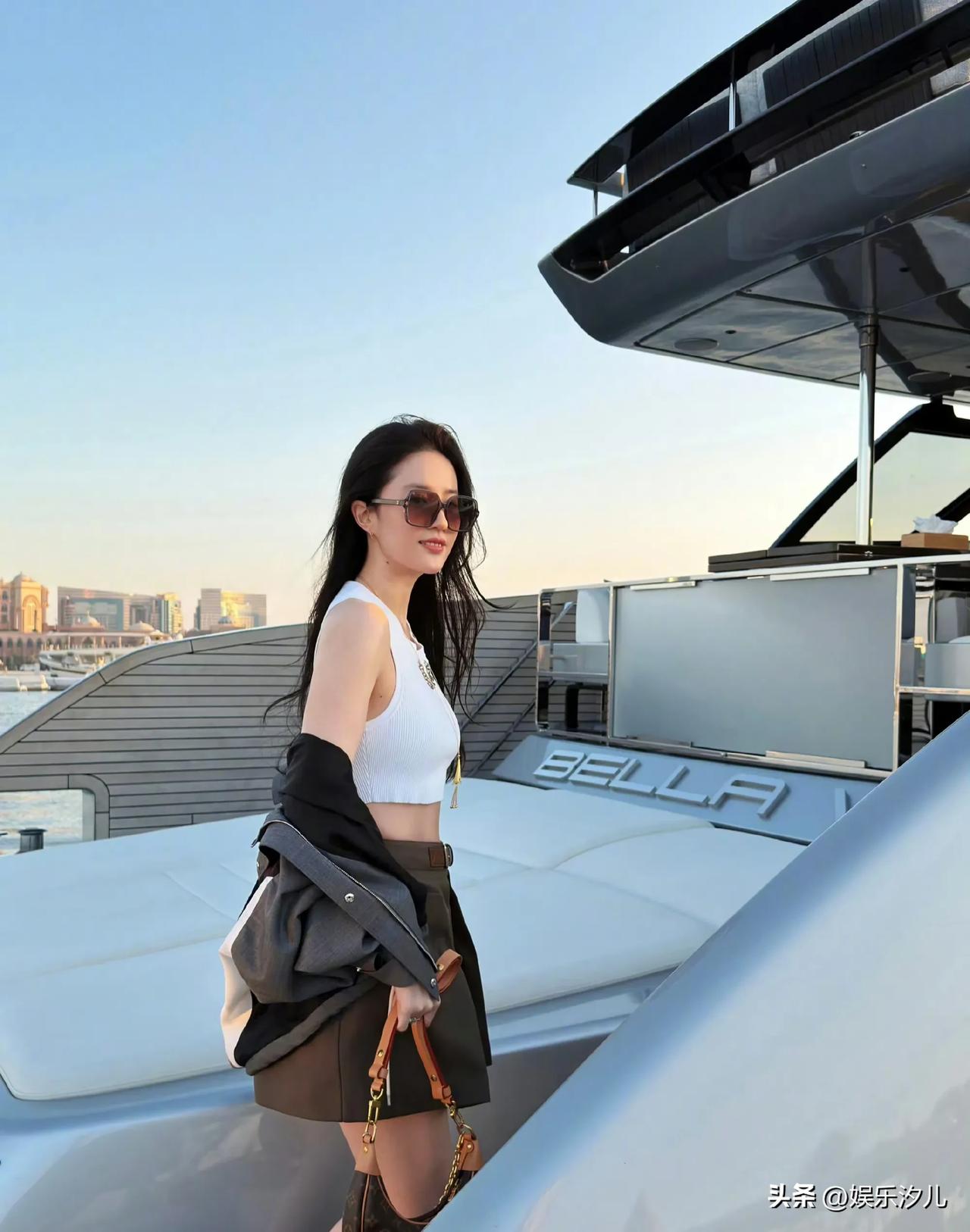 刘亦菲这条裤子挺养生,毕竟降温了肚脐眼必须护住啊