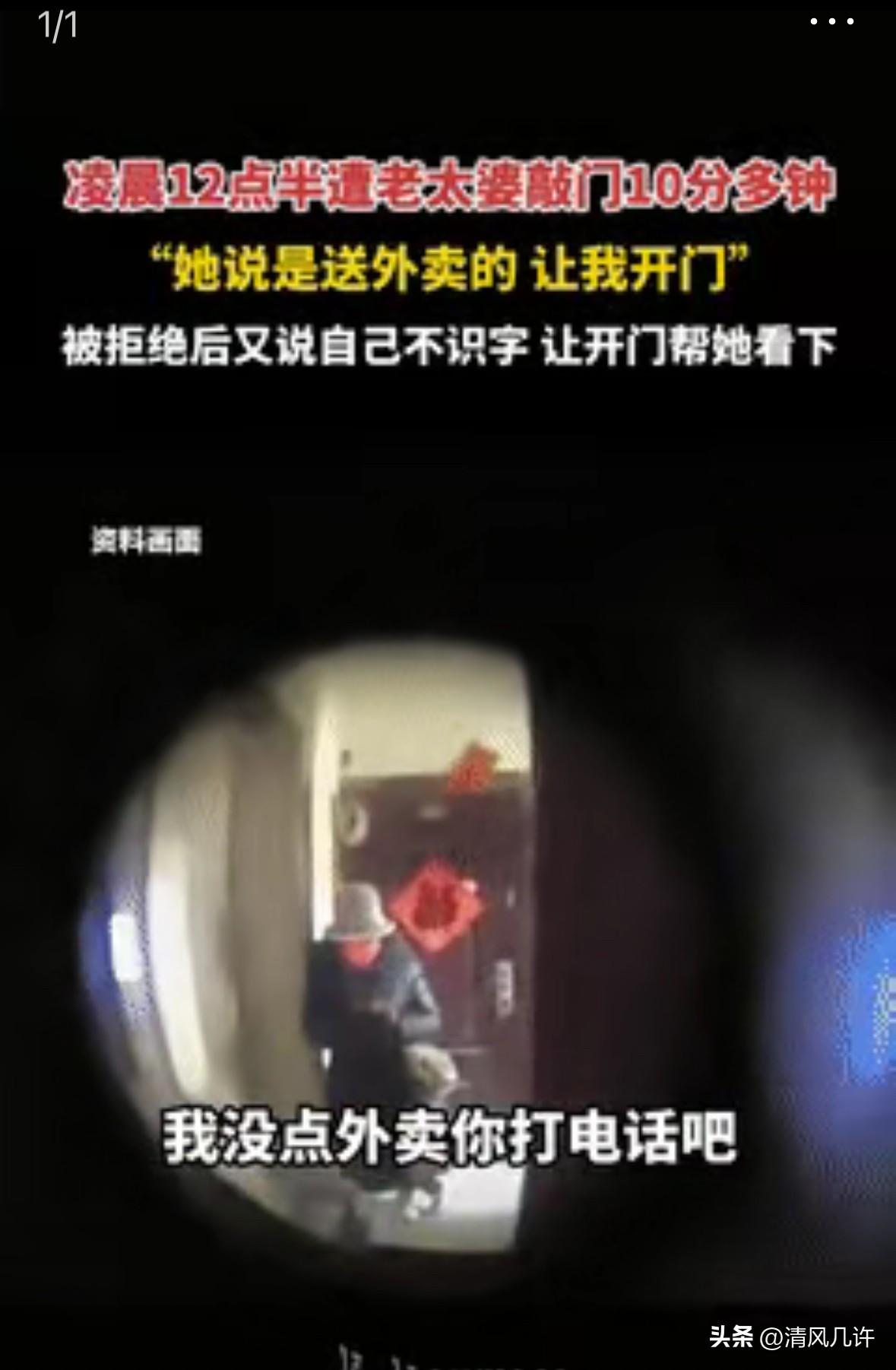 “这是真吓人!”四川德阳,一女生半夜听到有人敲门,老太自称是送外卖的,可女生并没点外卖,她透过猫眼,发现老太手里并没拿东西,于是拒绝开门,谁料,老太坚持让女生开门,女生置之不理,而老太接下来的一句话,让女子很是后怕,网友:三更半夜老太送外卖,怎么想都不对! 事发当天是深夜十二点半,女生刚结束加班回到出租屋不久,洗漱后正准备躺下休息。 密集的敲门声突然响起,节奏又急又重,打破了深夜的安静。女生瞬间绷紧神经,独居的她第一时间摸向了床头的手机,同时缓步走到门边,没有发出任何声响,只透过猫眼向外观察。 门外站着的是一位老太,身形佝偻,穿着宽松的外套,手里空空如也,既没有外卖箱,也没有常见的外卖包装袋。老太的声音隔着门板传进来,带着几分急促:“开门,送外卖的!”女生立刻回应,语气带着警惕:“我没点外卖,你是不是找错门了?” 本以为这样的回应能让老太离开,没想到敲门声反而没有停止,力度甚至比之前更大。 老太的声音依旧执着:“没错,就是这个门,你先开门,外卖在我手里拿着呢!”女生再次看向猫眼,老太的双手始终垂在身侧,根本没有拿取任何物品的动作。她心里的不安愈发强烈,索性不再回应,只站在门后,紧紧握着手机,随时准备按下报警电话。 僵持了几分钟,敲门声稍缓,老太的语气突然变了,带着几分恳求:“姑娘,我不识字,手机上的地址我看不清楚,你开开门,帮我看看是不是这个地方。”这句话让女生瞬间后背发凉,深夜独居,对方的身份和目的都不明确,开门意味着什么,她不敢想象。 女生依旧没有开门,只是对着门板高声说:“你可以打电话给点餐的人,让对方给你发定位,或者找小区保安帮忙,我不能开门。” 老太听到这话,明显有些不耐烦,又开始用力敲门,嘴里反复念叨着让女生开门帮忙,这样的状态持续了十多分钟。 女生始终坚守着底线,期间她悄悄打开了屋内的监控,把门外的画面全程记录下来,同时拨通了小区物业的电话,说明情况后,请求保安尽快过来查看。挂了电话,她又将房门的反锁扣扣紧,搬来门口的鞋柜抵在门后,做好了万全的防护。 老太的敲门声终于停了,女生透过猫眼看到,老太没有立刻离开,而是站在门口徘徊,时不时抬头看向楼层的监控摄像头,又低头摆弄着手里的手机。女生的心一直悬着,直到听到楼道里传来保安的脚步声,才稍稍松了口气。 保安赶到后,先和女生确认了情况,随后走向老太询问来意。 老太面对保安的询问,支支吾吾说不清楚,一会儿说自己帮人送外卖,一会儿又说来找亲戚,却始终说不出具体的点餐人信息或亲戚姓名。保安核对了小区的住户登记,发现老太并非小区居民,也没有登记过的访客信息。 在保安的持续追问下,老太才吐露实情,她是跟着小区里的其他住户混进来的,原本想找户人家求助,却因为紧张,随口编了送外卖的理由。老太说自己晚上和家人吵架,赌气从家里跑出来,手机快没电了,也记不住家人的电话,看到女生的房门灯还亮着,就想敲门寻求帮助。 保安联系到了老太的家人,对方接到电话时急得团团转,说老太患有轻度认知障碍,晚上出门后就没了消息,全家人正四处寻找。半个多小时后,老太的儿子赶到小区,对着保安和女生连连道歉,搀扶着老太离开了。 女生看着老太离去的背影,心里五味杂陈。她既庆幸自己没有开门,守住了独居的安全底线,又对老太的处境感到心疼。如果老太能以更合理的方式求助,或者家人能更好地照看好她,这场深夜的僵持或许根本不会发生。 这件事在当地传播开后,引发了不少独居群体的共鸣。 独居时的安全防范,从来都不是小题大做,女生的冷静处理,为很多人提供了参考。同时,也让人们关注到老年认知障碍群体的照护问题,家人的疏忽,可能会让老人陷入未知的风险,也可能给他人带来不必要的恐慌。 安全防范的意识不能松懈,对特殊群体的关怀也不能缺位。两者结合,才能让深夜的城市,既有守护独居者的安全感,也有容纳弱者的温度。 各位读者你们怎么看?欢迎在评论区讨论。
