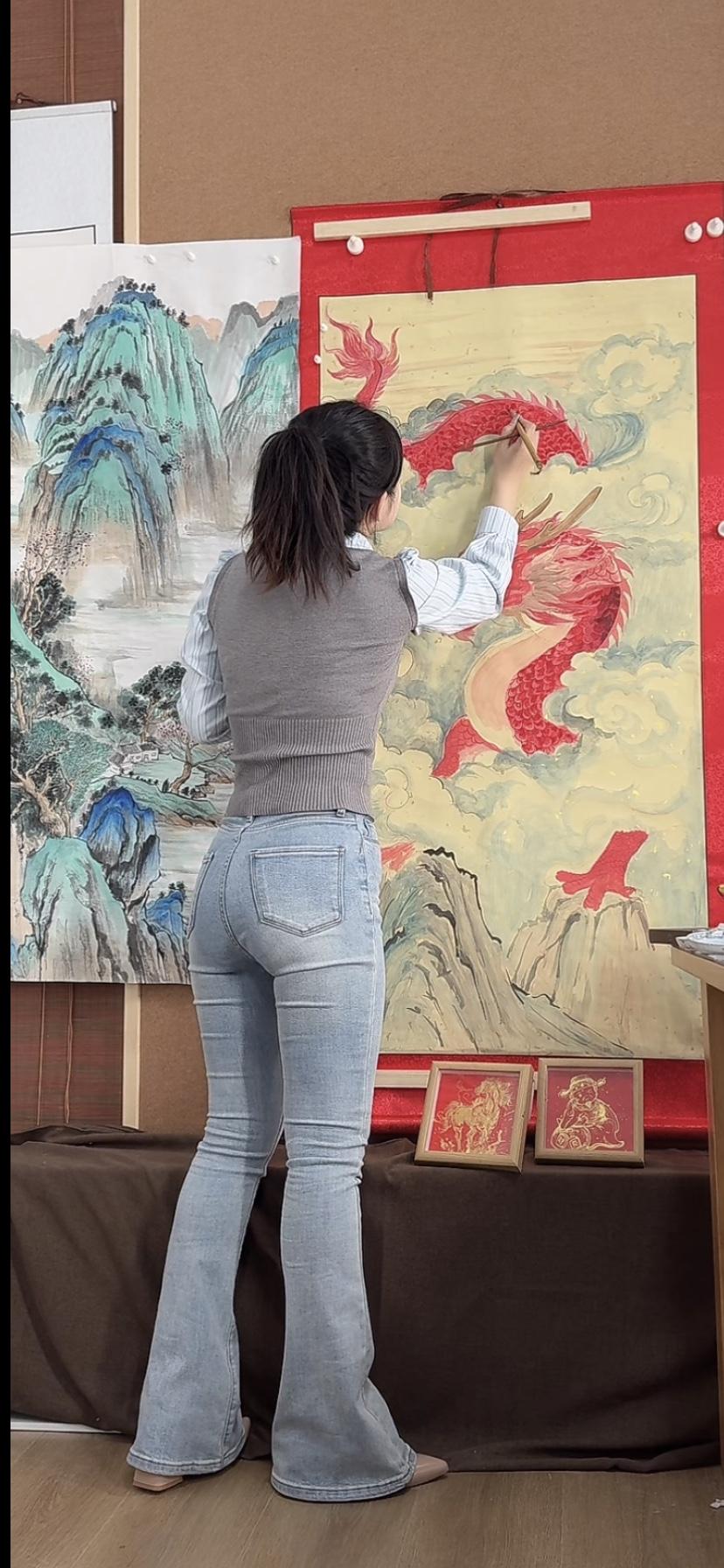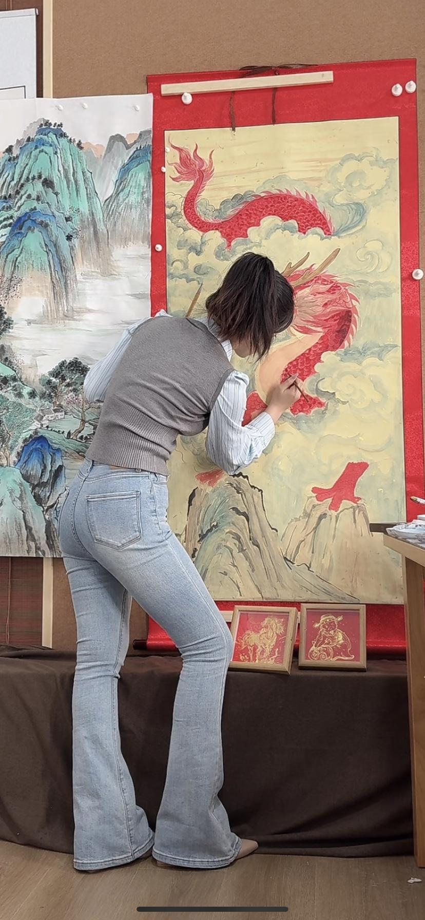 这姑娘在画画,龙画得真霸气!