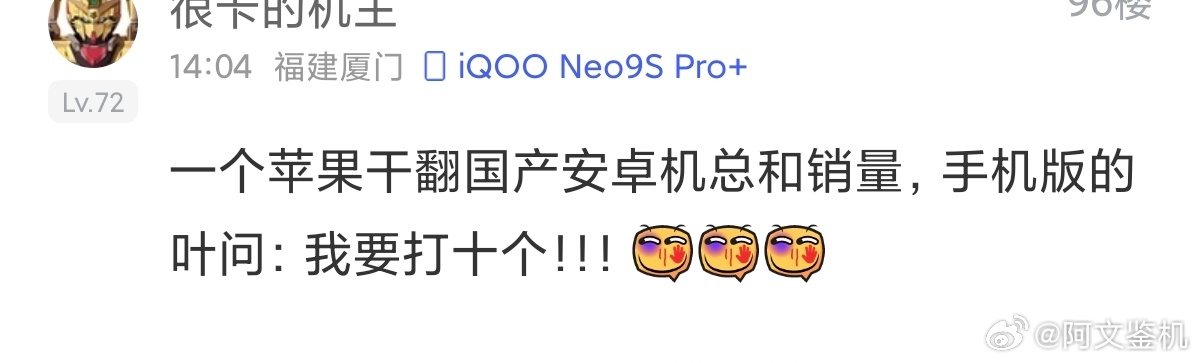 苹果厉害,一个打十个!可是我看不懂,今年大环境这么差,为什么看到国内手机品牌被苹果吊打,网上总是有些人反而会在评论区留言,莫名觉得很自豪?关键你用的也不是苹果,不明白什么心态,好像苹果卖的好,会给你分点钱一样?大家说说这种类型的人,是什么心态?数码科技评论