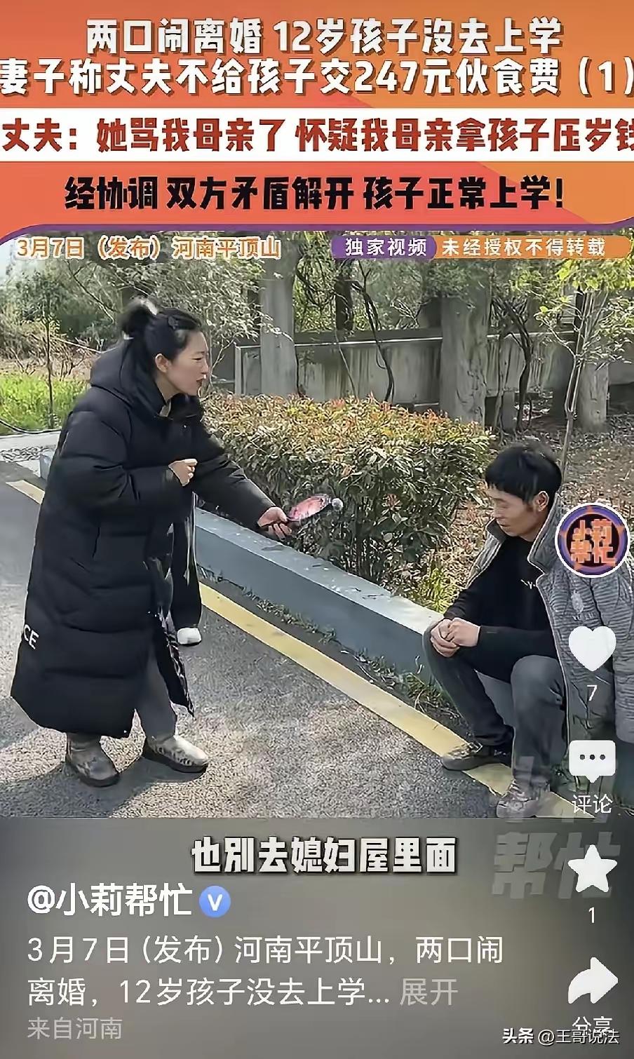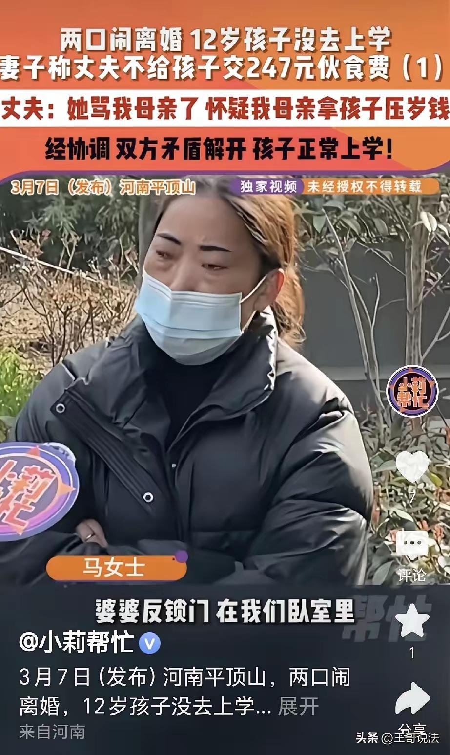 这是一个典型的家庭矛盾案例,涉及婆媳关系、夫妻沟通、经济依赖和家庭边界感等多个层面,反映了现实生活中不少家庭可能面临的困境。我的看法如下: 婆婆侵犯了儿媳的隐私权 婆婆未经允许进入儿媳卧室,甚至反锁门,这种行为严重侵犯了儿媳的隐私权,也表现出婆婆对边界感的缺乏。成年人的私人空间应当得到尊重,特别是在已婚家庭中,夫妻有权对自己的卧室说“不”,而不是被视作“家中的公共场所”。婆婆如果有顾虑或想帮忙,应通过沟通而不是私自行动。这种越界行为是矛盾的导火索之一。 马女士处理方式过于冲动 尽管婆婆行为不当,马女士也不应在没有确凿证据的情况下直接指责婆婆拿走了女儿的压岁钱,并且情绪失控当众大骂。这不仅伤害了婆婆,也激化了夫妻之间的矛盾。家庭成员间遇事应冷静处理,学会理性沟通和求证,而不是情绪化地爆发,这样才能有效化解矛盾。 经济依赖加剧了矛盾和无力感 马女士十几年不上班,经济完全依赖丈夫,导致在矛盾爆发时处于被动和弱势,甚至连孩子的伙食费都难以支付。这种经济上的极度依赖使她在家庭中缺乏话语权和安全感,也埋下了家庭关系恶化的隐患。现代家庭鼓励夫妻双方都有一定的经济独立,不然一旦出现矛盾,一方掌控经济就很容易控制另一方,带来压力和冲突。 丈夫态度及做法值得反思 丈夫维护母亲无可厚非,但态度过于强硬,因妻子骂母亲就立即断绝生活费,甚至不肯为孩子支付伙食费,显得极端且不负责任。孩子是无辜的,他们的权益不应成为夫妻间争执的牺牲品。此外,丈夫认为“女人在家带孩子就是应该的”,带有传统性别角色刻板观念,忽视妻子的自我价值和经济独立需求,也加剧了矛盾。 家庭沟通和边界管理很重要 这个案例最根本的问题是缺少有效的沟通与尊重。婆媳双方都缺少换位思考,丈夫也没有做家庭和解的桥梁。要改善家庭关系,必须建立良好的沟通机制,尊重彼此的生活空间和情感需求。特别是在现代家庭,婆婆应该认清儿子小家庭的独立性,给予儿媳足够尊重;夫妻双方也需相互扶持,尊重对方的付出,寻找共识。 对孩子的保护至关重要 孩子是家庭中最脆弱的一方,父母的争吵对孩子有心理伤害。夫妻双方应避免因个人矛盾影响到孩子的生活和学习,要确保孩子的合理权益得到保障。 总结建议 婆婆应尊重儿媳的私人空间,避免无故进入和反锁房门。 马女士应冷静处理矛盾,注重证据,避免情绪化指责,树立经济独立的意识,适时走出家门,增加自我价值和话语权。 丈夫应改变传统性别偏见,支持妻子的自我发展,理智处理婆媳矛盾,确保孩子的权益优先。 全家人共同努力,建立边界感与良好沟通,才能避免矛盾恶化,营造和睦幸福的家庭氛围。 家庭不是谁单方面的责任,而是成员之间相互尊重、理解和支持的结果。只有这样,才不会让“这就是不上班的下场”成为现实的悲哀结局。婆媳人生感悟 婆媳共处的智慧