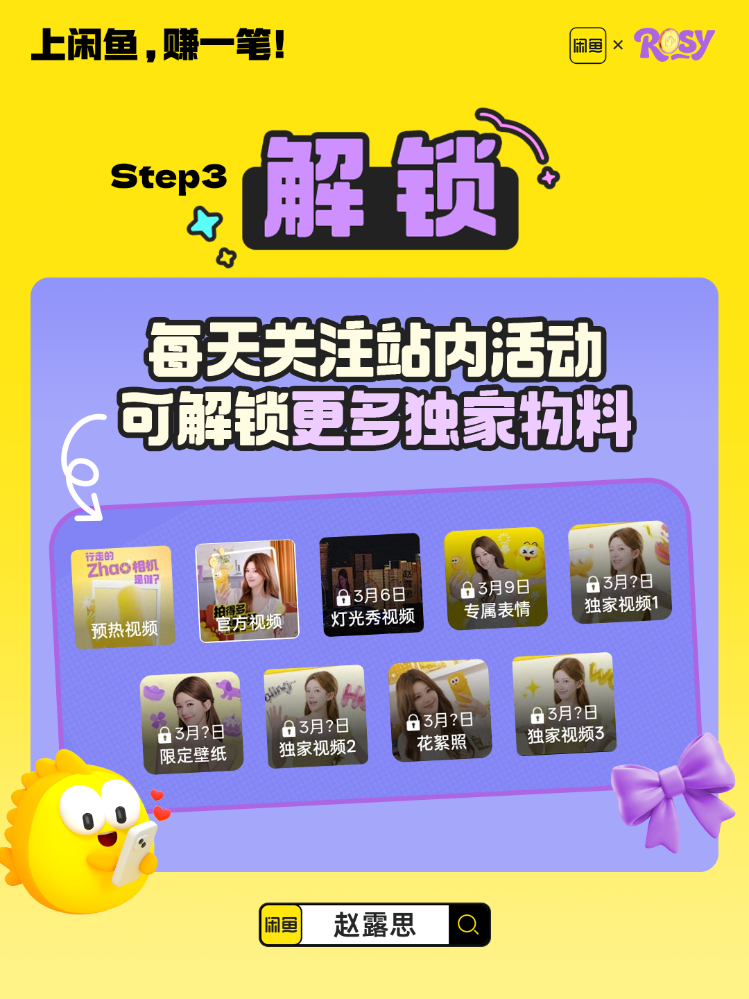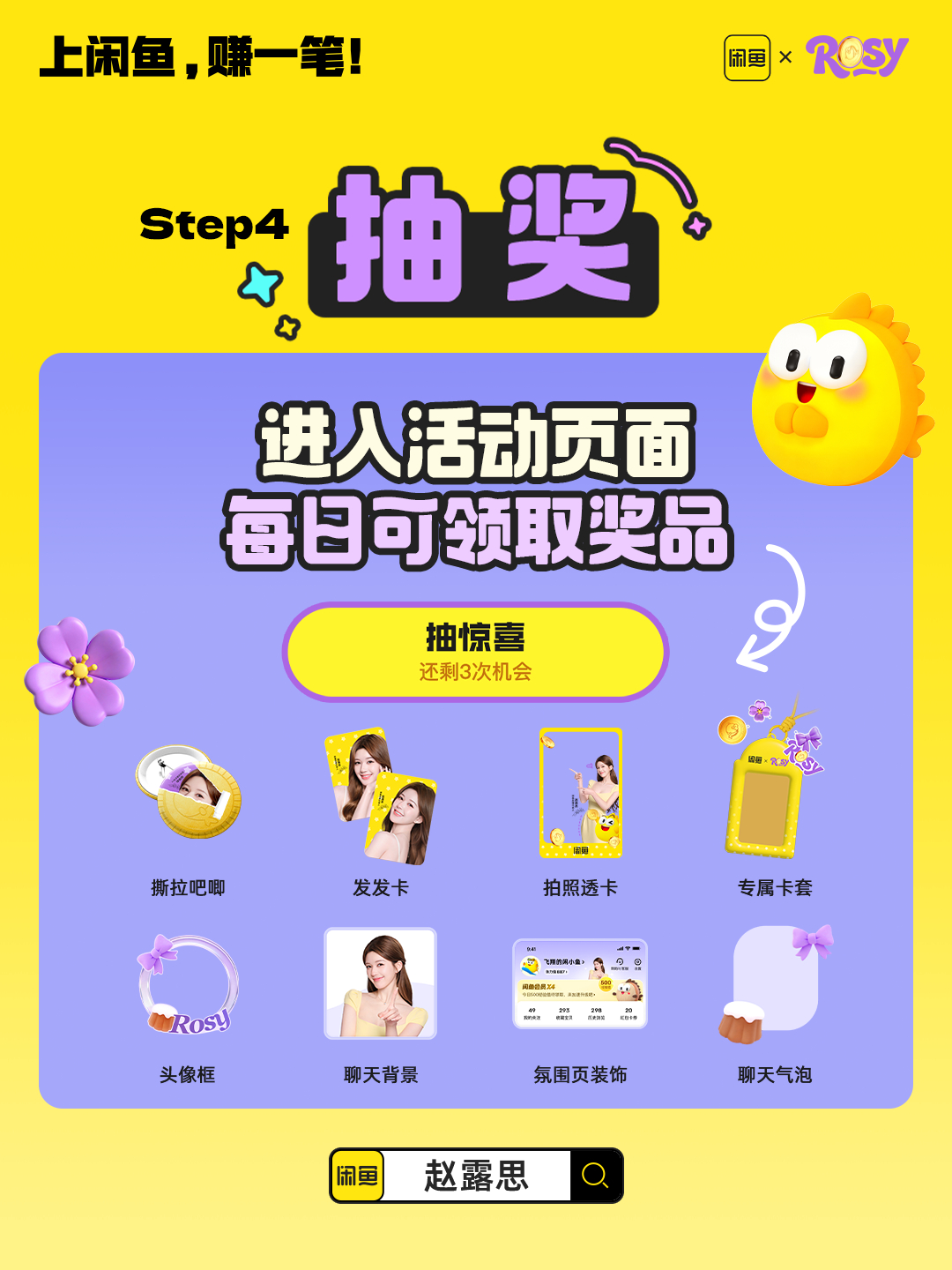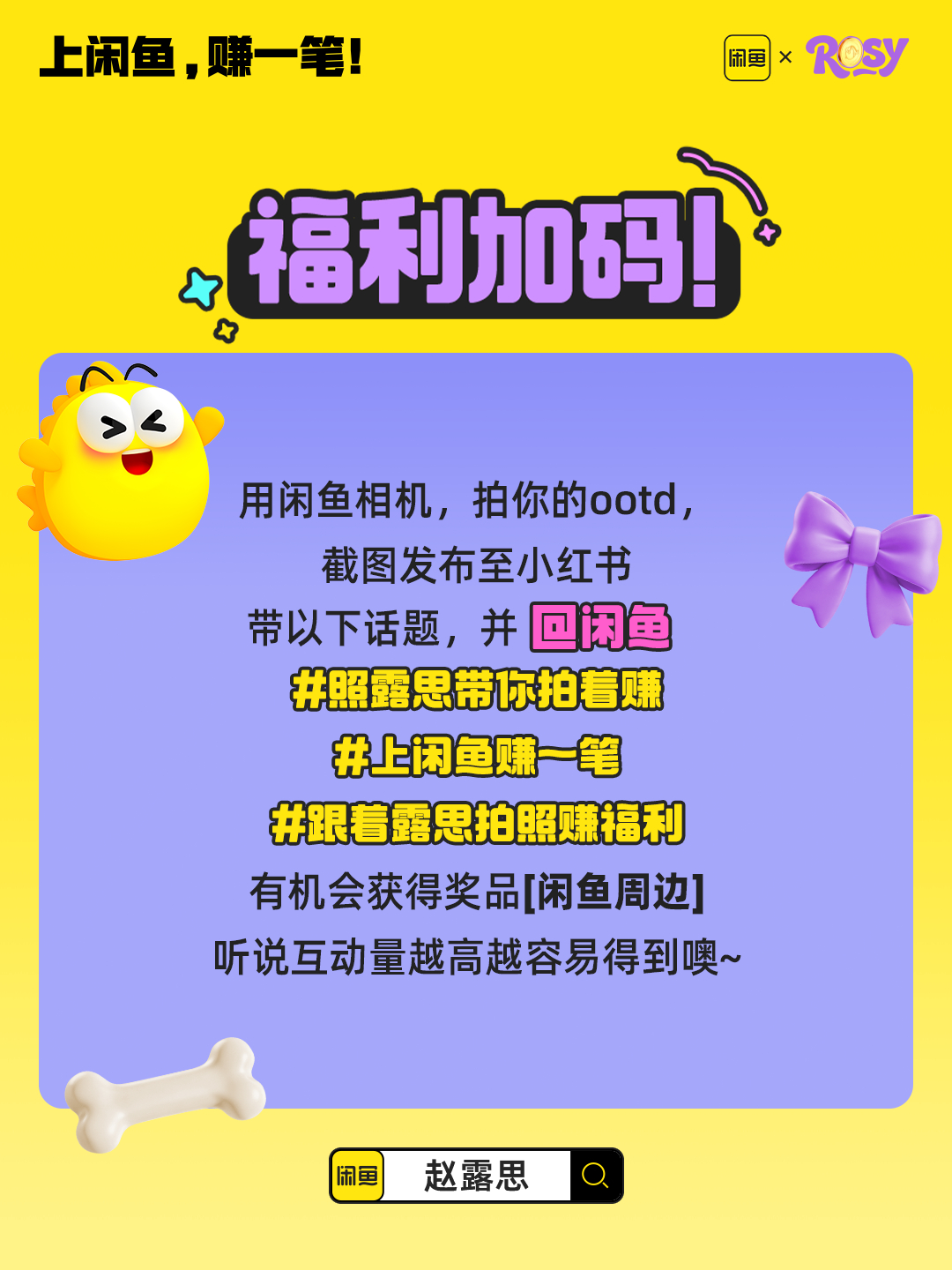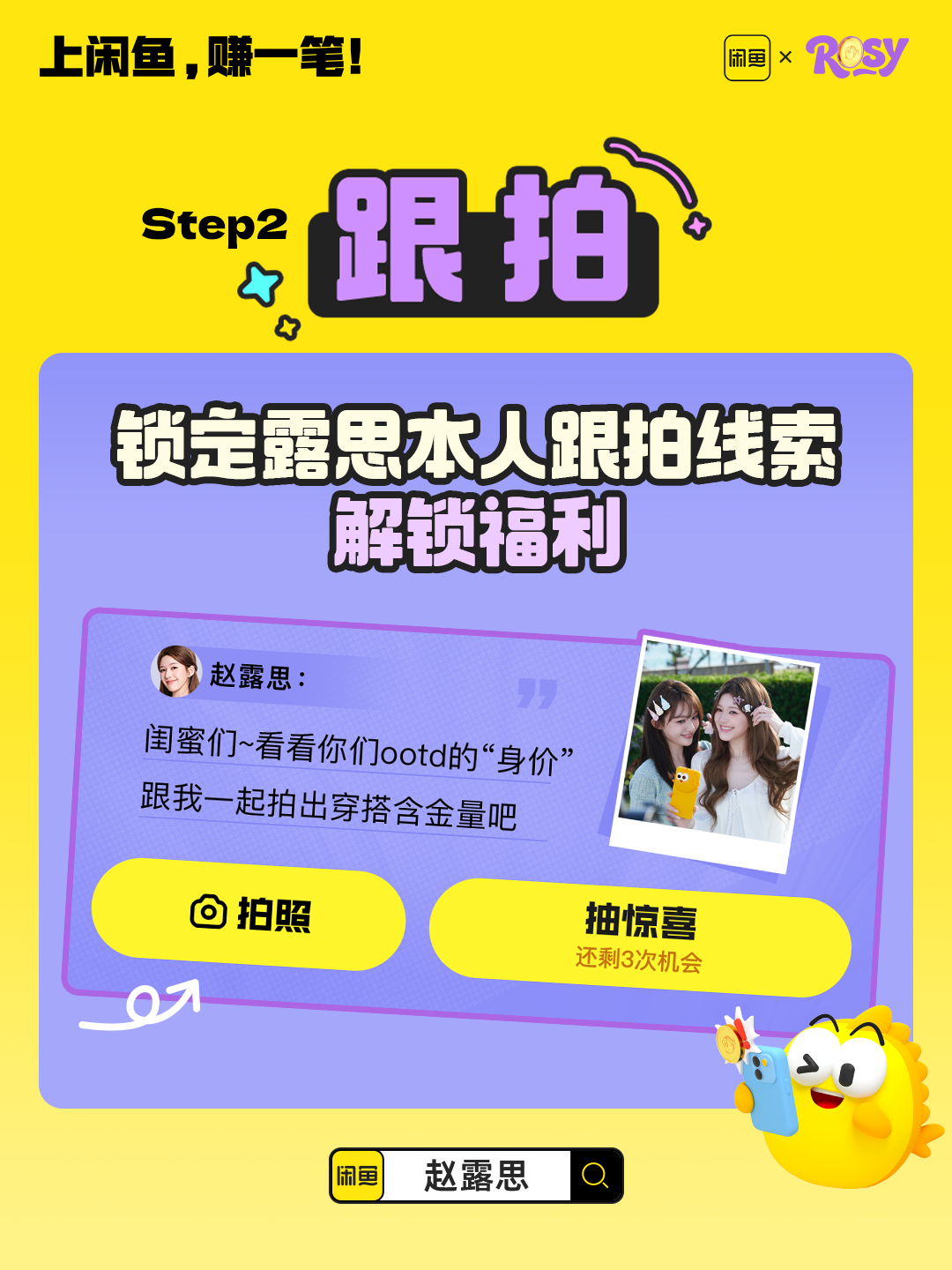 上闲鱼搜索「赵露思」,跟拍照露思的赚钱之道,玩闲鱼空间,拍张照片就能赚!拍得多赚得多!参与闲鱼露思跟拍有机会得赵露思的独家周边哦~闲鱼代言人赵露思 上闲鱼赚一笔