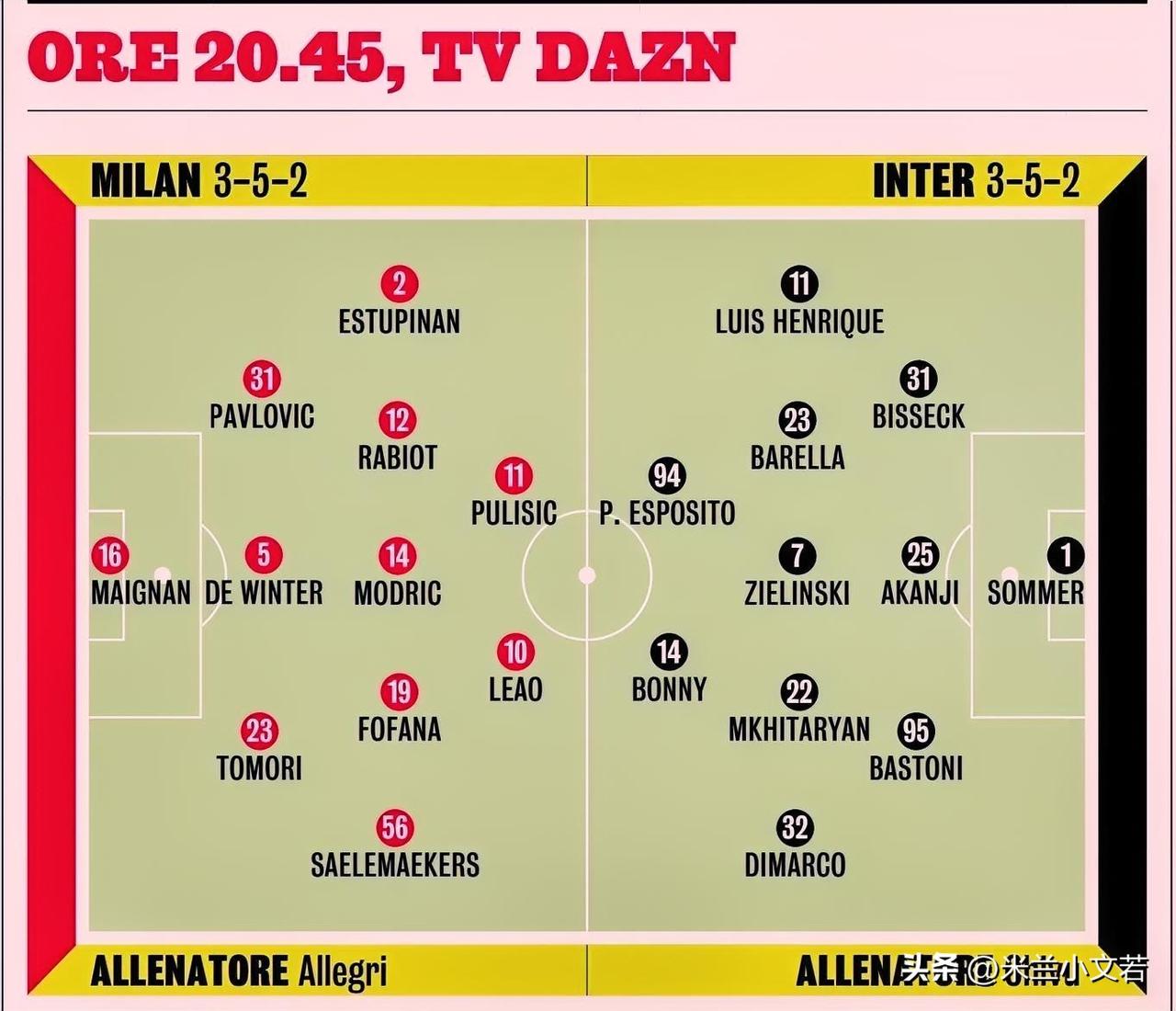 米兰与国际米兰之战,主力阵容。本场比赛阿莱格里最后还是保守的选择了埃斯图皮尼安,虽然巴特萨吉昨天与球队完成了合练,但赛前阿莱格里还是做出了最保险的选择。 米兰主力球员:3-5-2 门将:迈尼昂 后卫:帕夫洛维奇、德温特、托莫里 中场:埃斯图皮尼安、拉比奥特、莫德里奇、福法纳、萨勒马克尔斯 锋线:莱奥、普利西奇 米兰3名球员因伤缺阵,希门尼斯、加比亚、奇克,其中加比亚的缺阵对于米兰而言影响最大,德温特赛前并没有说什么豪言壮语,他只是希望队友相信自己,他会竭己所能做好防守。