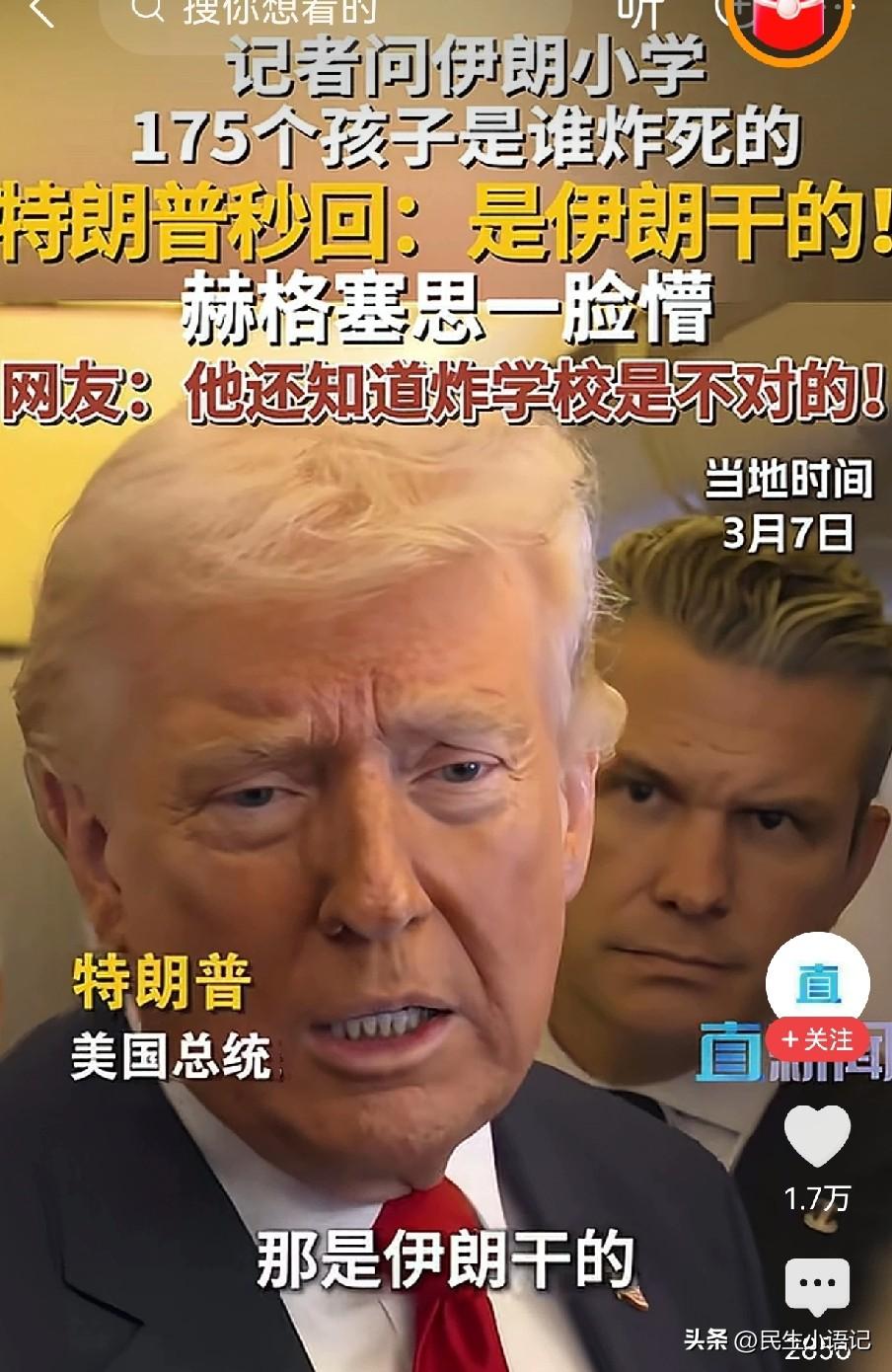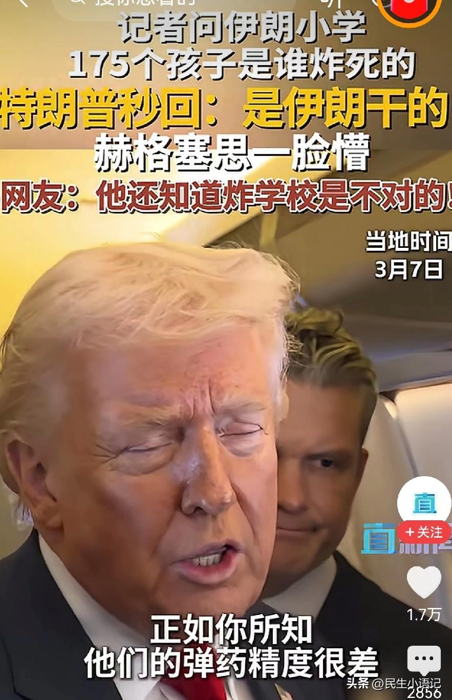 离大谱!特朗普被问伊朗小学遭袭,一句话甩锅,身后防长当场懵了 谁能想到,面对记者关于伊朗小学遭袭的追问,特朗普能给出如此离谱的回答! 3月7日,有记者当面问特朗普:伊朗那所造成165人遇难、大多是10岁小女孩的小学遭袭,到底是谁干的? 特朗普眉头都没皱一下,张嘴就来:“是伊朗自己干的,他们的导弹精度太差了。” 这话一出,站在他身后的美国国防部长赫格塞思瞬间表情管理失控,一脸懵圈的样子被镜头拍得清清楚楚。 要知道,这起2月28日发生在伊朗米纳卜市的小学遇袭事件,种种迹象都指向美军。当时美军正在附近打击伊朗军事基地,且该区域被列入美军打击目标,就连两名美国军方匿名人士都表示,美军很可能为此事负责。 此前白宫新闻秘书还在说“美国不会袭击平民,国防部正在调查”,赫格塞思也表态军方已启动调查。结果总统一句话,直接把锅甩给伊朗,还把原因归结为“导弹精度差”,完全和调查方向背道而驰。 如此轻描淡写地回应上百条儿童性命的悲剧,还当众“前后矛盾”,也难怪连身边的防长都被这波操作惊到了。 你怎么看特朗普这番甩锅言论?面对如此重大的平民伤亡事件,这样的回应是否太不负责任了?