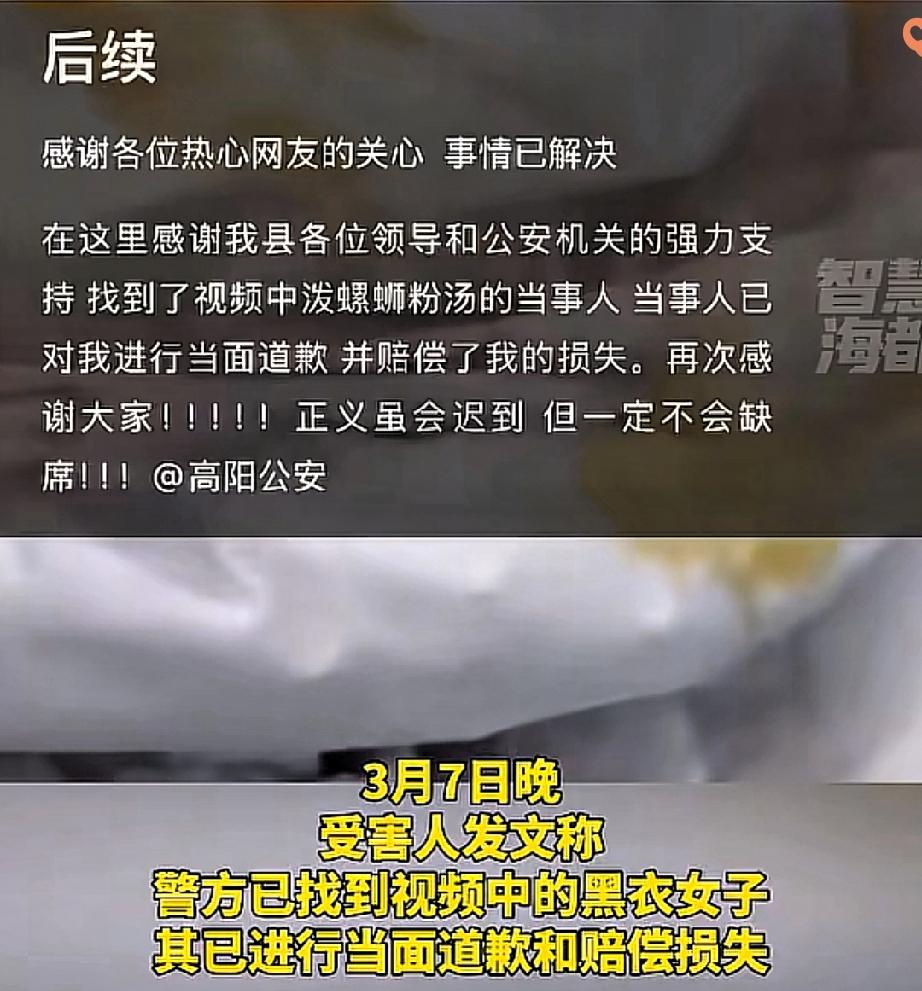 一碗螺蛳粉汤泼出去,泼掉的何止是体面,更是成年人最该有的情绪底线! 拿错凳子立马归还道歉,多大点事儿?可河北保定这女子偏要恶意报复,趁人不备把滚烫的红油汤倒进别人帽子里。 看似解气的举动,实则已经触碰了法律红线,轻则寻衅滋事,重则可能构成故意伤害。 泼汤女子因一时恶念泼汤,已道歉赔偿2000元,可网友的“人肉搜索”直接曝光其个人信息,让她和家人陷入网暴漩涡。 这种以“正义”为名的曝光,实则已触碰法律红线,涉嫌侵犯公民个人信息罪 。 她的恶行该受法律惩戒,但家人尤其是孩子不该被牵连。我们要的是法治下的公正,不是网络暴力的狂欢。 纵容“开盒”式报复,只会让网络戾气更重,最终没人能独善其身。 现在很多人把“暴躁”当个性,把“报复”当维权,却忘了公共场所的包容才是文明底色。 你一时冲动泼出去的汤,不仅要赔衣服钱,还要承担法律责任,最后落得全网谴责的下场,真的值吗? 情绪管理从来不是忍气吞声,而是懂得体面化解矛盾。 别让一点小事就暴露自己的低素养,毕竟成年人的世界,没人该为你的坏脾气买单。 真正的正义,是让违法者承担法律责任,而非用违法方式去“惩罚”违法。 你遇到过类似的公共场所摩擦吗?都是怎么处理的?来评论区聊聊~