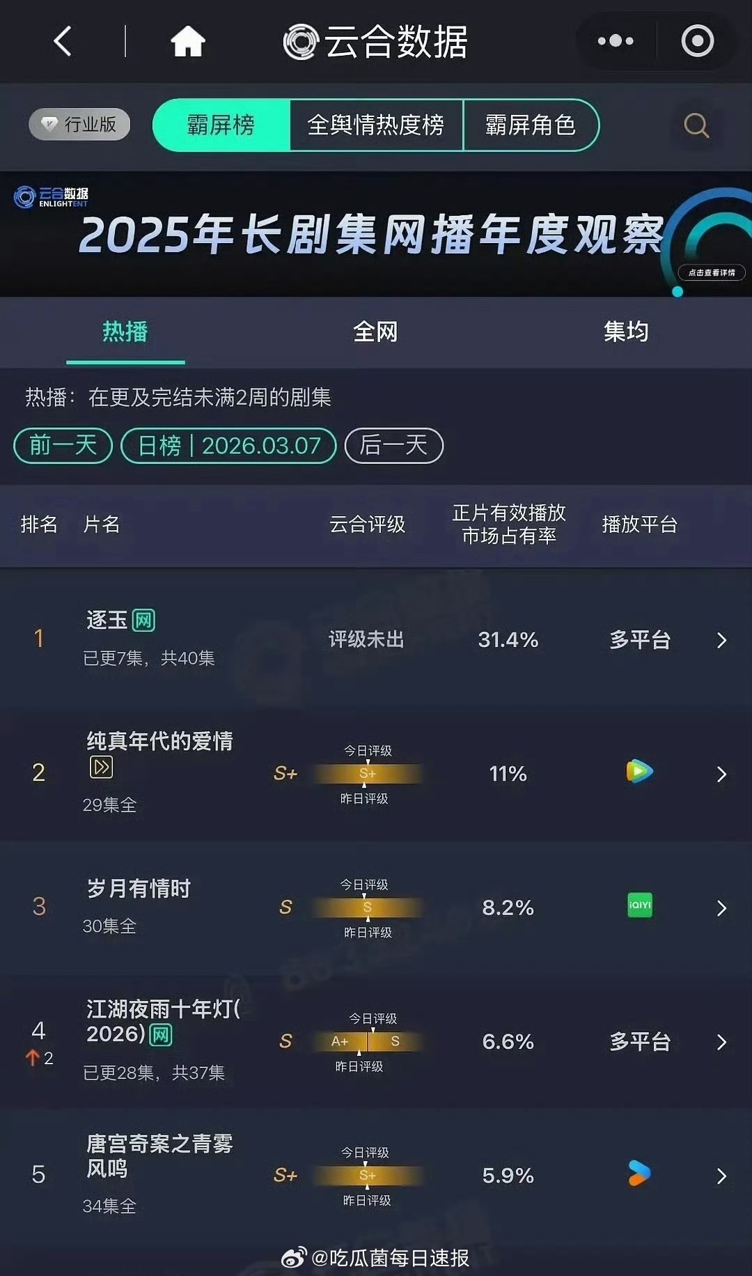 逐玉走势昨天的云合数据,逐玉位列第一,算爆吗?