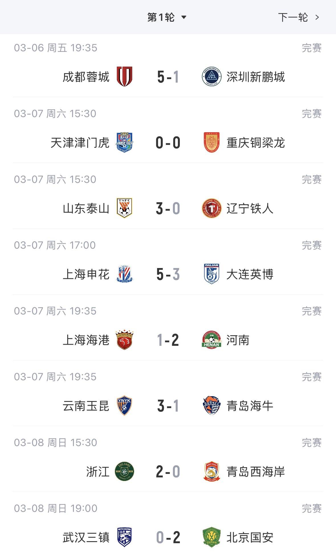 中超首轮积分榜:蓉城、玉昆均积3分居前二,国安负2分第8 泰山负3分第10 海港负5分 申花负7分 津门虎负9分垫底 03月08日 中超首轮最后两场全部结束 北京国安2-0击败武汉三镇 浙江队2-0青岛西海岸 新赛季中超第一轮排名及赛果如下图 积分榜上:蓉城、玉昆均积3分居前二,铜梁龙积1分第3,大连英博0分第4,国安负2分第8,浙江队负2分第9,泰山负3分第10,海港负5分第12,武汉三镇负5分第13,申花负7分倒数第3,津门虎负9分垫底