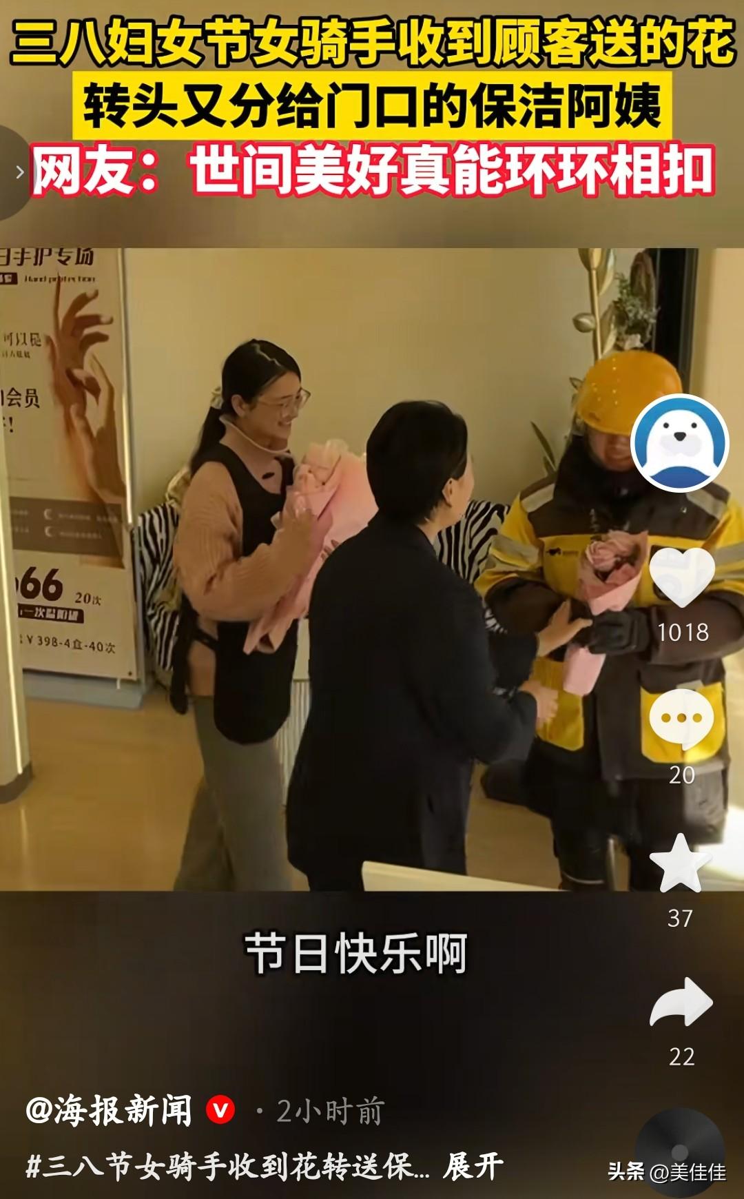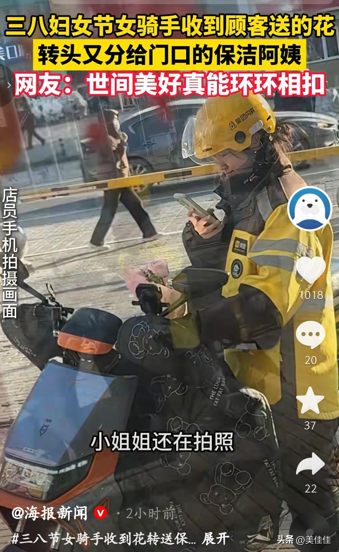 三八节妇女节这一幕太暖了。美甲店老板订了花,准备送给顾客,女骑手送完花转身离开时,美甲店老板叫住女骑手,给女骑手送了花。突如其来的惊喜,让常年奔波的女骑手格外动容,她坐在车上认真拍照留念,这份美好却没有就此止步。 转身离开时,女骑手看到了在门口默默打扫的保洁阿姨,她毫不犹豫地走上前,将手中的花分了一部分送给对方。没有华丽的语言,一句简单的节日快乐,便完成了这场温柔的善意接力。 一束花,连接起三位女性的温暖。她们都是平凡岗位上的奋斗者,用双手撑起生活的重量。这份双向奔赴的美好,无关身份与职业,只关乎人心底的善良。正如网友所说,世间美好,真的能在陌生人之间,环环相扣。