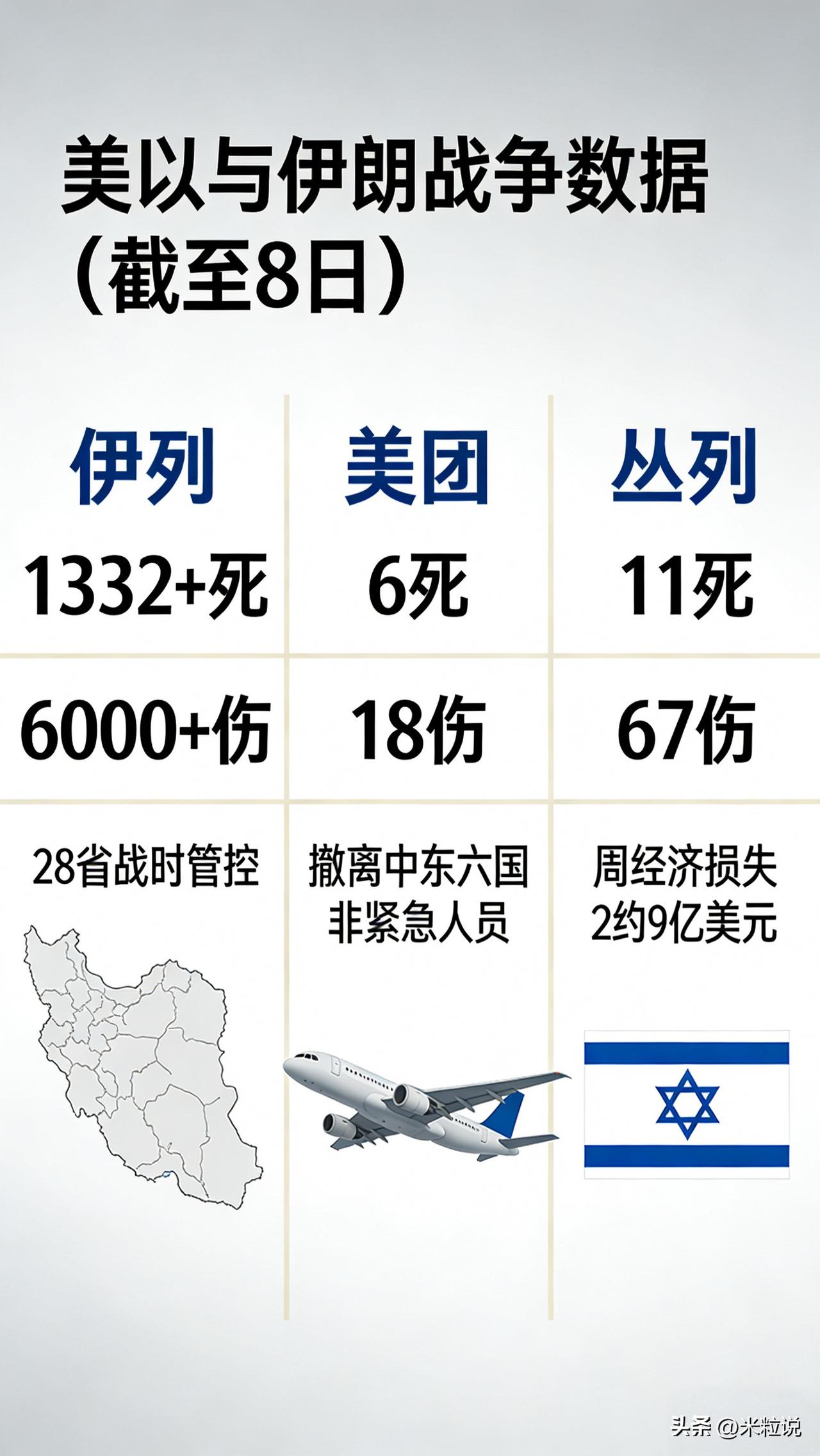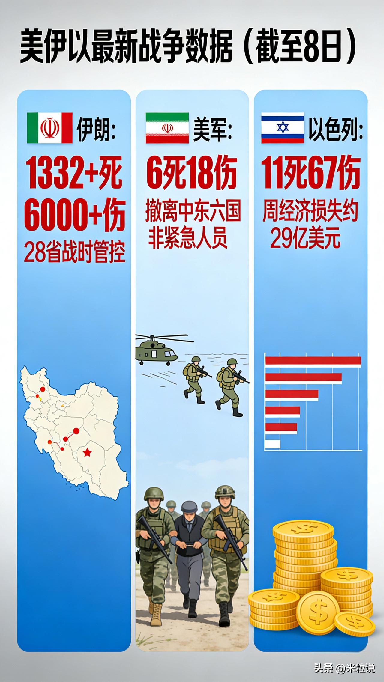 截至3月8日最新消息,美以与伊朗冲突伤亡与损失数据惊人。伊朗方面,已有1332人以上死亡、6000多人受伤,28个省份进入战时管控状态。美军有6人死亡、18人受伤,已撤离中东六国非紧急人员。以色列则有11人死亡、677人受伤,每周经济损失约达29亿美元。这场战争给各方都带来了沉重的人员伤亡和经济损失,和平显得尤为珍贵,希望冲突能早日平息,减少更多的伤痛。