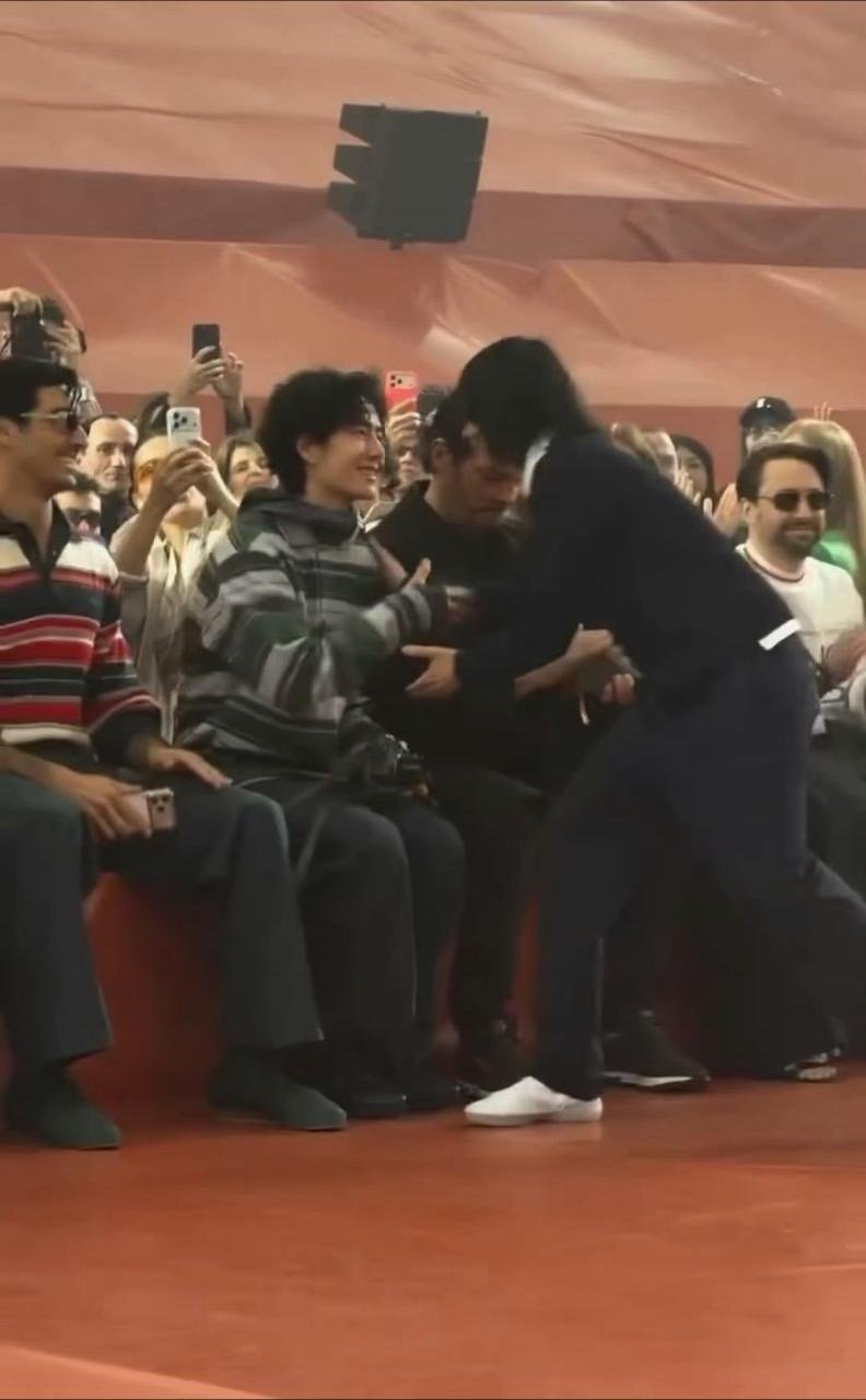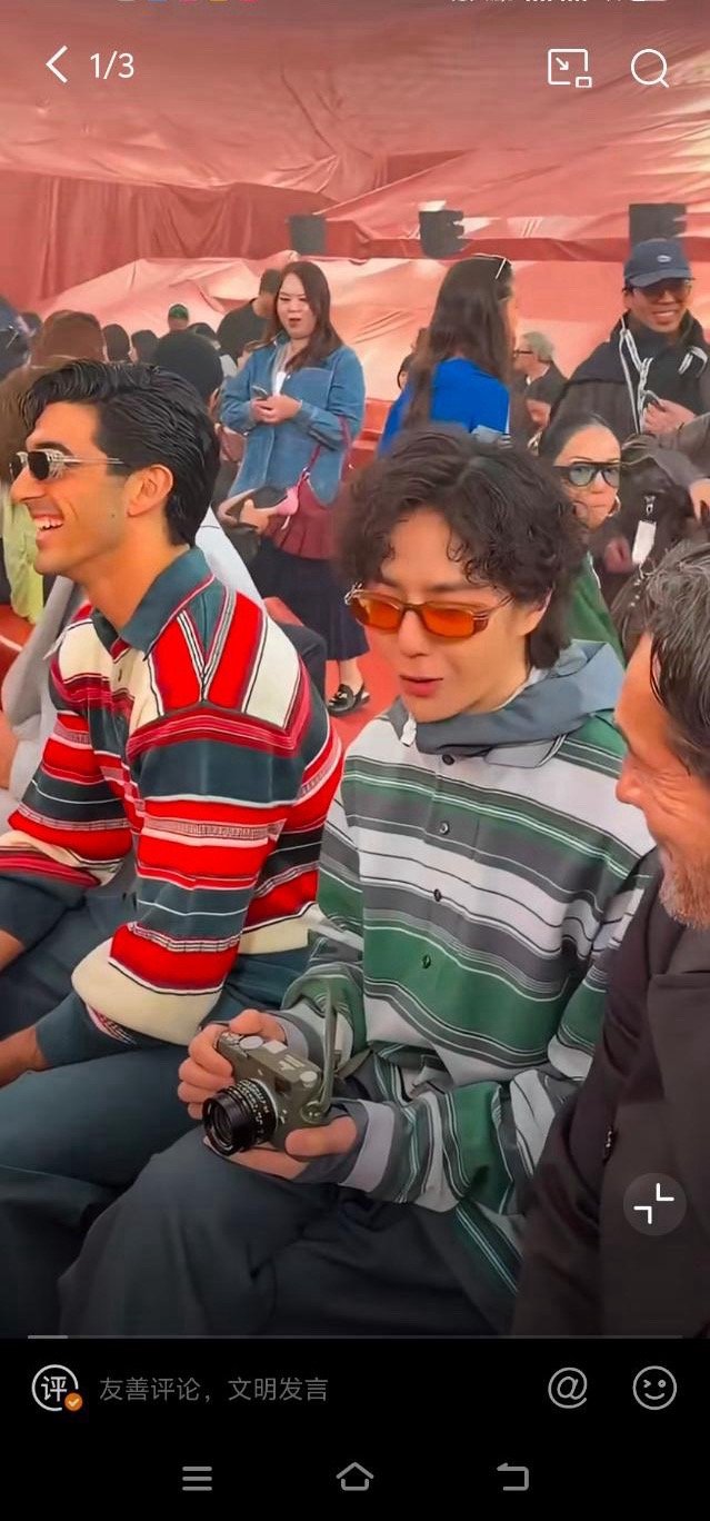 王一博巴黎看秀第二场,座位:Lacoste 母公司CEO坐一博旁边,主动找一博英文热聊。设计总监Pelagia秀后答谢跟一博热情拥抱(秀场唯三互动:CEO,王一博和金球影后)。