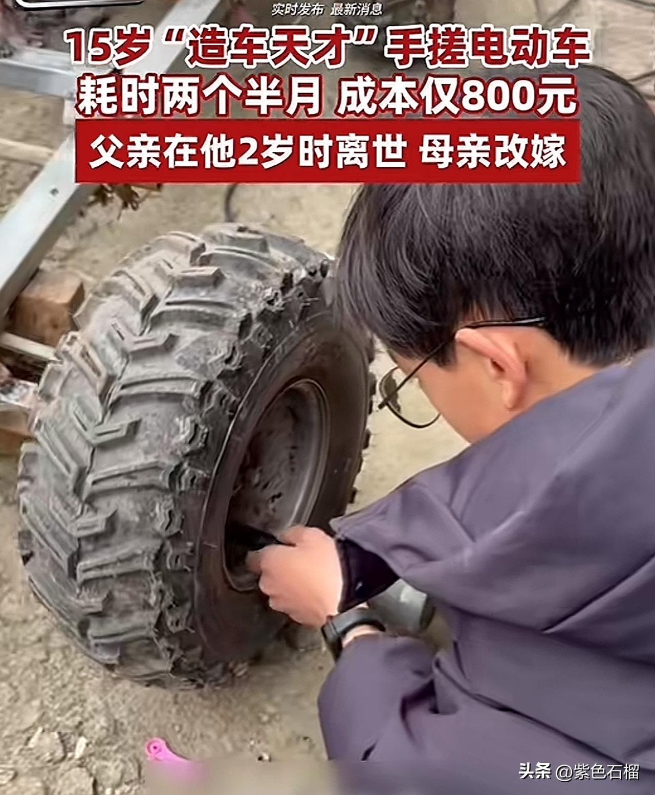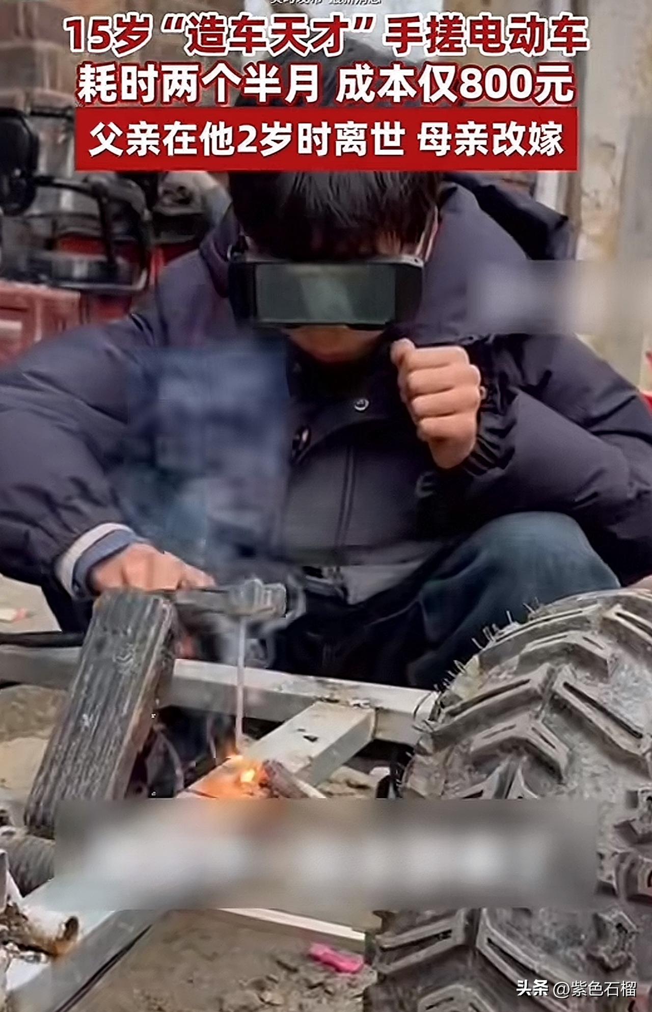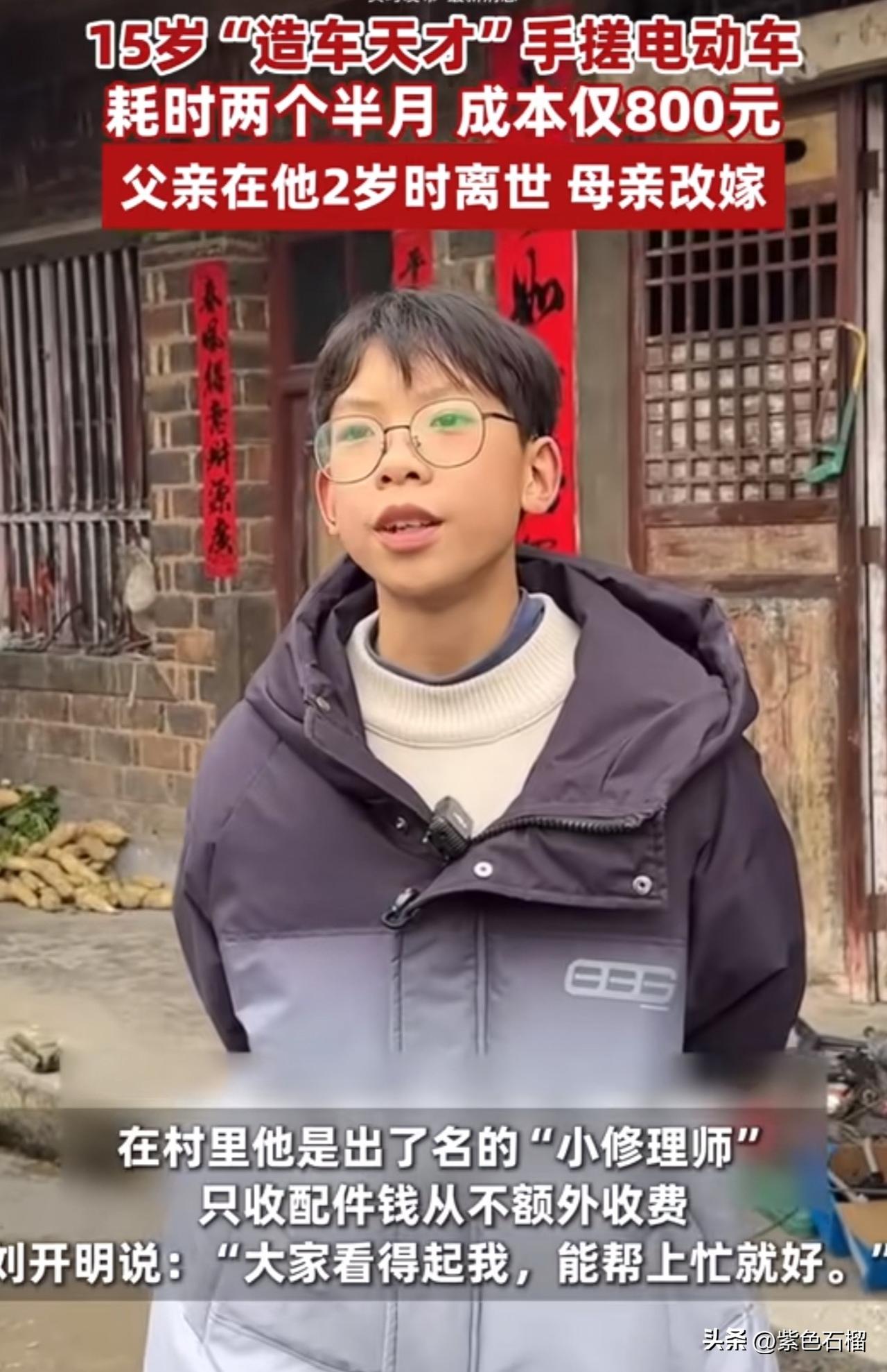 湖南邵阳有个15岁的男孩刘开明火了! 他的身世堪称命运多舛,2岁时父亲离世,母亲随后改嫁。 小开明自幼跟着奶奶生活,因担心奶奶洗澡时受冷,小小年纪便动手为奶奶安装浴霸和太阳能灯。 渐渐地,他成了村里的“修理小能手”。左邻右舍的家电出了问题找他修理,刘开明只收取配件费,从不额外加价,邻居们提起他都赞不绝口。 去年,刘开明打算自己打造一辆电动车。于是,他靠着仅有的800元压岁钱,焊接车架、连接线路,耗时两个半月,愣是在自家院子里造出了一辆能跑三四十公里的电动车! 为这个肯钻研、爱动脑的男孩点赞,这样的人未来必定大有作为。