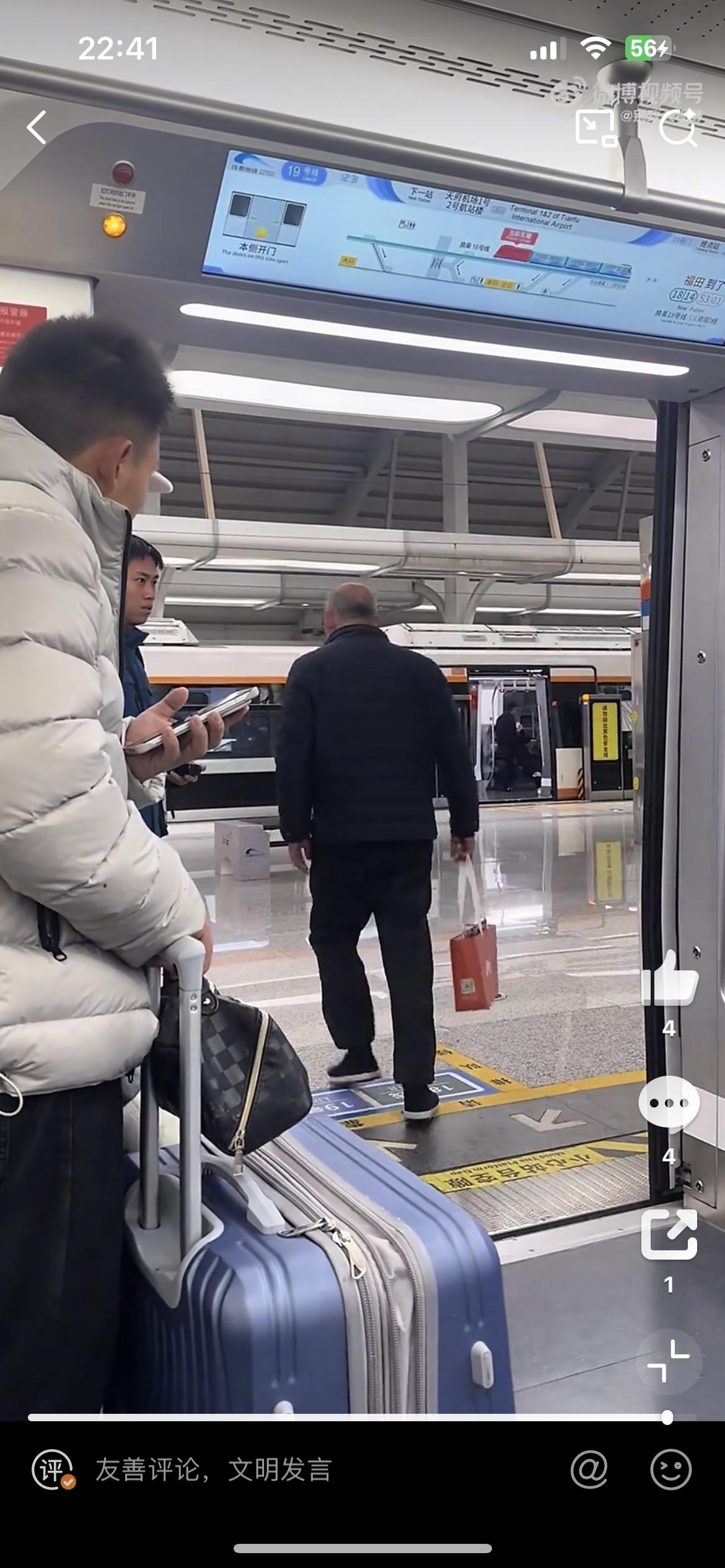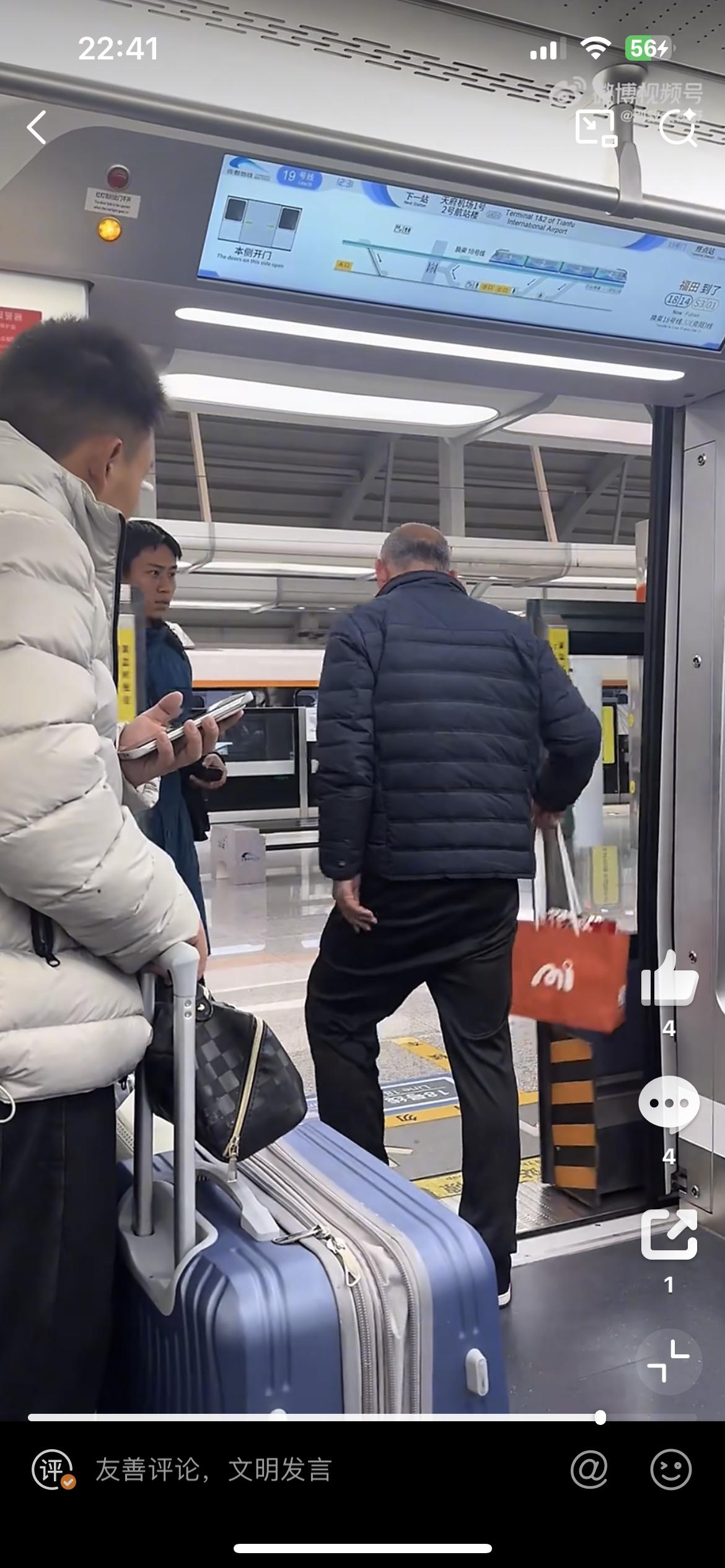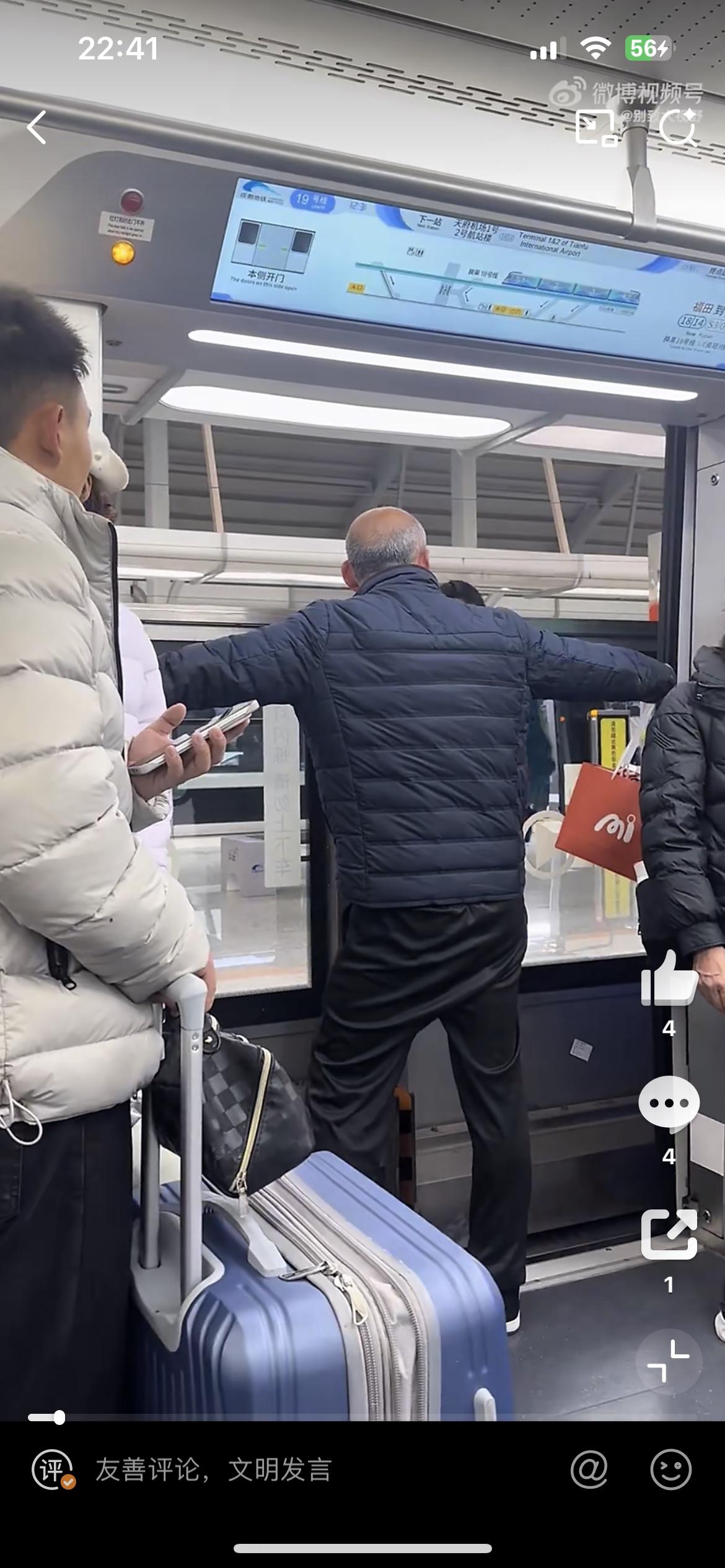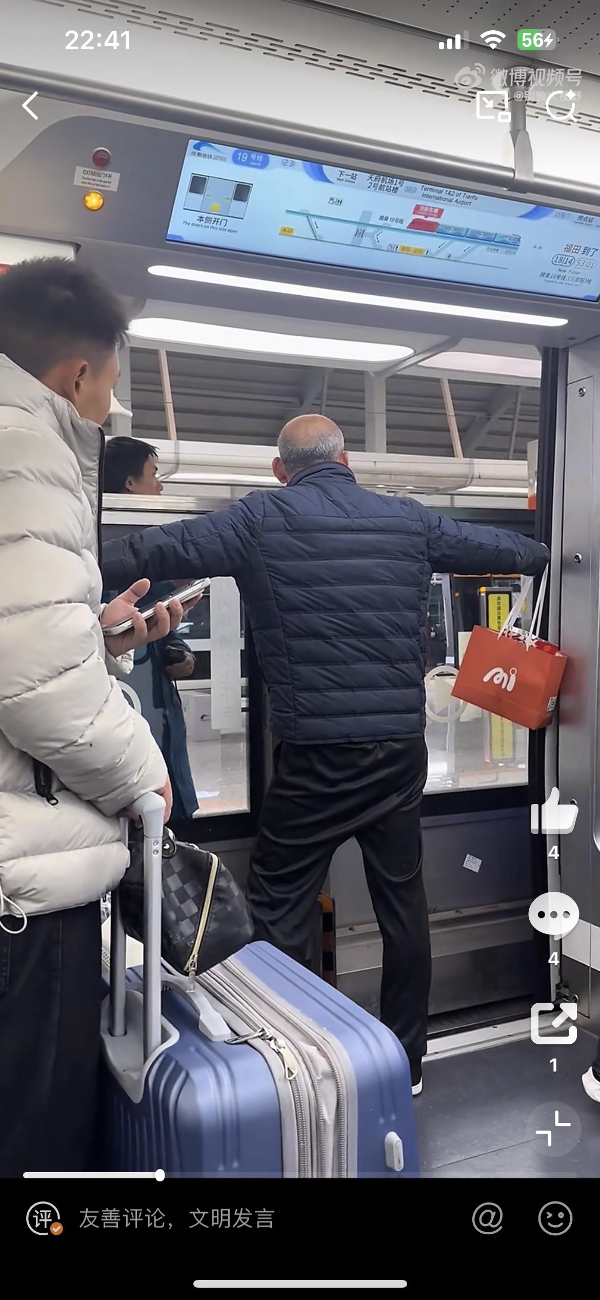 成都地铁惊现蛮横大爷,自己坐过站,用身体挡住地铁门,不让地铁关门。这时工作人员过来,看到老人的无礼一幕,没有和老人理论。而是默默地把地铁外面的屏蔽门打开,让老大爷下车,老大爷潇潇洒洒的走出了地铁,头也不回的走了。对于如此不文明的行为,因为是个老人,地铁工作人员很无奈。大爷地铁不文明 地铁男人