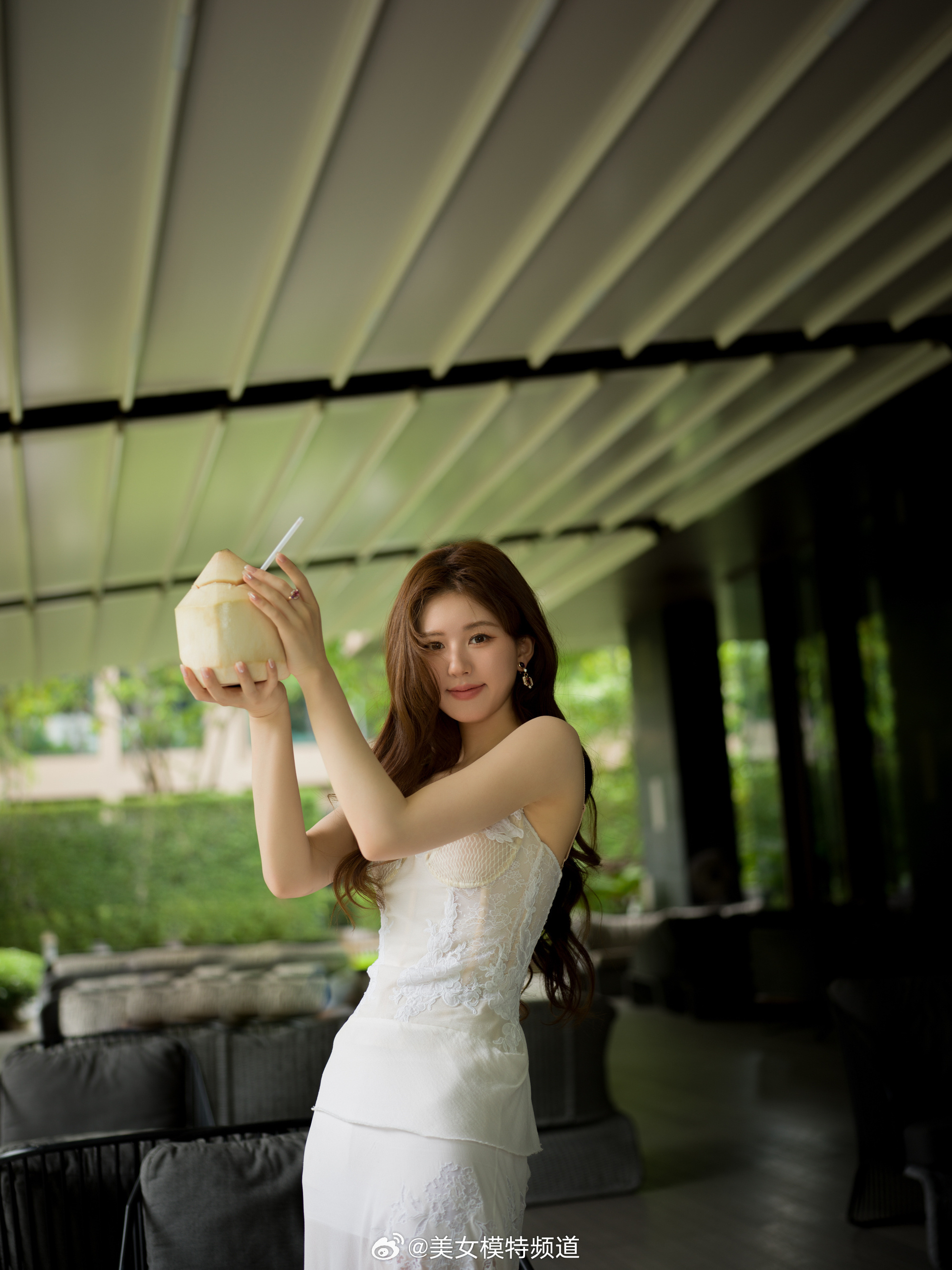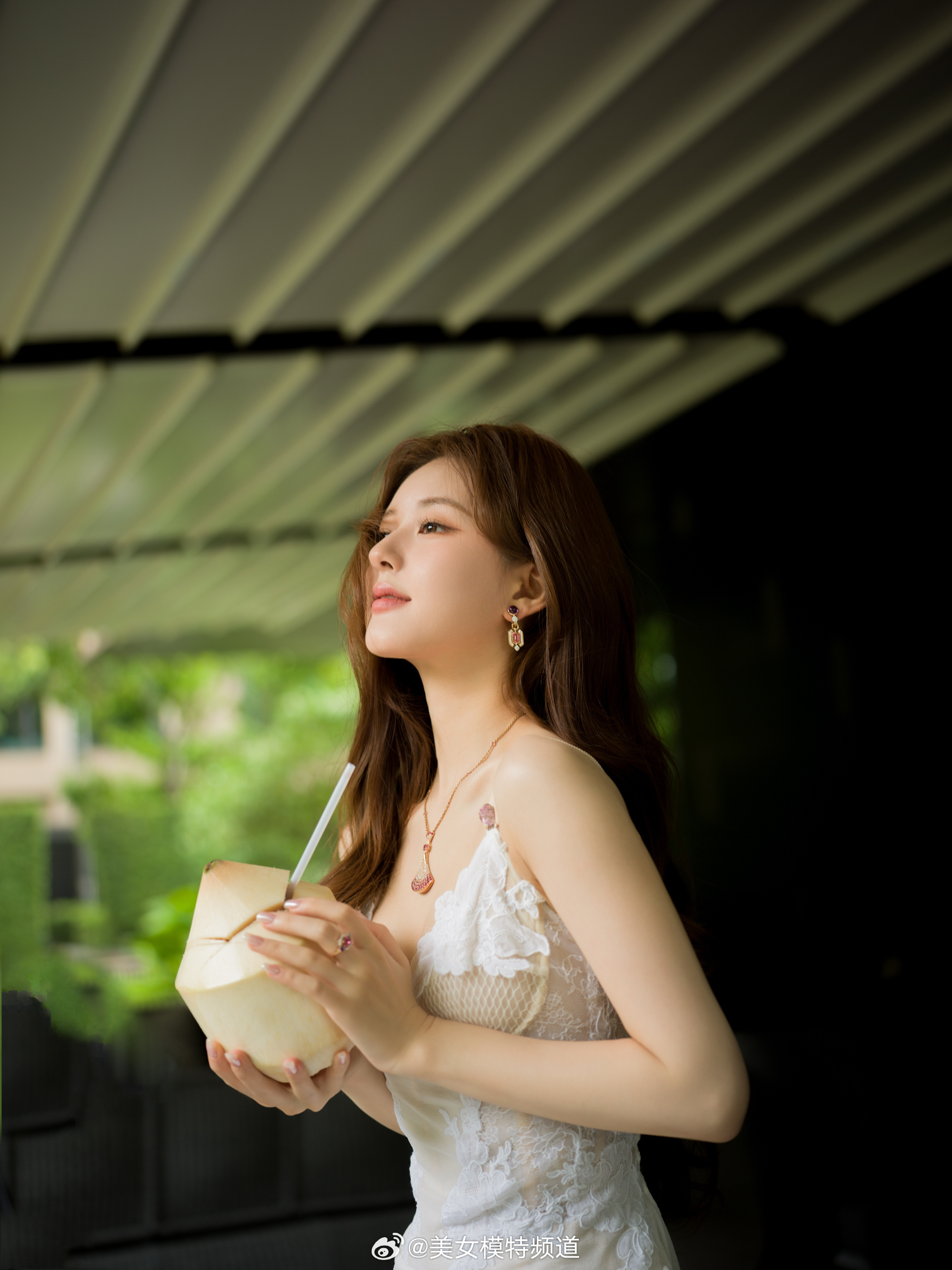 陈瑶绿植鲜花白色蕾丝裙甜美写真