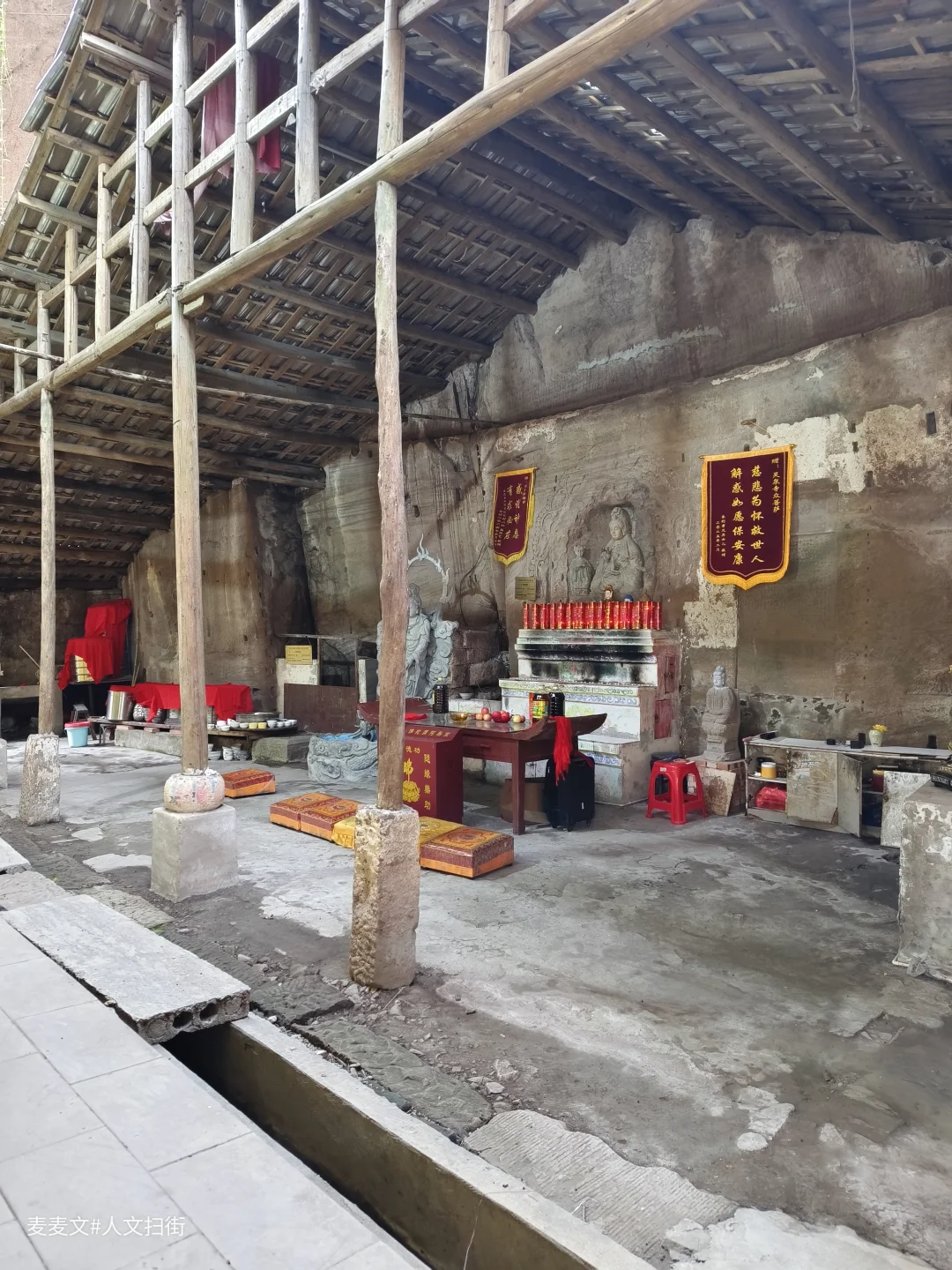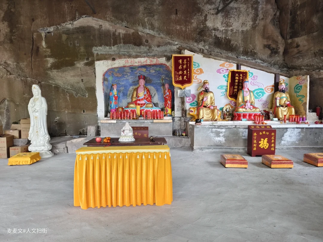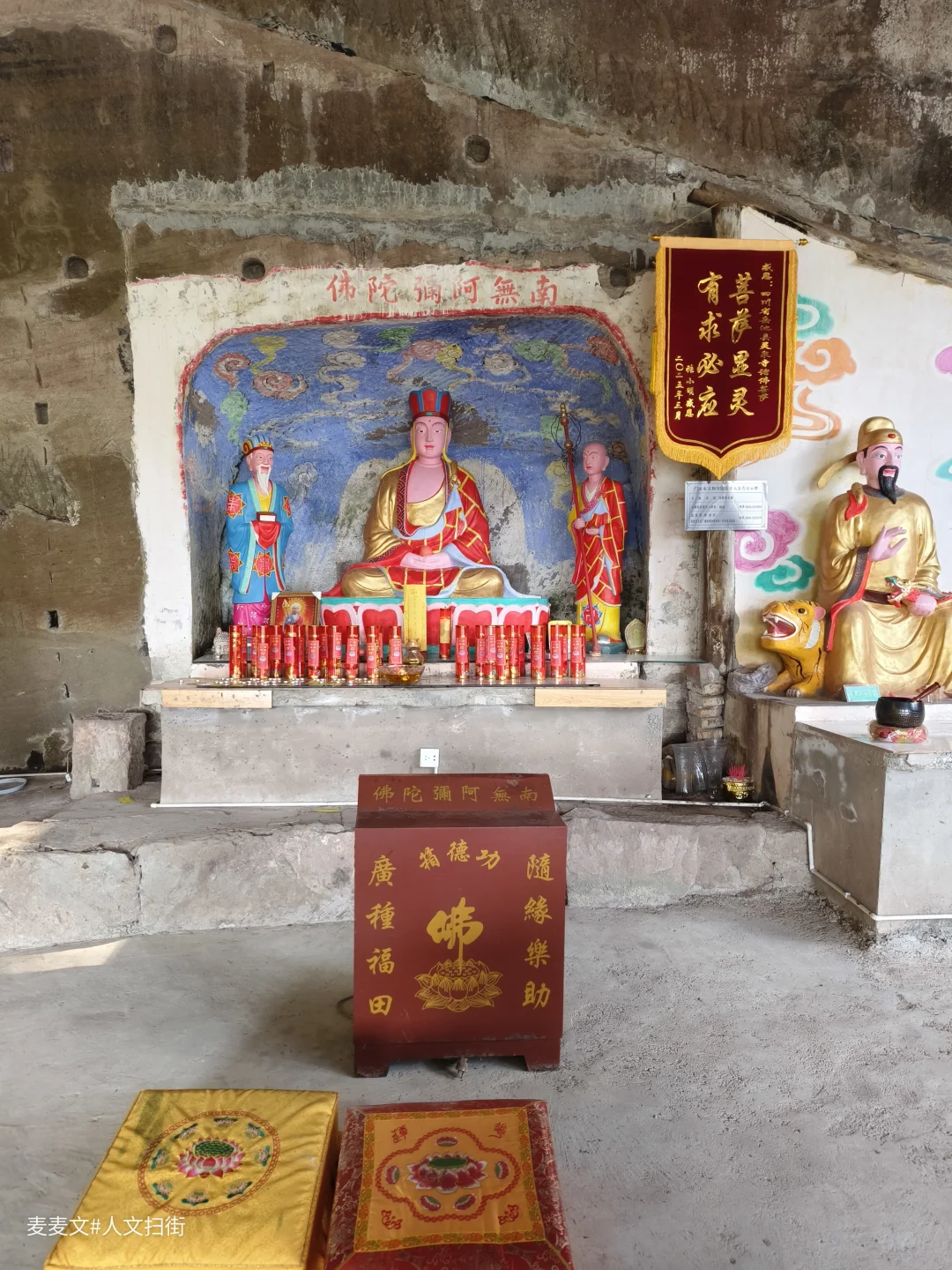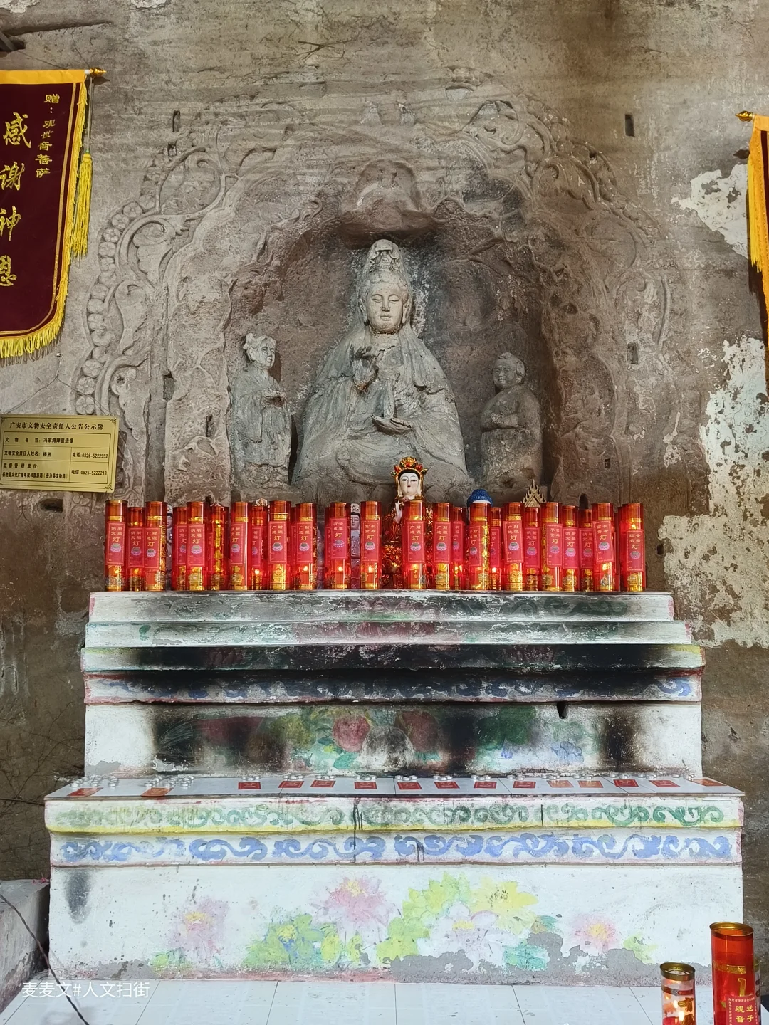 在四川省广安市岳池县九龙镇九龙堰村一组,藏着一处被时光温柔包裹的石刻——冯家湾摩崖造像。主龛的观音造像古朴端庄,虽经数百年风化,衣纹仍依稀可见,左右侍立的童子灵动依旧。岩壁上的造像与现代的祈福灯、功德箱交织,古老的信仰在烟火气中延续。另一龛重塑的地藏菩萨色彩鲜亮,与斑驳的岩壁形成强烈的时空碰撞,诉说着传统信仰的当代生命力。