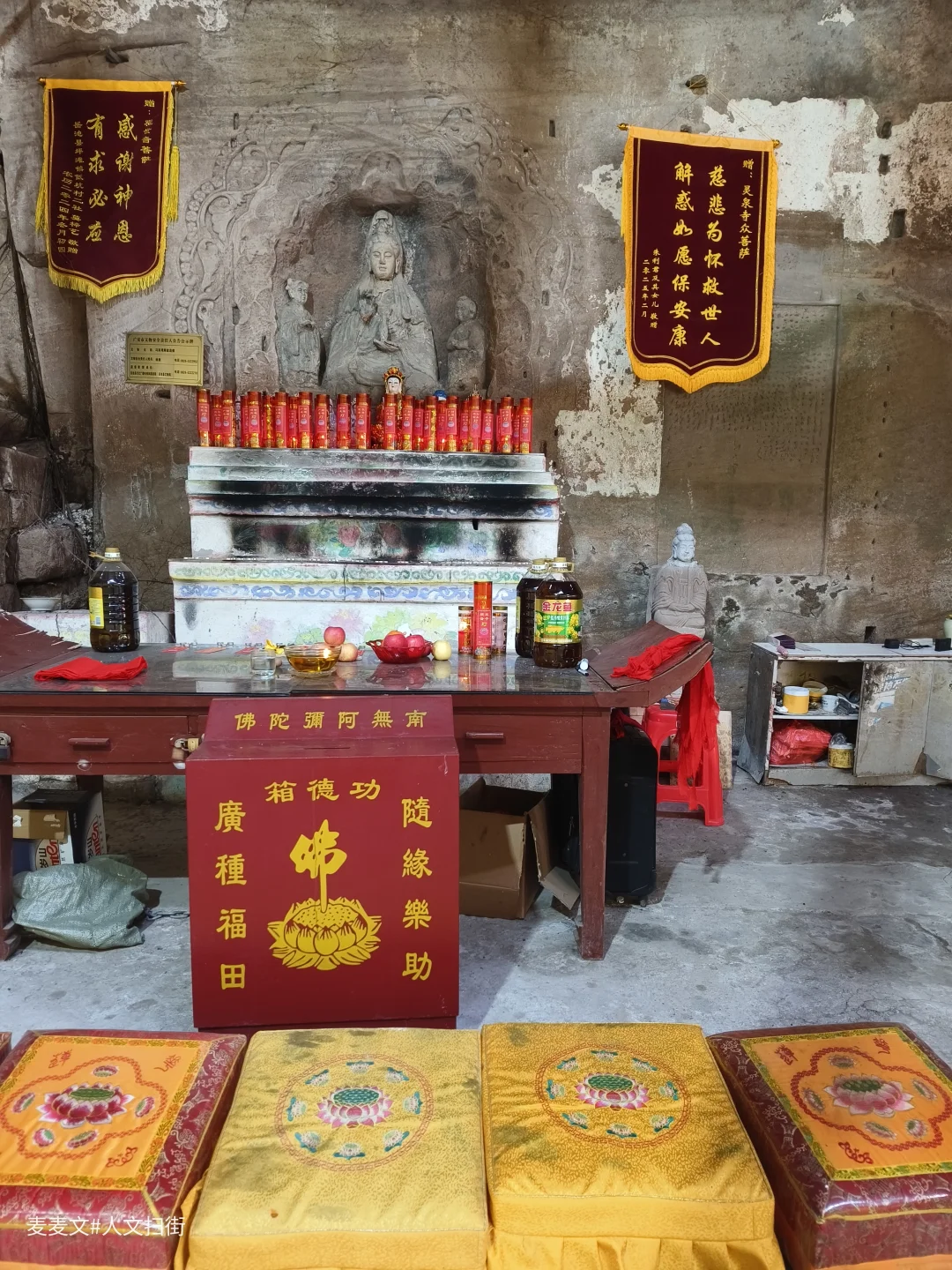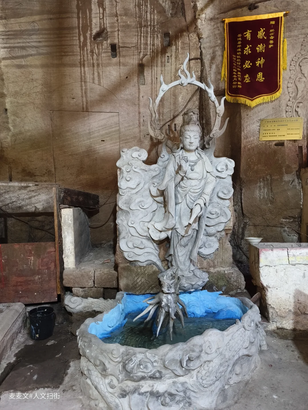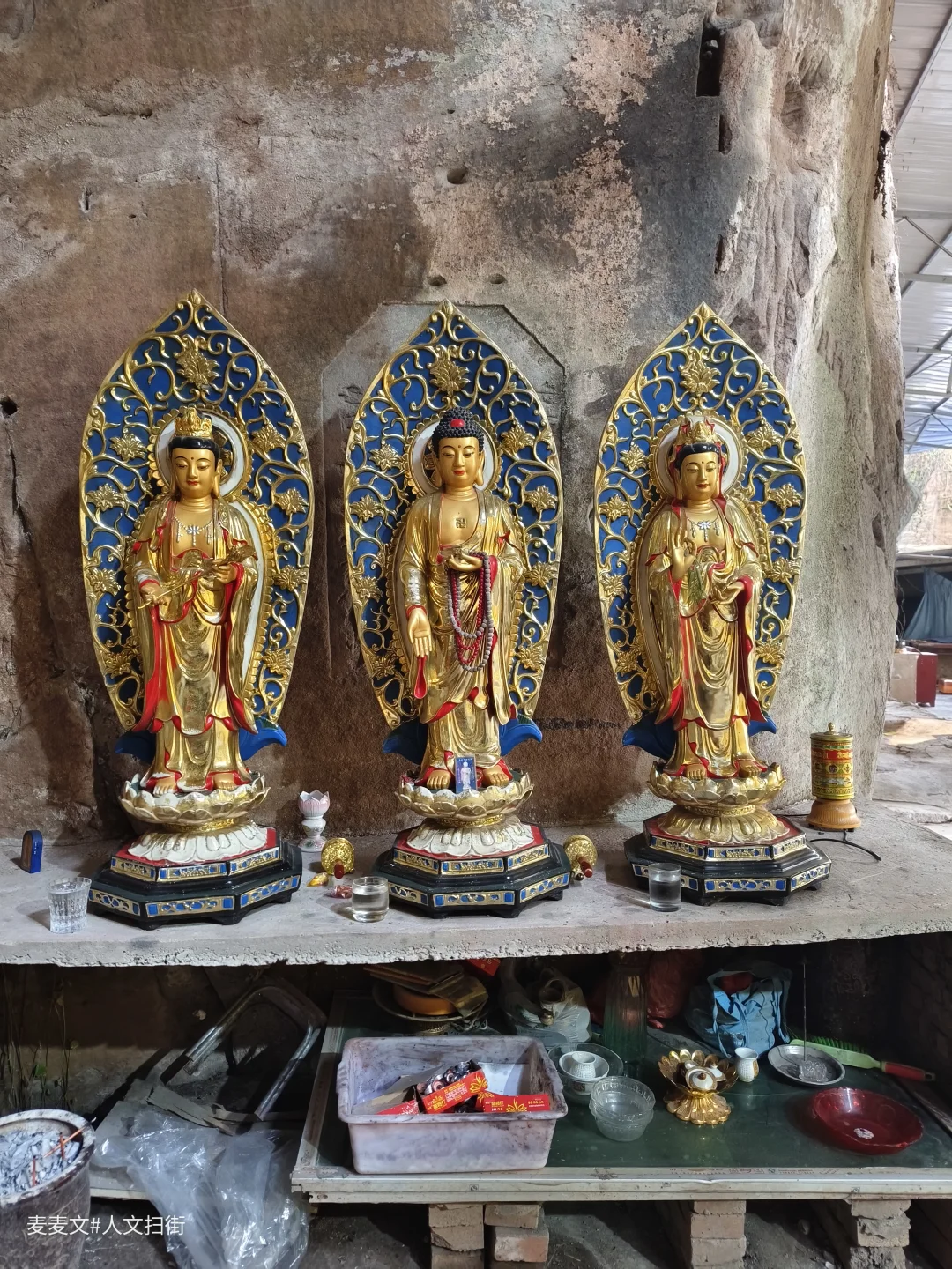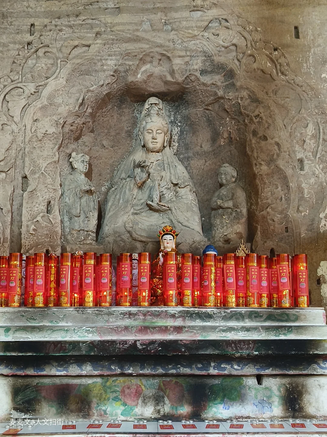 在四川省广安市岳池县九龙镇九龙堰村一组,藏着一处被时光温柔包裹的石刻——冯家湾摩崖造像。主龛的观音造像古朴端庄,虽经数百年风化,衣纹仍依稀可见,左右侍立的童子灵动依旧。岩壁上的造像与现代的祈福灯、功德箱交织,古老的信仰在烟火气中延续。另一龛重塑的地藏菩萨色彩鲜亮,与斑驳的岩壁形成强烈的时空碰撞,诉说着传统信仰的当代生命力。