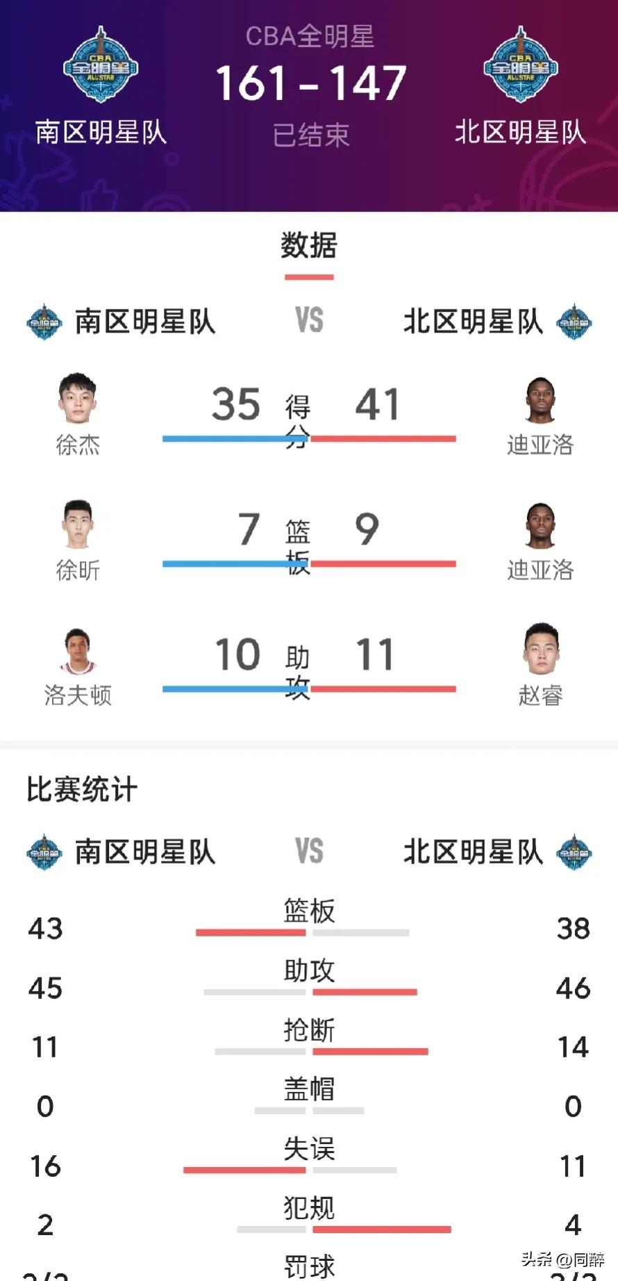 失之东偶,收之桑榆! 徐杰在痛失个人技巧赛冠军后,率领南方明星队在下半场一鼓作气击败北方明星队,双方最终比分定格在161比147。 尽管北方明星队的迪亚洛爆砍全场最高的41分,无奈MVP仍然被同样表现优异的获胜一方的徐杰斩获。 CBA全明星周末,南方明星可谓收获满满,包囊了个人技巧赛、三分大赛、扣篮大赛和全明星正赛的所有冠军,这从一个则面也证明了现在的CBA联赛南强北弱的实事,南方球队拥有更多天赋和能力超群的球员,当然联赛冠军最终归属还要看多方面因素,如外援、教练以及俱乐部等都是左右冠军最终归属的重要因素。 路漫漫其修远兮,各支队仍将上下而求索! 徐杰出场25分钟高效获得35分,并有4个篮板、6个助攻、一次抢断,外加终场前的一次表演性扣篮。