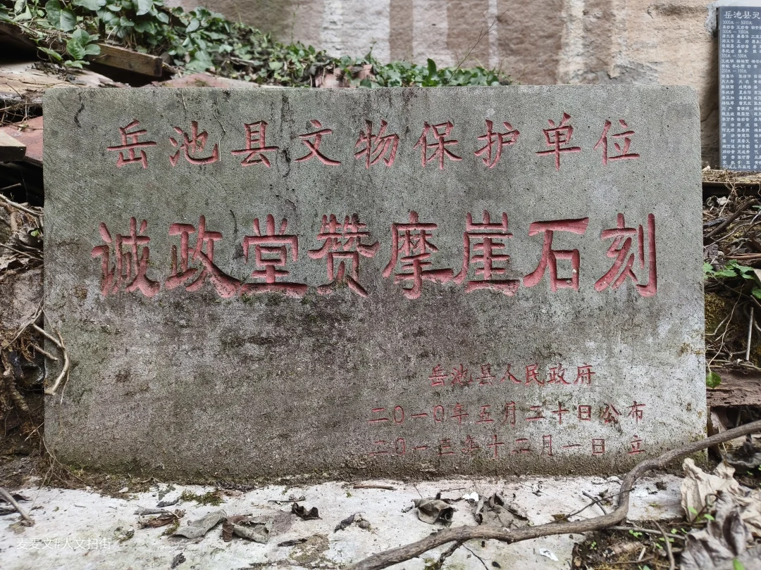 如今,诚政堂赞摩崖石刻隐于藤蔓与岩壁间,字迹虽经风雨,却仍清晰可辨。它作为岳池县文物保护单位,不仅是历史的见证,更提醒着后人:为政之道,在于真诚,在于养民。