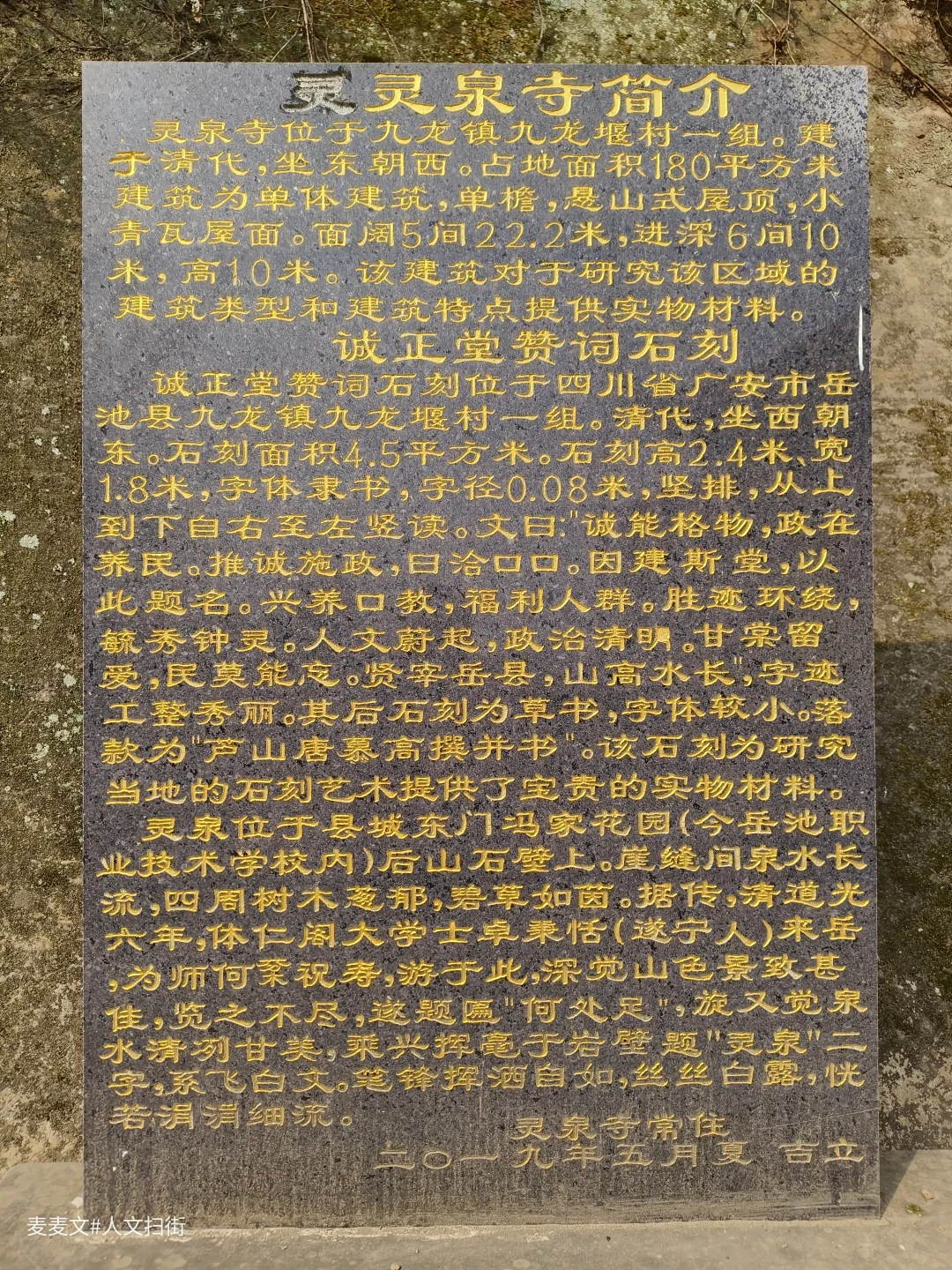 在岳池灵泉寺后山的岩壁上,嵌着一块清代摩崖石刻——《诚政堂赞》。它由芦山唐慕高撰并书,是岳池县文物保护单位,也是研究川东石刻艺术与廉政文化的珍贵实物。