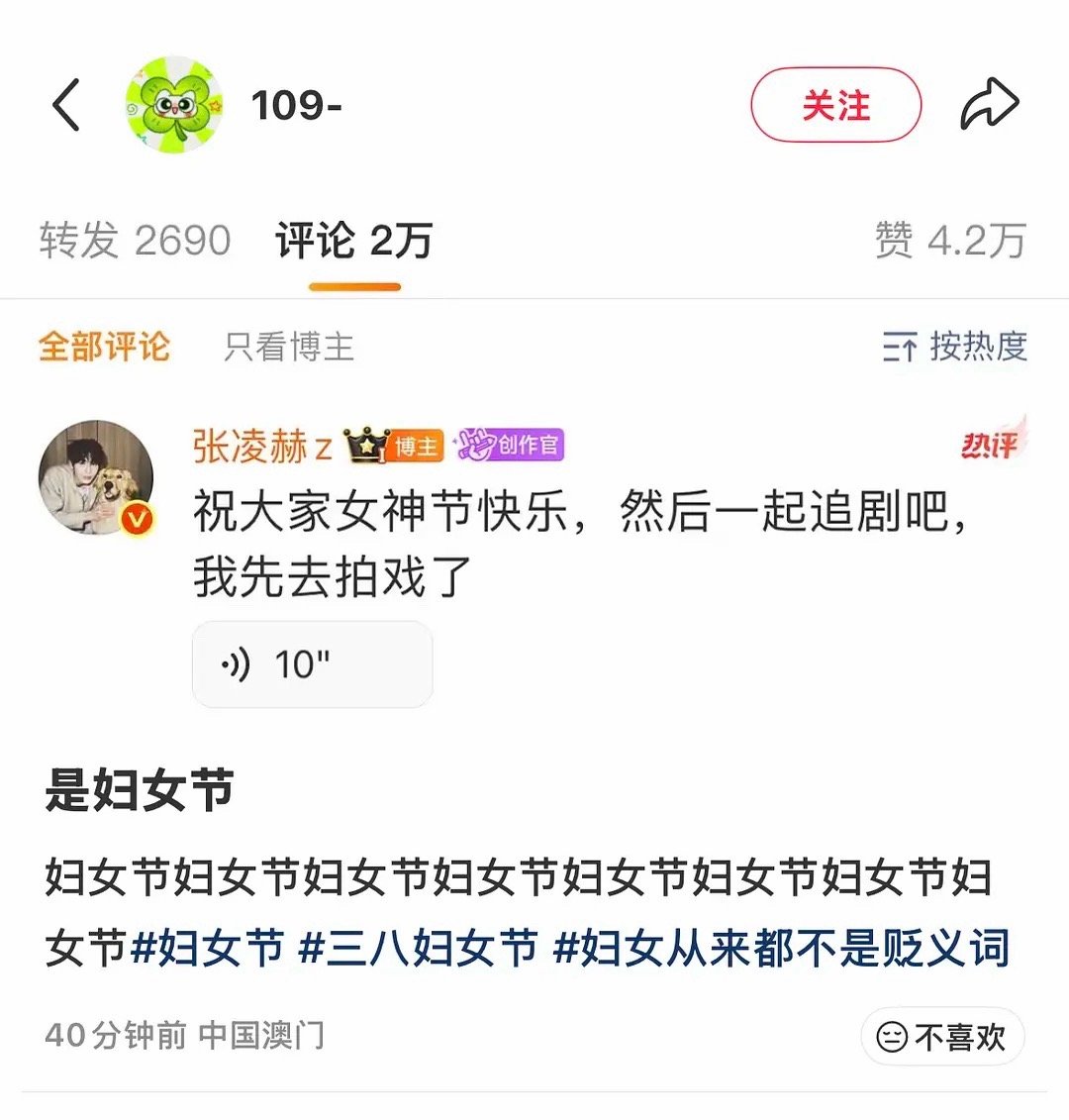 张凌赫说女神节也被审判了到处都屠屏