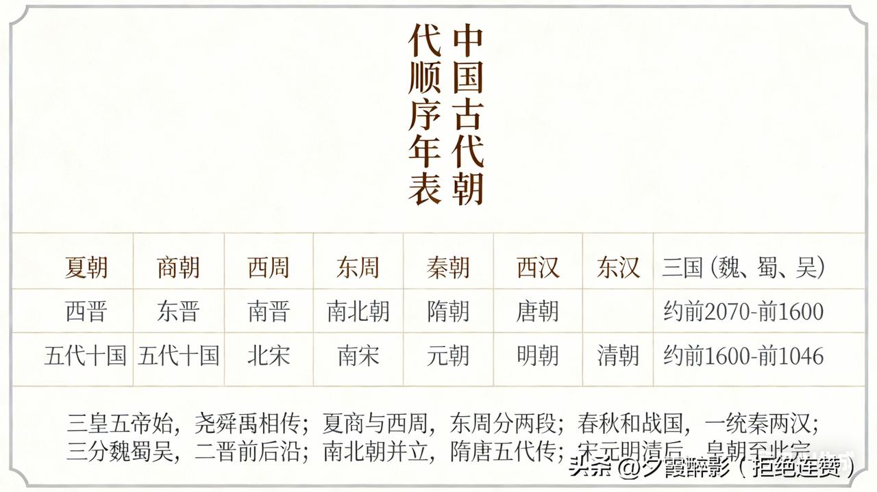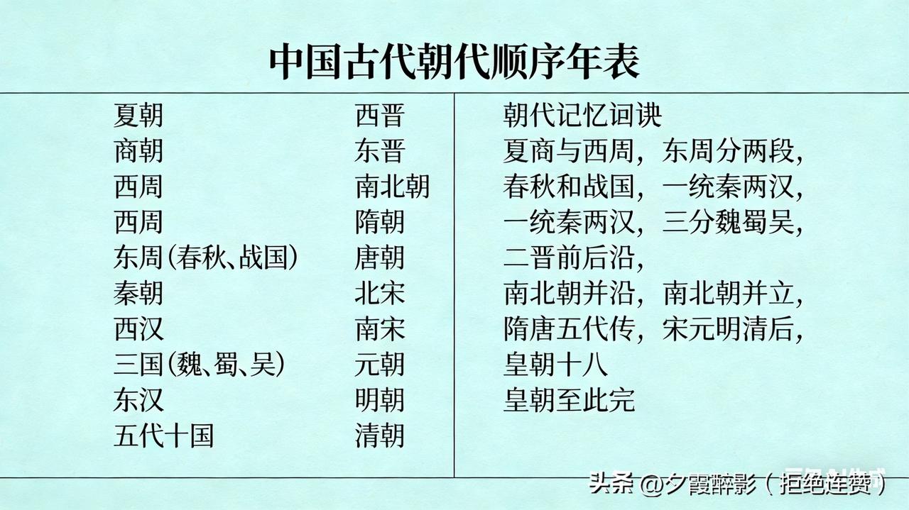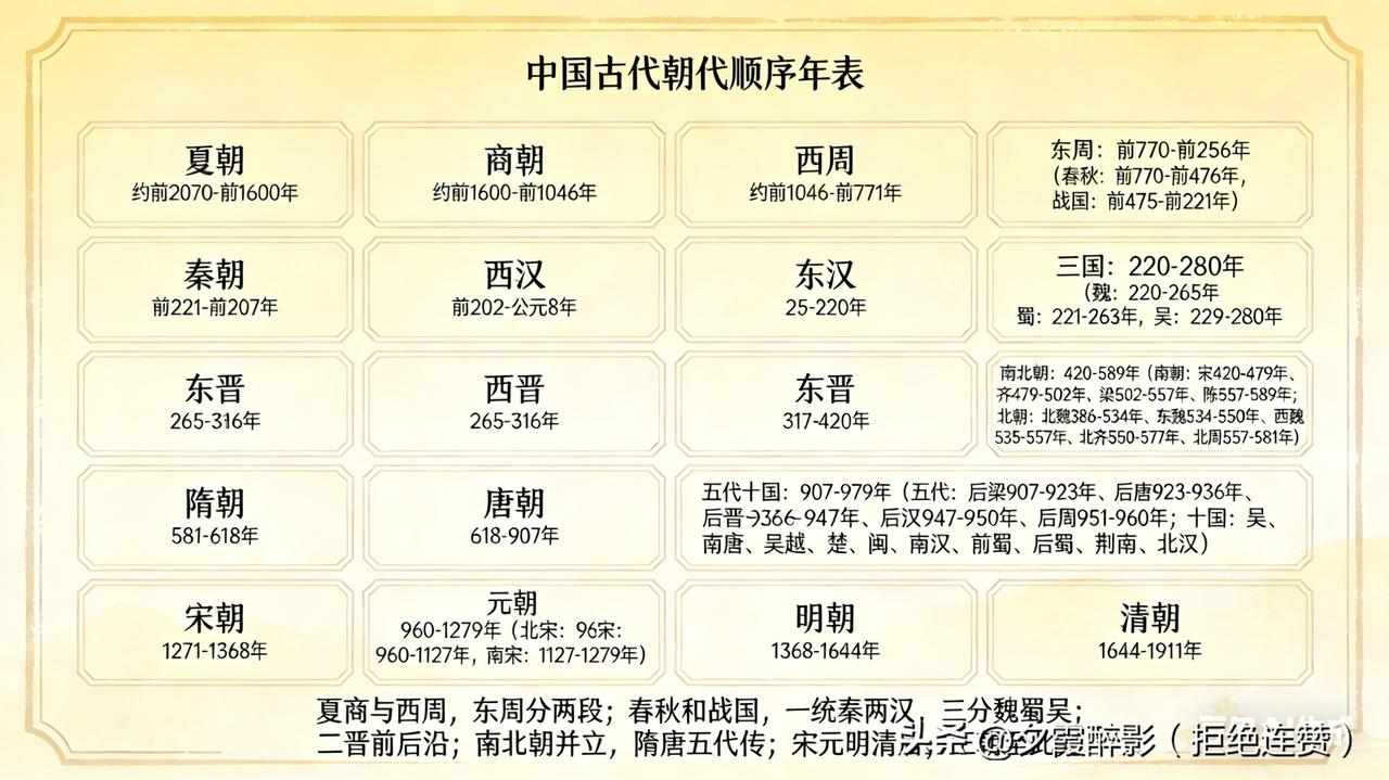 ? 上下五千年华夏文明,朝代更迭不断,完整的顺序你真的记全了吗?这份极简年表,好记又实用,建议收藏! 1. 夏朝:家天下开端,首个世袭王朝 2. 商朝:甲骨文、青铜文明大放异彩 3. 西周:分封制、礼乐文明奠定根基 4. 东周:分春秋战国,诸侯争霸百家争鸣 5. 秦朝:六国一统,首个大一统封建王朝 6. 西汉:强汉雄风,丝绸之路贯通中外 7. 新朝:短暂改制,历史过渡王朝 8. 东汉:光武中兴,文脉延续 9. 三国:魏蜀吴鼎立,英雄辈出 10. 西晋:短暂统一,时局动荡 11. 东晋:偏安江南,文脉留存 12. 南北朝:南北并立,民族大融合 13. 隋朝:统一南北,科举运河影响深远 14. 唐朝:盛世华章,万邦来朝 15. 五代十国:政权更迭,割据纷争 16. 北宋:经济繁荣,文化昌盛 17. 南宋:偏安江南,经济重心南移 18. 元朝:疆域辽阔,行省制度沿用至今 19. 明朝:天子守国门,制度革新 20. 清朝:最后一个封建王朝,奠定近代版图 熟记朝代口诀,轻松理清历史脉络: 夏商与西周,东周分两段; 春秋和战国,一统秦两汉; 三分魏蜀吴,二晋前后沿; 南北朝并立,隋唐五代传; 宋元明清后,皇朝至此完。 这些朝代顺序,你平时能脱口而出吗? 中国历史 朝代顺序 历史知识 传统文化 (来源于网络)