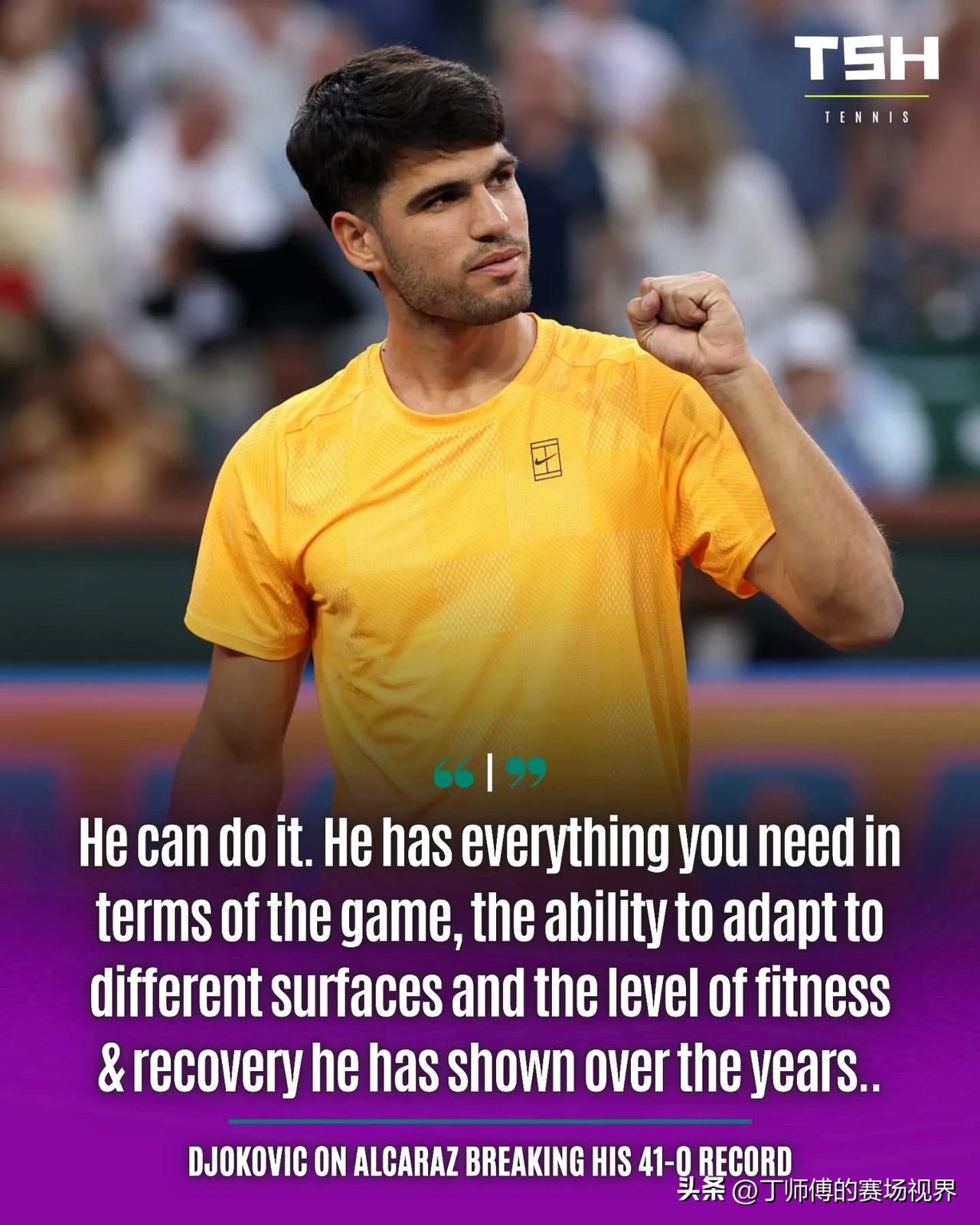 德约科维奇谈阿尔卡拉斯打破他的41胜0负纪录:“他对我们的运动贡献巨大,他这么年轻所取得的成就令人瞩目。关键在于保持身体健康,如果他保持健康,他有能力赢下他参加的所比赛,我祝愿他取得更多胜利。我认为他能做到,他具备比赛所需的一切素质,覆盖所有类型的场地,并且多年来展现出了极佳的体能和恢复能力。” 毫无疑问阿尔卡拉斯就是这个时代绝对的王者,德约科维奇仿佛在这个年轻人身上看到了自己巅峰时候的样子,大家觉得西班牙人能够打破德约科维奇的纪录吗。