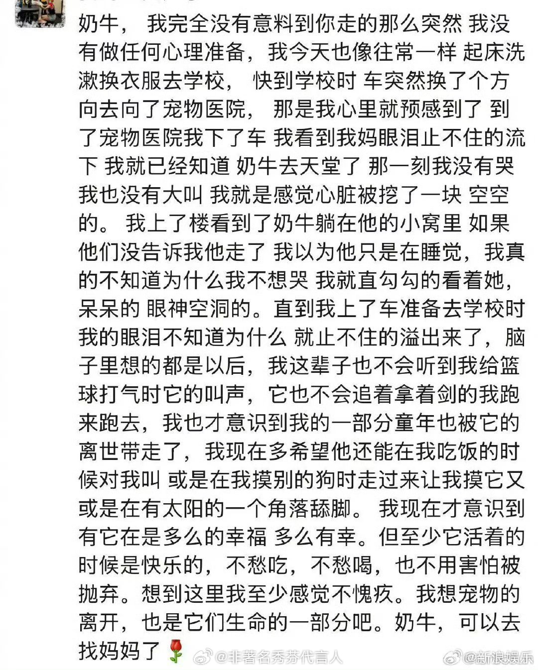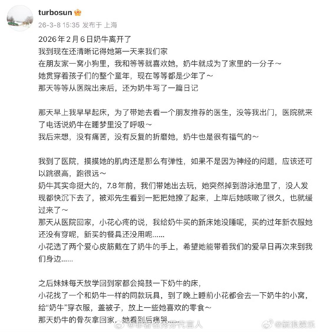 孙俪家的小狗奶牛去世了感受到了蓬勃的爱意呜呜呜