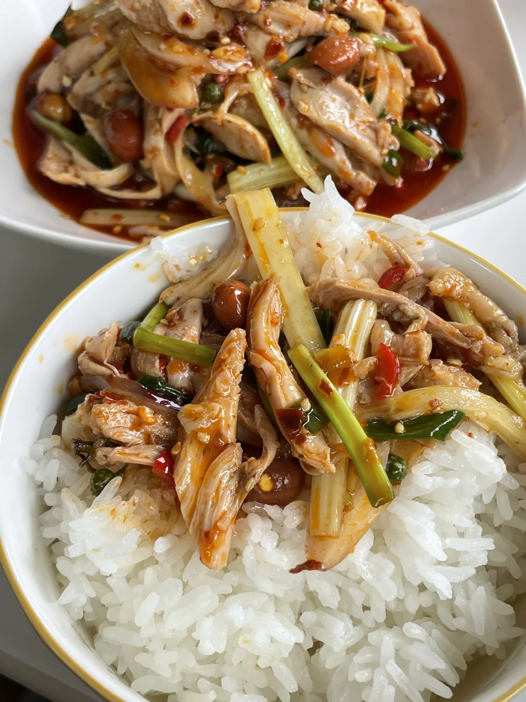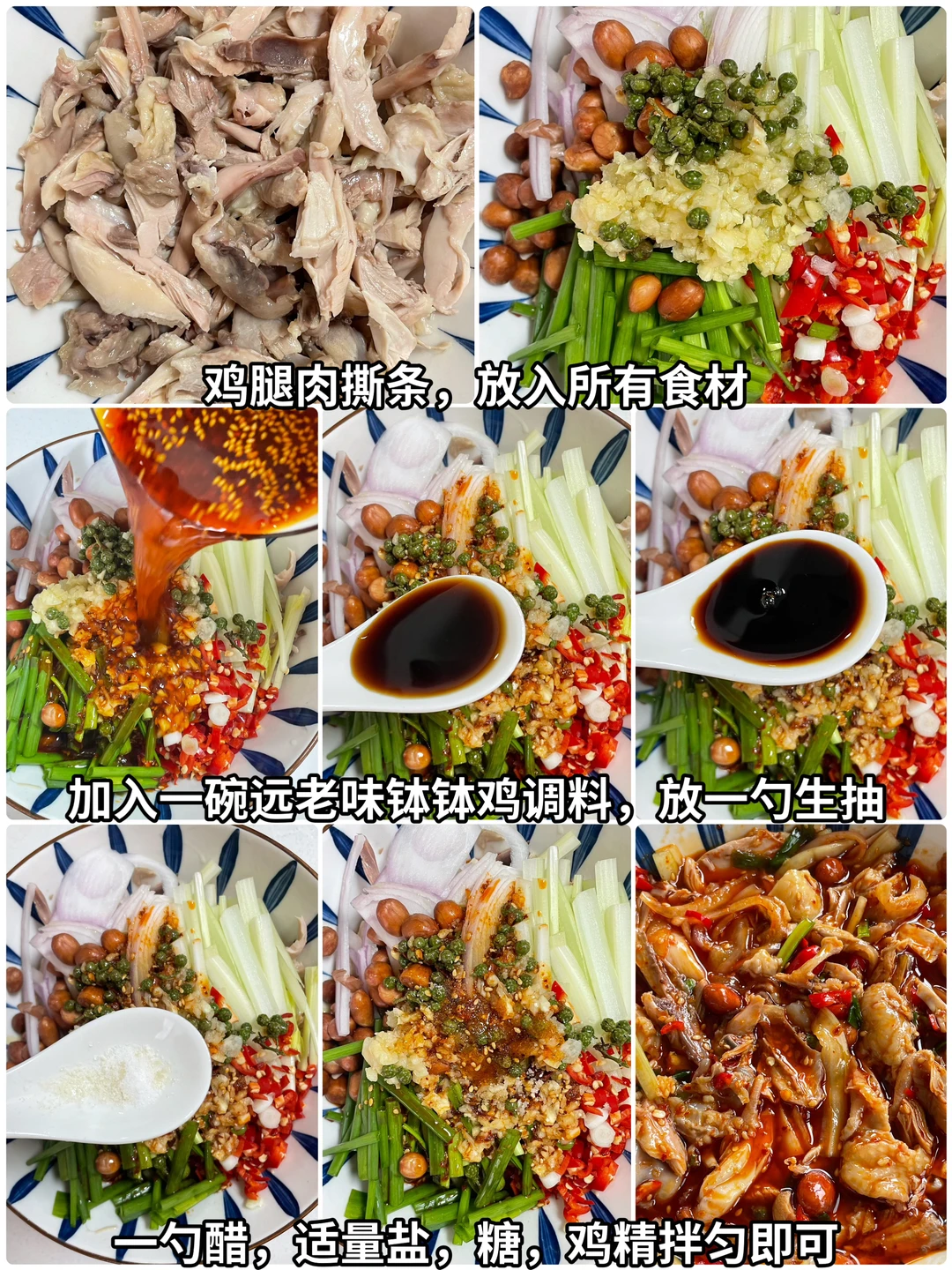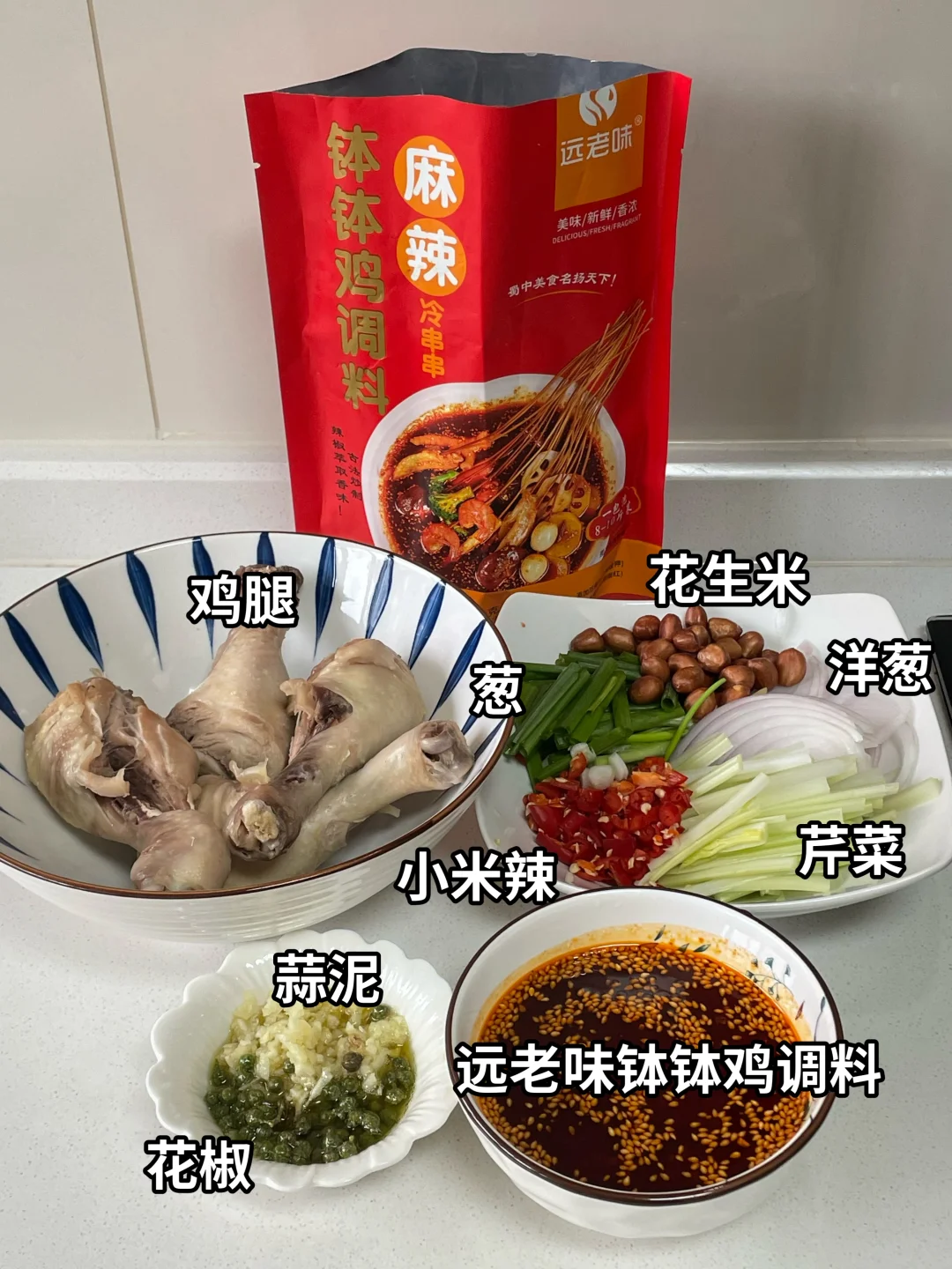 快去做,不吹牛,真的老好吃了!!! 姐妹们,今天给大家做一个香辣花椒鸡,我前两天在外面买了一份,花了28,分量还没有这么多,回来赶紧复刻了一下。毫不夸张,就是外面卖的那个味道,喜欢川味拌菜的朋友们完全可以去试一下,而且在家做我觉得比较卫生一些,自己想吃多少做多少。喜欢的姐妹试试吧。 🌶️食材:鸡腿,洋葱,芹菜,花生米,远老味钵钵鸡调料 👩‍🍳做法: 1⃣️将买回来的鸡腿冷水下锅,放入葱姜、料酒、八角、桂皮、香叶、花椒,水开打出浮沫,然后煮至鸡腿肉熟,捞出撕条备用。 2⃣️切一些洋葱丝,准备一些芹菜段,大葱小葱切段,小米辣切碎,再来一些花生米。蒜泥和花椒放入小碟中,淋上热油激发出香味。要想这个菜吃出外面卖的味道,就来一碗远老味钵钵鸡调料,按照说明调这么一小碗备用。 3⃣️将撕好的鸡腿肉放入碗中,再放入准备好的洋葱、芹菜、花生米、葱段、小米辣、蒜泥、花椒。然后倒入我们准备好的远老味钵钵鸡调料,放一勺生抽,一勺醋,适量的盐糖鸡精拌匀即可。 这个菜真的是巨好吃,喜欢的姐妹一定要试一试。