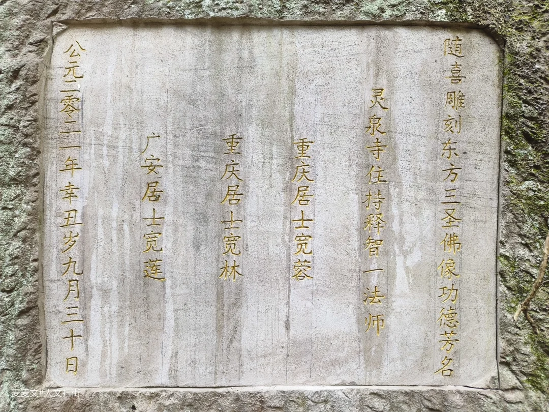 此次前来,我并未拍到古老的灵泉摩崖石刻,却在崖壁间见到了后来雕刻的摩崖造像。崖壁上精心雕凿的东方三圣造像庄严古朴,药师佛居中,日光菩萨与月光菩萨分立两侧,造像线条流畅,神态慈悲,与自然岩壁融为一体。