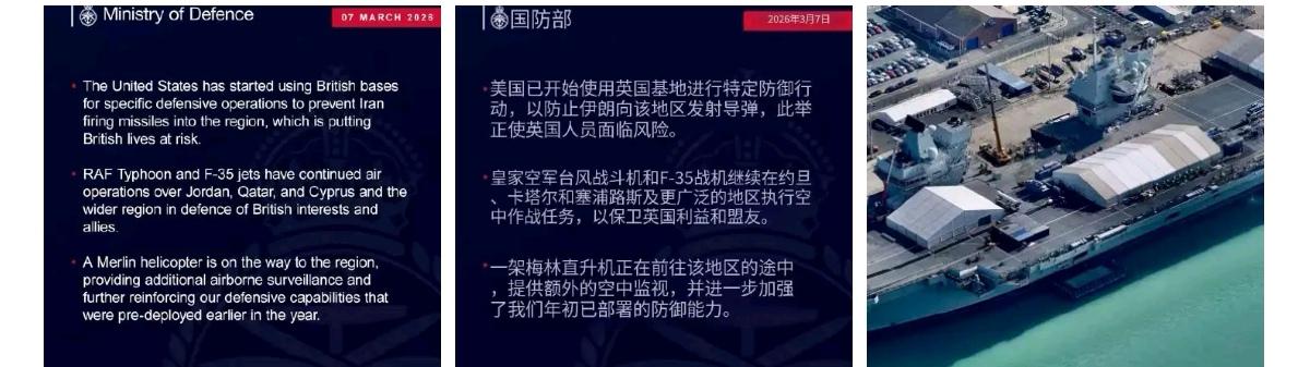 英国为应对中东紧张局势正加强军事部署。 ①英国国防部报告称,美国已开始利用英国的军事基地对伊朗发动攻击。英国的“台风”战斗机和F-35战斗机继续在约旦、卡塔尔、塞浦路斯及更广泛地区上空执行空中任务。同时,英国一架“梅林”(也称“灰背隼”)直升机也将部署到中东地区(图一图二)。 ②英国天空新闻报道称,英国海军要求“威尔士亲王号”航母(图三)做好前往中东地区的准备,并将调动通知时间缩短至五天。