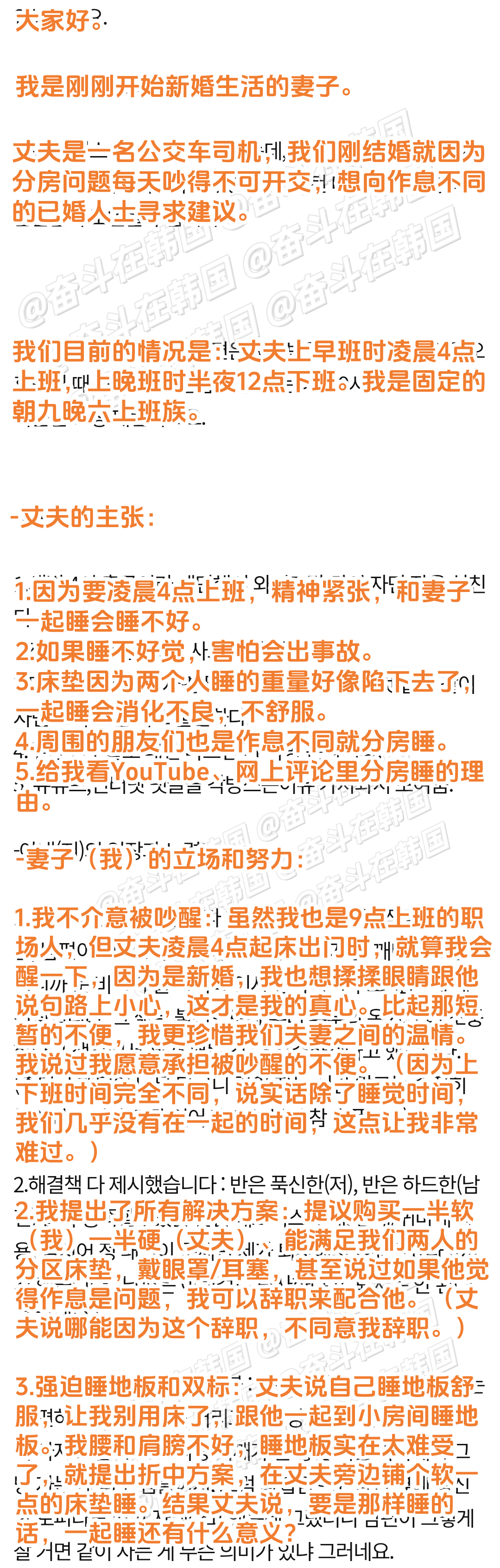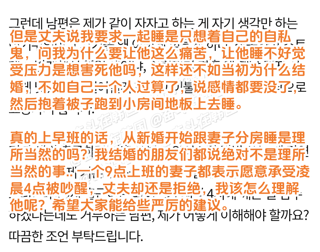 韩网热帖:新婚,与我作息不同的丈夫要求分房睡,是我太自私了吗? 海外新鲜事 热点现场
