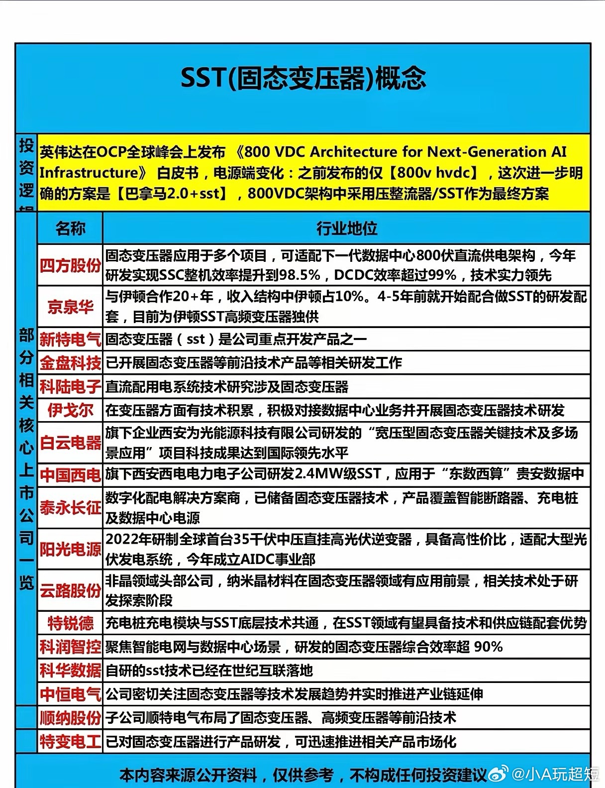 137、电算协同之电力建设碳化硅固态变压器方向相关概念梳理一、碳化硅(SiC)是固态变压器(SST)的核心器件,SST是AI数据中心供电革命的关键方案。● 传统:10kV→400V→48V→12V多级降压,效率<85%、占地大、损耗高。● 新架构:10kV中压直转800V高压直流(HVDC),一步到位,SST+SiC是实现核心。二、碳化硅(SiC)为何是SST的“心脏”● 高耐压:击穿场强是硅的10倍,适配10kV中压系统。● 低损耗:开关/导通损耗远低于IGBT,高频下优势拉满。● 耐高温:可在200℃+稳定工作,简化散热。● 高频化:支撑SST开关频率达100kHz+,实现极致小型化。三、SiC固态变压器(SST)核心优势(数据中心场景)● 效率封神:整机效率97.5%–98.5%,比传统方案高3%–5%。● 体积暴减:占地缩63%–90%、重量减80%,10MW仅需2个集装箱。● 供电极简:10kV AC→800V DC一步直供GPU,省掉UPS/多级整流。● 智能可控:电压/功率实时调节、故障穿越、无功补偿,适配算力波动。● 降本增效:20MW AI数据中心年节电400万度、省电费320万元、减碳2800吨。四、成本与产业链● 成本结构:SiC器件占40%(最大),高频磁芯/变压器15%,控制/散热/结构各15%。● 降本趋势:6/8英寸SiC衬底量产,成本较进口低20%–30%,SST整体成本已降55%。● 头部玩家:○ 国际:伊顿、台达、西门子(英伟达供应链)。○ 国产:中国西电(2.4MW/10kV,贵安数据中心落地)、四方股份(800V HVDC)、金盘科技(亚马逊/微软)。五、数据中心应用价● PUE显著下降:从1.3+降至1.1以下,更符合绿电/碳关税要求。● 空间变现:省出机房可多部署上百个GPU机柜,年增收千万级。● 供电可靠:电压波动<3%,避免GPU集群故障。● 适配800V HVDC:英伟达/谷歌主推,下一代AI数据中心标配。六、落地进展● 美团:全球首个SST智能直流供电系统,2026年4月投用。● 中国西电:10kV/2.4MW SST在贵安数据中心稳定运行。● 四方/金盘:批量交付,切入北美云厂商供应链。