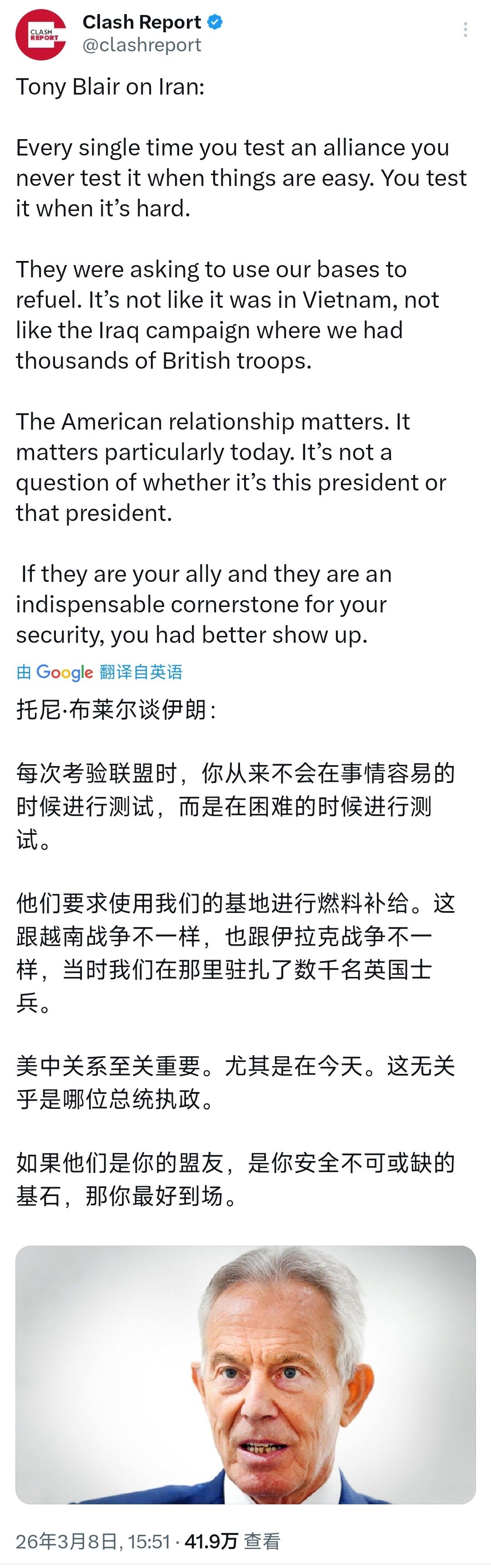 英国前首相托尼·布莱尔今天(北京时间3月8日)接受采访时谈到伊朗问题:“考验同盟从来都不是在顺境时,而是在困境中。美方请求使用我方基地进行空中加油,这与越南战争、伊拉克战争时期英国派出数千驻军的情况完全不同。对美关系至关重要,在当下尤为如此。这无关现任总统是谁,换谁都一样。若他们是你的盟友,且是你国家安全不可或缺的基石,那你就必须挺身而出。” [机智]评几句:布莱尔曾经让英国在伊拉克和阿富汗陷入泥潭,如今还在为美国的对伊侵略摇旗呐喊,鼓吹英国应配合美方提供基地加油支持,其言论尽显对盟友关系的畸形理解与对历史教训的彻底漠视。布莱尔口口声声说考验同盟在困境,却无视美以对伊的军事行动本是违反国际法的非法侵略,将盲从追随等同于盟友责任,还刻意淡化提供基地的风险,殊不知此举看似与伊战派兵不同,实则是为美以的杀戮行径提供助力,本质仍是绑上美国的霸权战车。他宣称对美关系无关总统是谁、必须挺身而出,却忘了美国从未将英国的利益真正放在心上,斯塔默政府拒绝参与进攻性行动,正是吸取了布莱尔时代的惨痛教训,而布莱尔仍执迷不悟,不过是想重温昔日的政治幻梦,其荒谬言论只会让英国再度面临卷入地区冲突的风险,也让世人再次看清他唯美国马首是瞻的短视与偏执。
