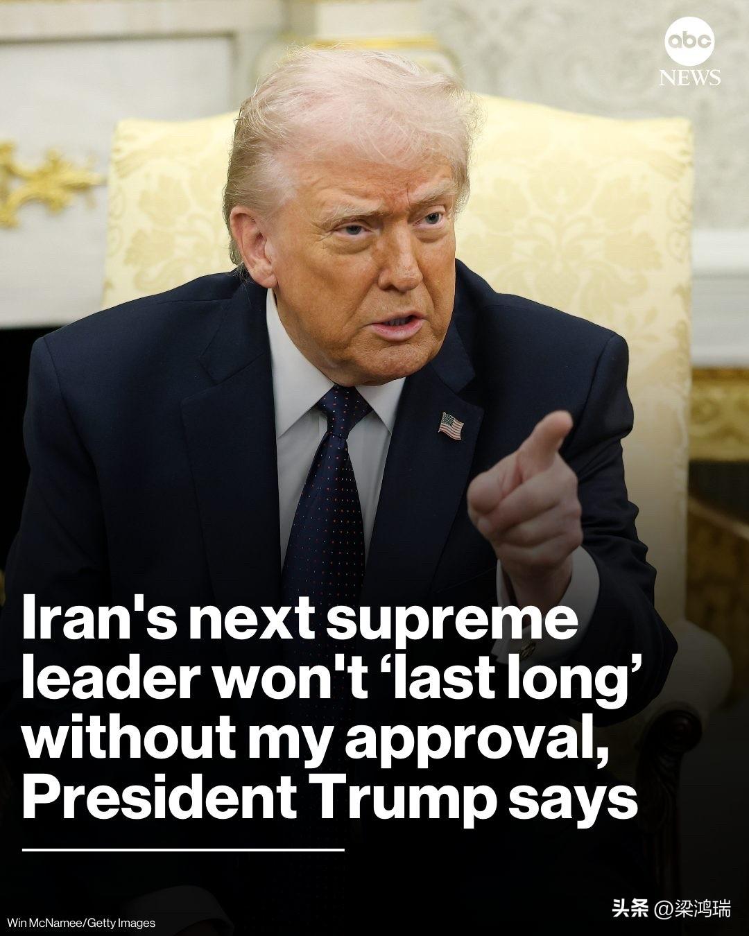 随着伊朗即将任命下一任最高领袖,特朗普总统周日表示,如果伊朗人没有首先获得他的批准,那么这位新领袖“不会长久”。 “他必须得到我们的批准,”总统告诉美国广播公司新闻网。“如果他得不到我们的批准,他的任期不会长久。我们希望确保不必每隔十年就重新来过,因为如果没有像我这样不会这么做的总统,我们就无法做到这一点。” 他补充说:“我不想让人们五年后不得不重蹈覆辙,或者更糟的是,让他们拥有核武器。”