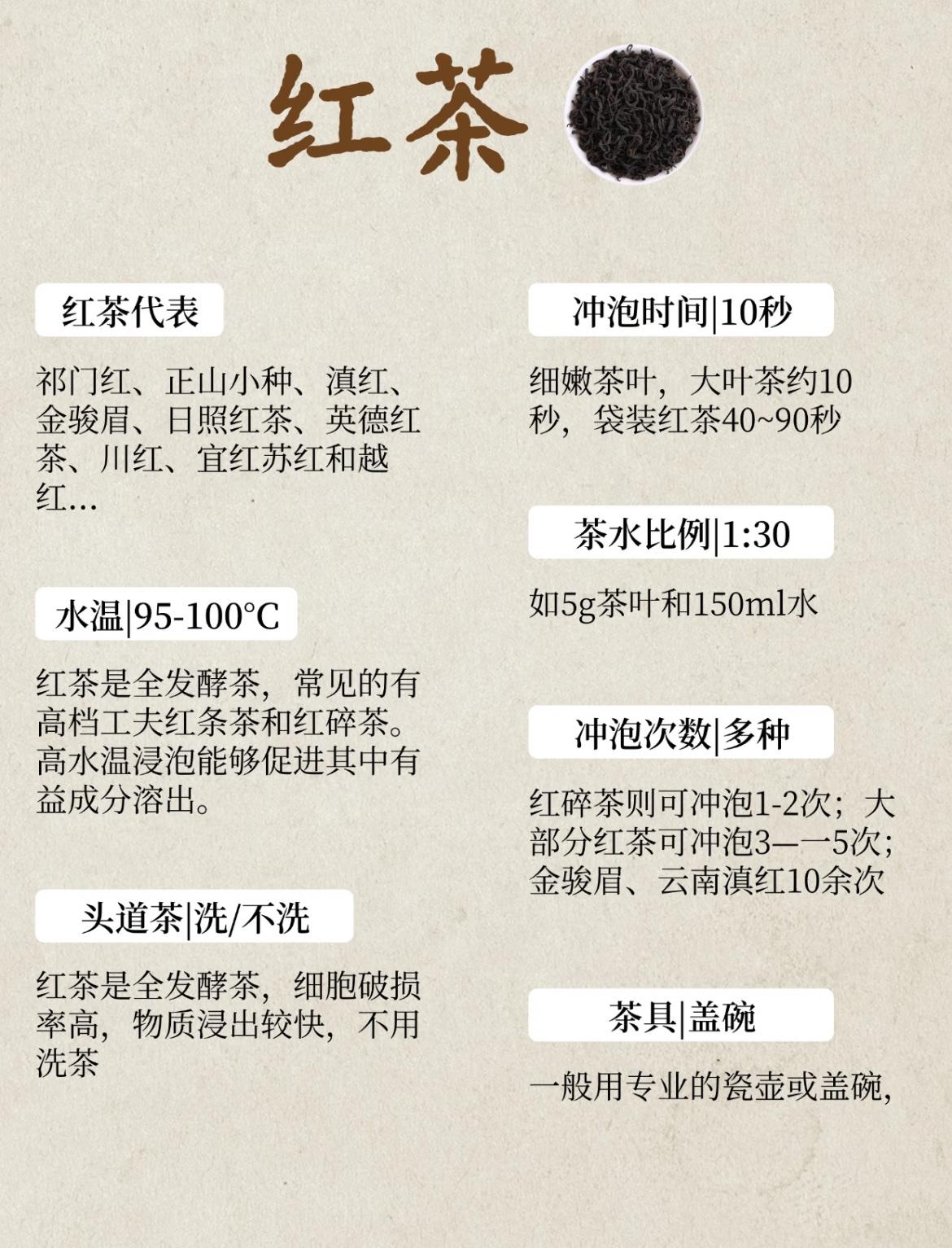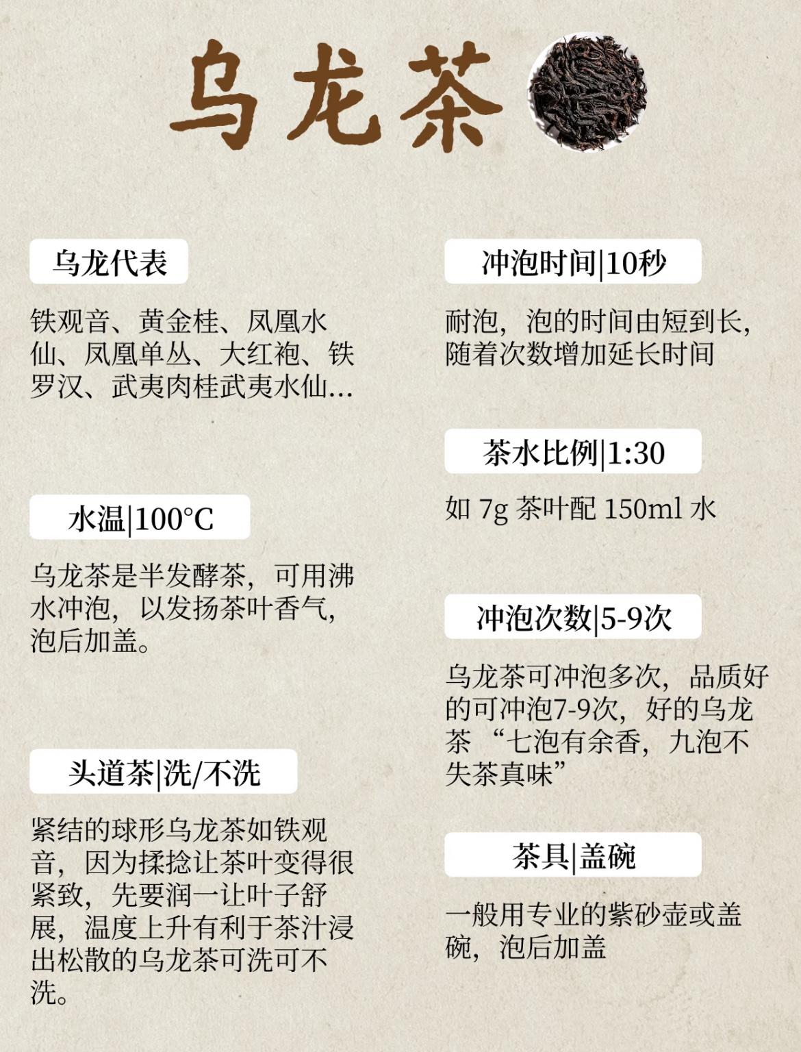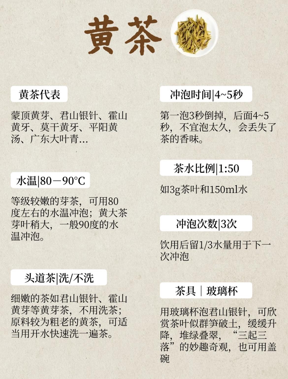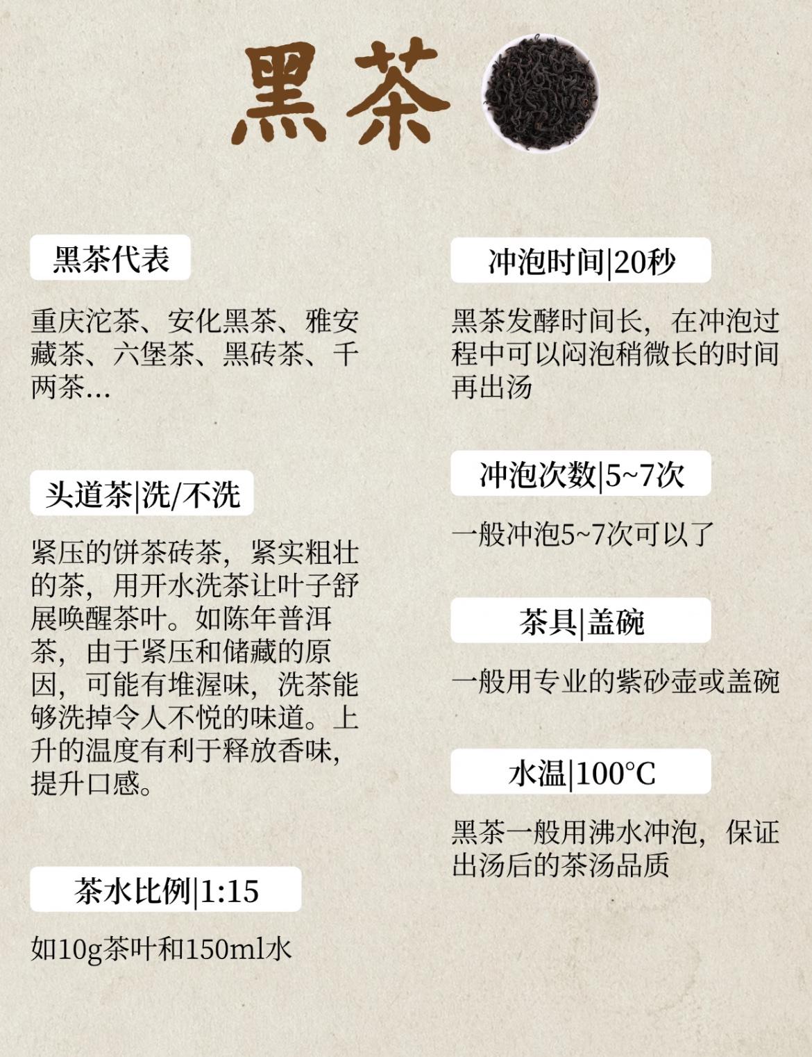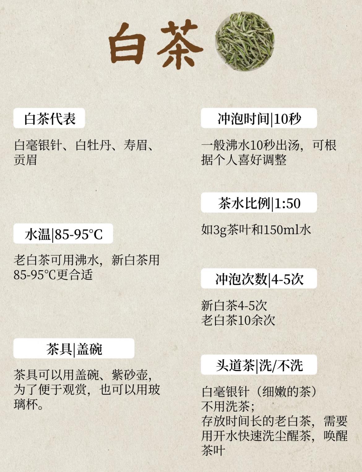 六大茶类通用泡茶公式 1. 绿茶(龙井、碧螺春、毛尖) 水温:75-85℃(沸水晾1-2分钟) 投茶量:1:50(3g茶+150ml水) 时间:第1泡30-40秒,逐泡加10秒 要点:上投/中投法,不闷泡,防苦涩 2. 黄茶(君山银针、霍山黄芽) 水温:80-90℃ 投茶量:1:50(3g/150ml) 时间:第1泡30秒,逐泡加时 要点:轻泡慢出,保留鲜爽甜感 3. 青茶(乌龙茶:铁观音、大红袍、凤凰单丛) 水温:100℃沸水 投茶量:1:22(5-7g/110ml盖碗,占碗1/2) 时间:第1泡10-15秒,逐泡加5-10秒 要点:高冲快出,多泡留香,必须沸水 4. 红茶(金骏眉、正山小种、祁红) 水温:90-95℃ 投茶量:1:50(3-5g/150ml) 时间:第1泡20-30秒,逐泡加时 要点:不闷煮,避免发酸,出汤要快 5. 黑茶(普洱熟茶、安化黑茶、六堡茶) 水温:100℃沸水 投茶量:1:30(5g/150ml) 时间:第1泡20秒,逐泡加10-20秒 要点:可润茶1次,耐泡,可闷泡 6. 白茶(白毫银针、白牡丹、寿眉) 水温:银针85-90℃,老白茶100℃ 投茶量:1:40(3-5g/150ml) 时间:第1泡30秒,老白茶可久泡 要点:新茶清甜,老茶可煮,越陈越香 万能口诀(好记版) 绿茶黄茶水温低,快泡不涩香气齐 乌龙红茶沸水冲,快出汤口味更浓 白茶黑茶耐泡久,老茶可煮香更厚 少投茶,快出汤,多泡几次味更长