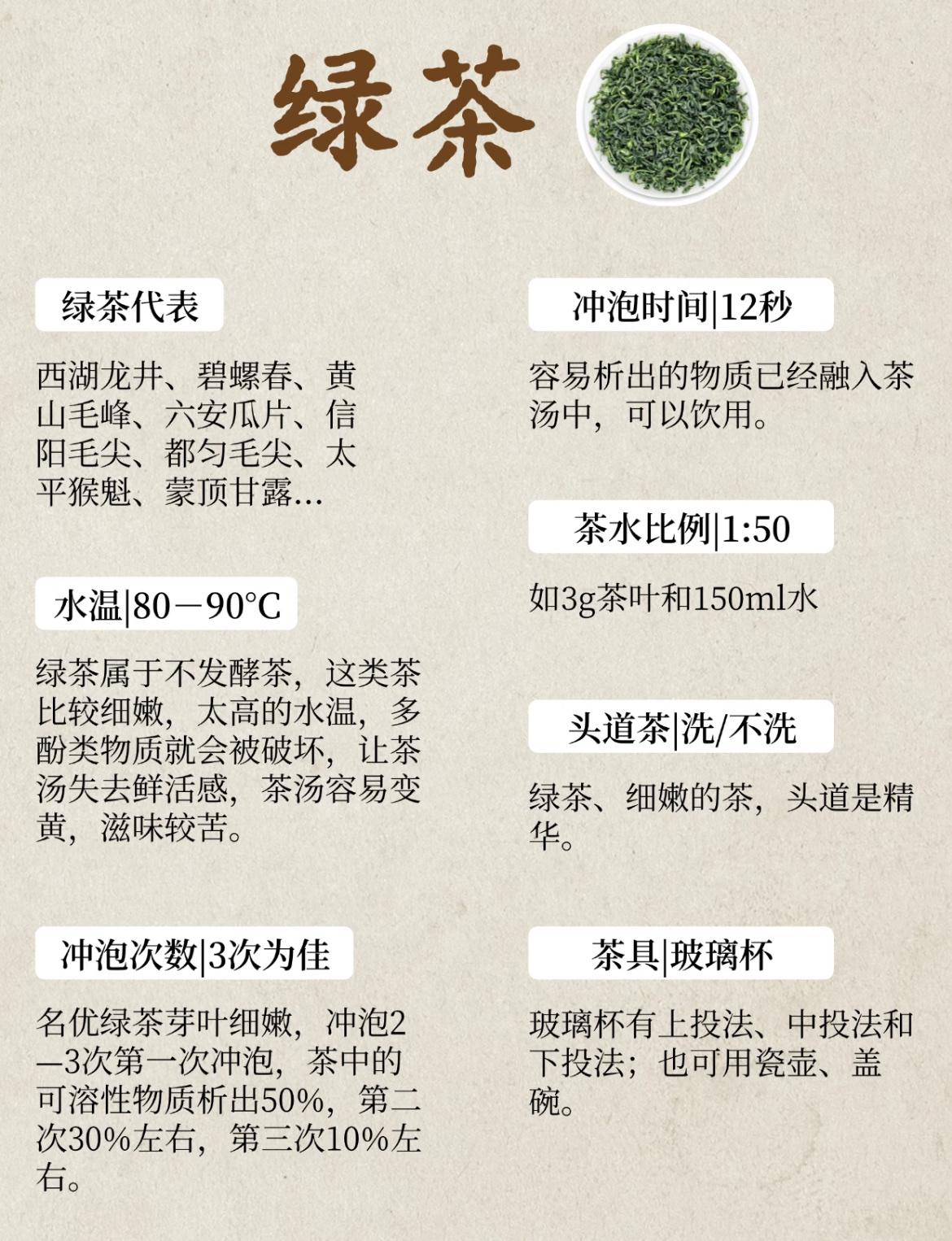 六大茶类通用泡茶公式 1.绿茶(龙井、碧螺春、毛尖) 水温:75-85℃(