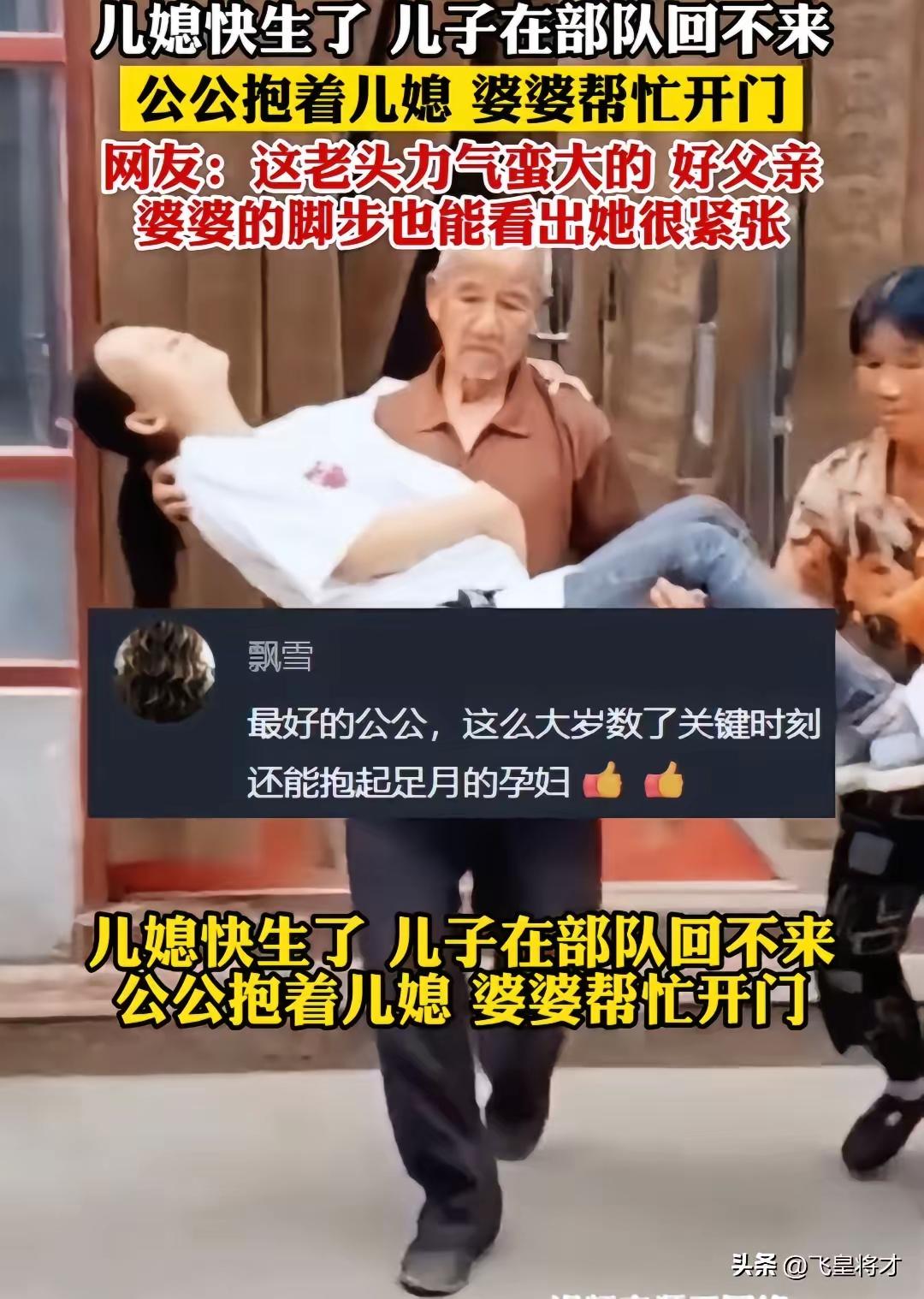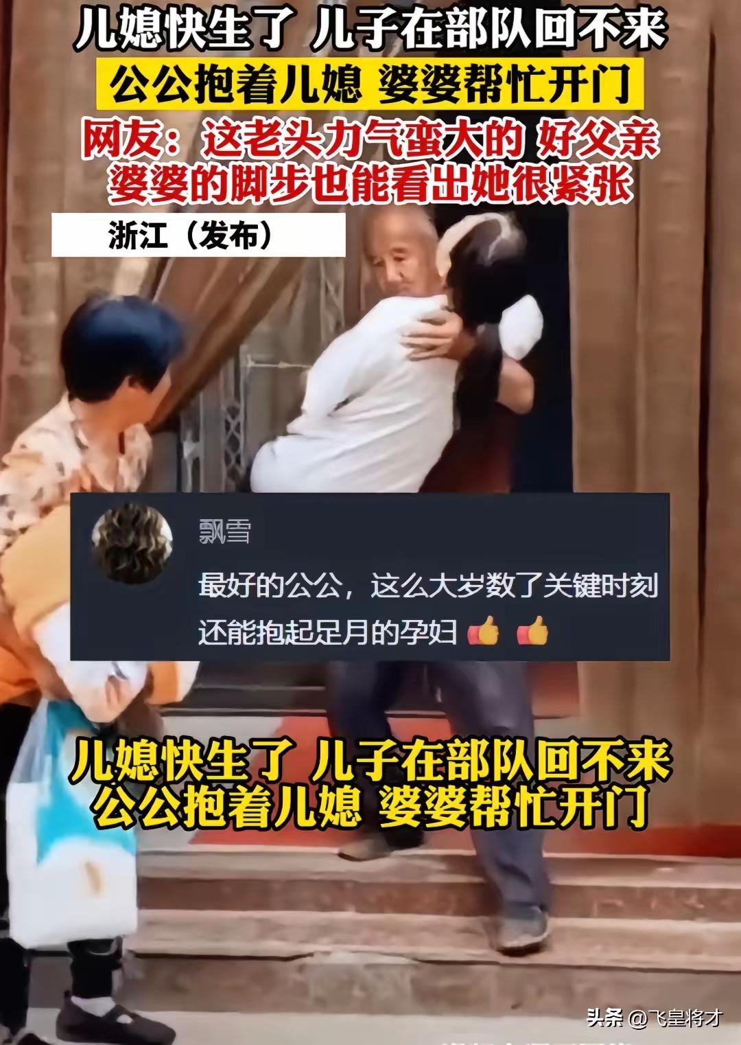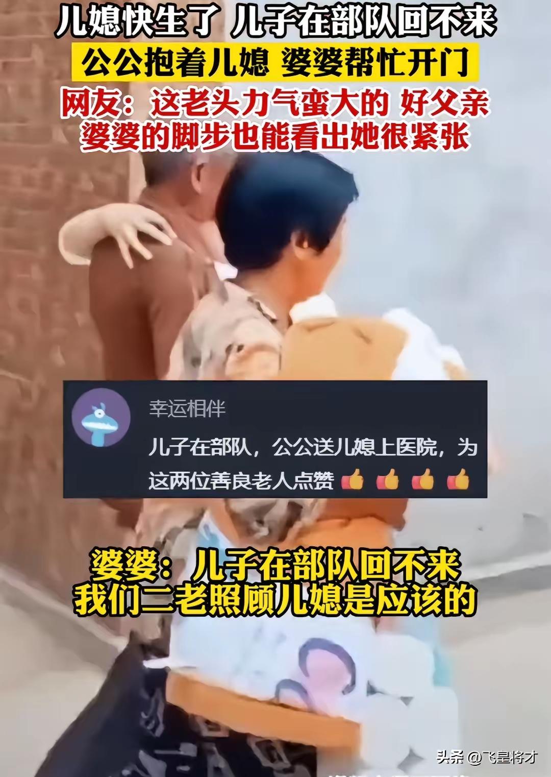 儿媳快生了,儿子在部队回不来。 公公抱着儿媳,婆婆帮忙开门。 网友:这老公力气蛮大的,好父亲,婆婆的脚步也能看出她很紧张。 事发时正是深夜,儿媳突然出现临产征兆,阵痛一阵紧过一阵,根本没办法自己行走。远在部队的儿子接到电话,急得声音都在发抖,可部队有严格的纪律,任务在身根本无法立刻赶回来,只能一遍遍叮嘱家人赶紧送医。家里没有年轻劳力,公公二话不说就弯下腰,小心翼翼将儿媳稳稳抱在怀里,全程不敢有半点晃动,生怕加重儿媳的不适感。 婆婆跟在一旁,手里攥着提前准备好的待产包,脚步迈得又快又急,每一步都带着藏不住的慌张。她顾不上整理自己凌乱的头发,只顾着快步跑在前面打开单元门、楼道门,嘴里还不停轻声安抚儿媳,让她再坚持一下,马上就到医院。公公全程绷着神情,手臂用力稳住身形,平日里看似普通的身躯,在这一刻撑起了全家的慌乱,也撑起了对儿媳最实在的呵护。 这是一个普通的军人家庭,儿子常年驻守在岗位上,守卫着大家的安宁,家里的柴米油盐、大事小情,全都落在公婆和儿媳身上。儿媳怀孕这段时间,儿子只通过视频看过几次,没办法陪在身边产检、照顾,公婆便把所有的心疼和照顾都给了儿媳,饮食上变着花样补充营养,日常里事事迁就忍让,早就把儿媳当成了亲生女儿对待。 网友们盯着视频反复细看,大家关注的从不是公公的力气有多大,而是这份毫无隔阂的亲情。没有血缘相连,却在最危急的时刻挺身而出,没有华丽的语言,只用行动扛起责任。婆婆慌乱的脚步,是长辈对晚辈最真切的担忧,公公沉稳的怀抱,是代替儿子尽到的最踏实的担当,这一幕没有刻意摆拍,全是普通人最本能的善良。 军人的坚守从来不是一个人的事,背后是整个家庭的默默付出与支撑。丈夫在前方保家卫国,无法陪伴在妻儿身边,公婆便主动扛起小家的责任,不让远在部队的儿子有半点牵挂。他们不懂什么大道理,只知道要照顾好儿媳,守护好即将到来的新生命,让儿子能安心履行自己的职责。 送医过程很顺利,儿媳被及时送到医院待产,公婆守在产房外,一刻都不敢离开,时不时向医护人员询问情况。远在部队的儿子,一直守在手机旁等待消息,得知儿媳情况稳定后,这个在训练中从不叫苦的汉子,忍不住红了眼眶,他既对家人充满愧疚,又深深感恩父母的付出。 这段短短十几秒的视频,没有炫酷的特效,没有煽情的台词,却戳中了无数网友的心。当下很多人都在讨论婆媳矛盾、家庭纷争,而这个普通家庭用最朴素的举动证明,好的亲情从来不需要刻意维系,真心换真心,危难时的互相扶持,就是最珍贵的家风。 军人守家国,家人守小家,公婆的担当,撑起了军人的后顾之忧,也诠释了平凡家庭里最动人的温暖。没有惊天动地的壮举,只有细水长流的善待与责任,这才是最值得称赞的人间真情。 各位读者你们怎么看?欢迎在评论区讨论。