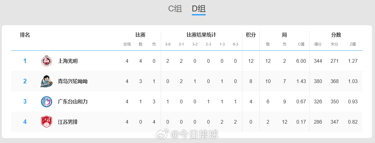 2025-2026中国男排超级联赛 A级季后赛4轮(总第18轮)过后,C组和D组的积分排名。