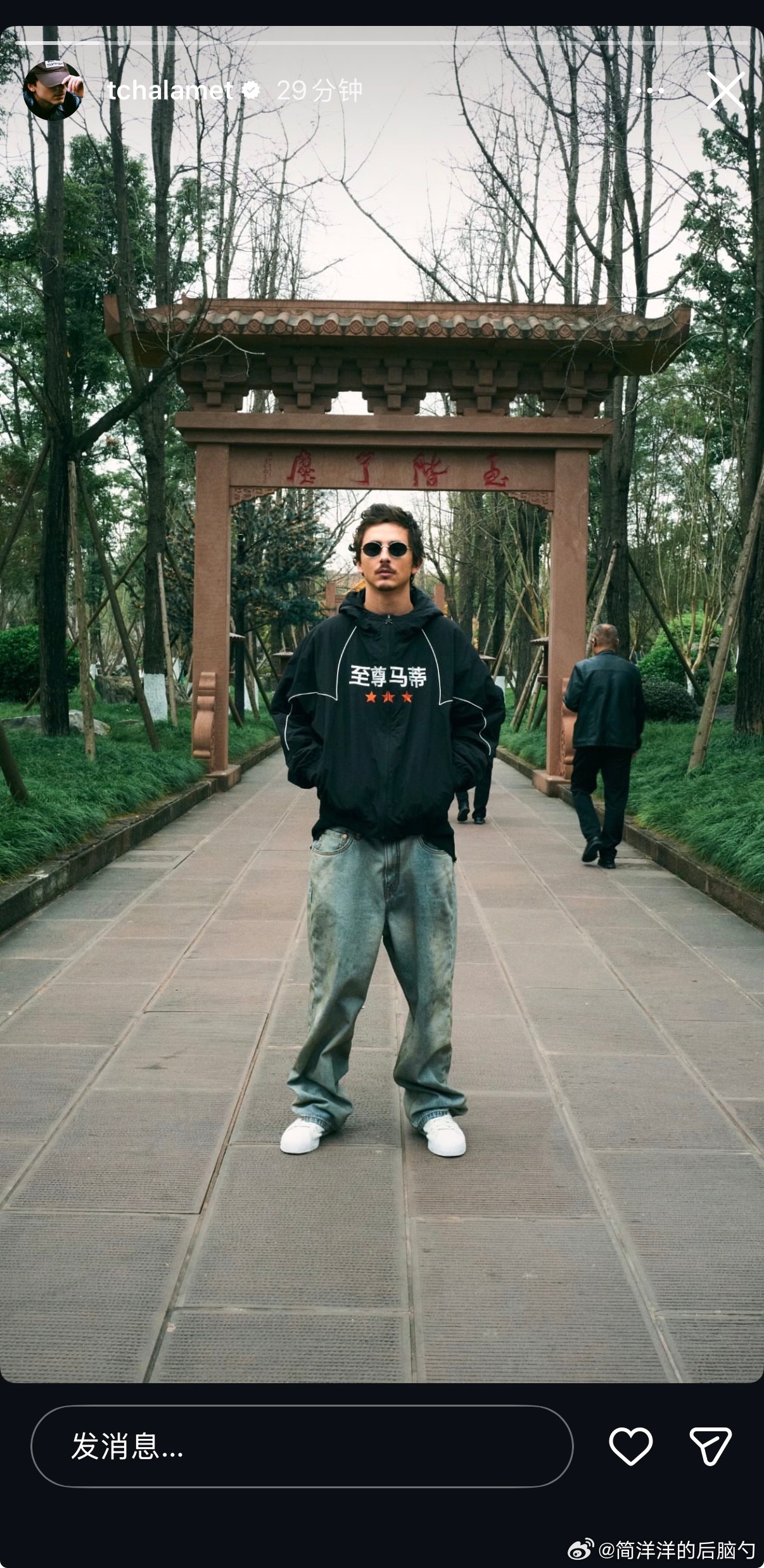 甜茶半夜在ins更新了去成都昭觉寺的照片,很标准的游客打卡照了春节档马上有戏