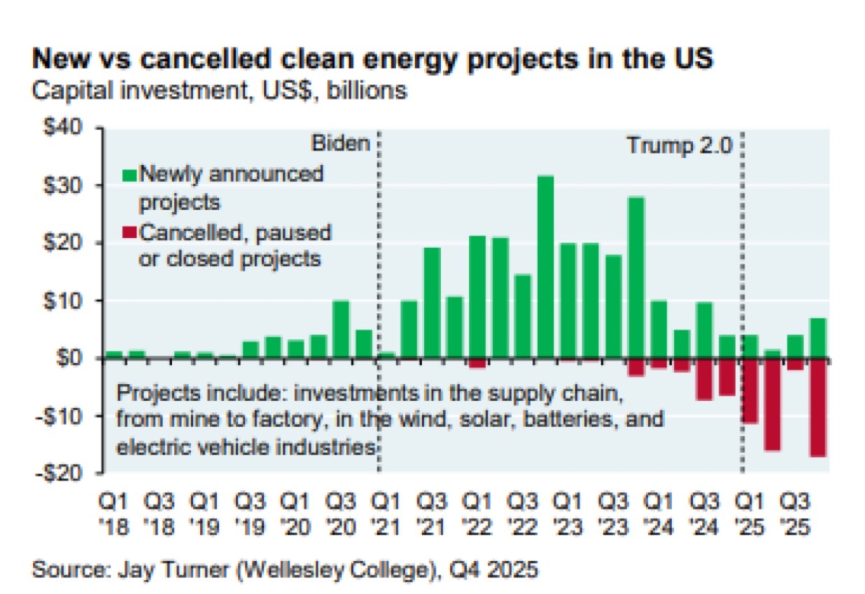 但从2024年开始,取消项目开始增加。进入特朗普第二任期初期(2025年),这一趋势明显加剧:新增项目投资已降至单季度约20亿至70亿美元,而被取消或暂停的项目则扩大到约150亿至200亿美元,显示美国清洁能源投资从此前的快速扩张阶段转向明显收缩。