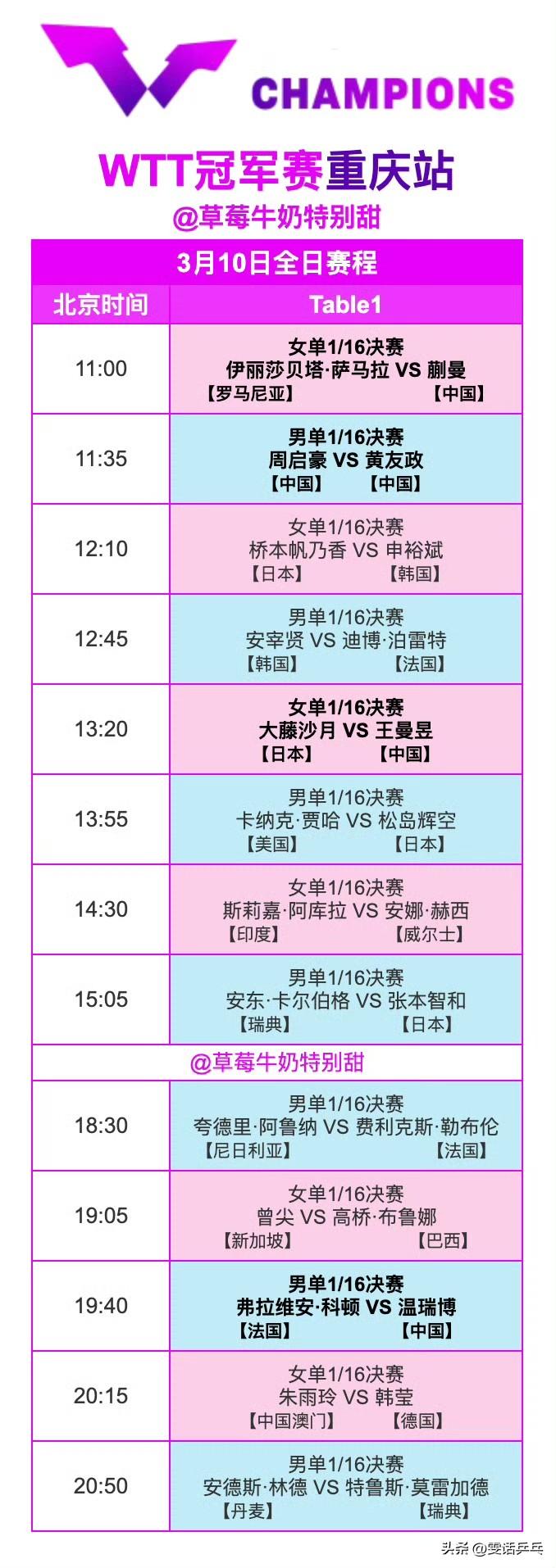 3月10日全日赛程P2 中国队赛程如下: 11:00 T1 蒯曼🇨🇳VS伊丽莎贝塔·萨马拉🇷🇴 11:35 T1 周启豪🇨🇳VS黄友政🇨🇳 13:20 T1 王曼昱🇨🇳VS大藤沙月🇯🇵 19:40 T1 温瑞博🇨🇳VS弗拉维安·科顿🇫🇷