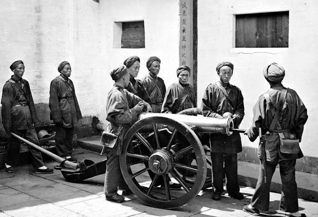 这张照片是1871年由英国摄影师约翰·汤姆逊在南京金陵机器制造局内拍摄的,8名清军炮兵,身着统一的短打制服,头裹布巾,腰间系着弹药袋,正合力操作一门火炮。他们操作的是一门金陵制造局生产的十二磅来福铜炮,这种线膛炮是当时较为先进的武器。 1865年,李鸿章在南京创办了金陵机器制造局,它是中国四大兵工厂之一,也是淮军的主要军火供应基地。金陵制造局聘用了英国工程师马格里,采用了当时先进的机器设备,能够批量生产火炮、步枪和弹药。照片中的火炮,就是该局早期的代表性产品。