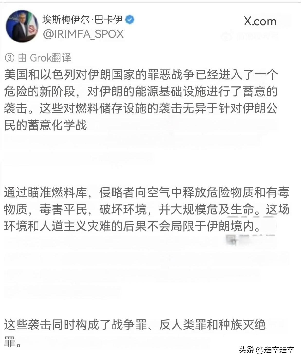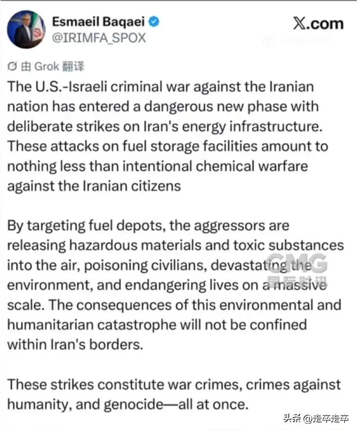 开始了吗?又有什么样的反击! 伊朗外交部发言人巴加埃于3月8日通过社交媒体公开谴责,称美国和以色列针对伊朗能源基础设施的袭击属于“蓄意的化学战争”。 的确美国和以色列针对伊朗能源基础设施是会导致燃油库中有害、有毒物质释放到空气中,直接毒害伊朗公民并破坏环境,构成大规模生命威胁。伊朗官方进一步将此次袭击定性为战争罪,蓄意攻击民用基础设施。大规模危害平民生命健康,系统性摧毁生存环境。 虽然关于“化武战”的指控是伊朗主要依据袭击燃油设施导致有毒物质扩散的逻辑,与传统化学武器使用性质不同,这是不是也代表了伊朗的一种态度?伊朗是《禁止化学武器公约》缔约国。但禁止化学武器组织 OPCW并未认定伊朗目前拥有化学武器库存。国际组织报告证实,两伊战争期间(1980-1988年),伊拉克军队在萨达姆政权指挥下,大规模使用了芥子气、塔崩毒气等化学武器攻击伊朗军队及本国库尔德平民。而伊朗使用化武反击目前缺乏权威信源证实,主流观点认为伊朗主要是受害者。 美国“利用矛盾、制造混乱、最终收割”的霸权本质这是在制造核打击的国际舆论。而伊朗在这个阶段面对可能的地面入侵说出这话,也是给美军上了眼药。